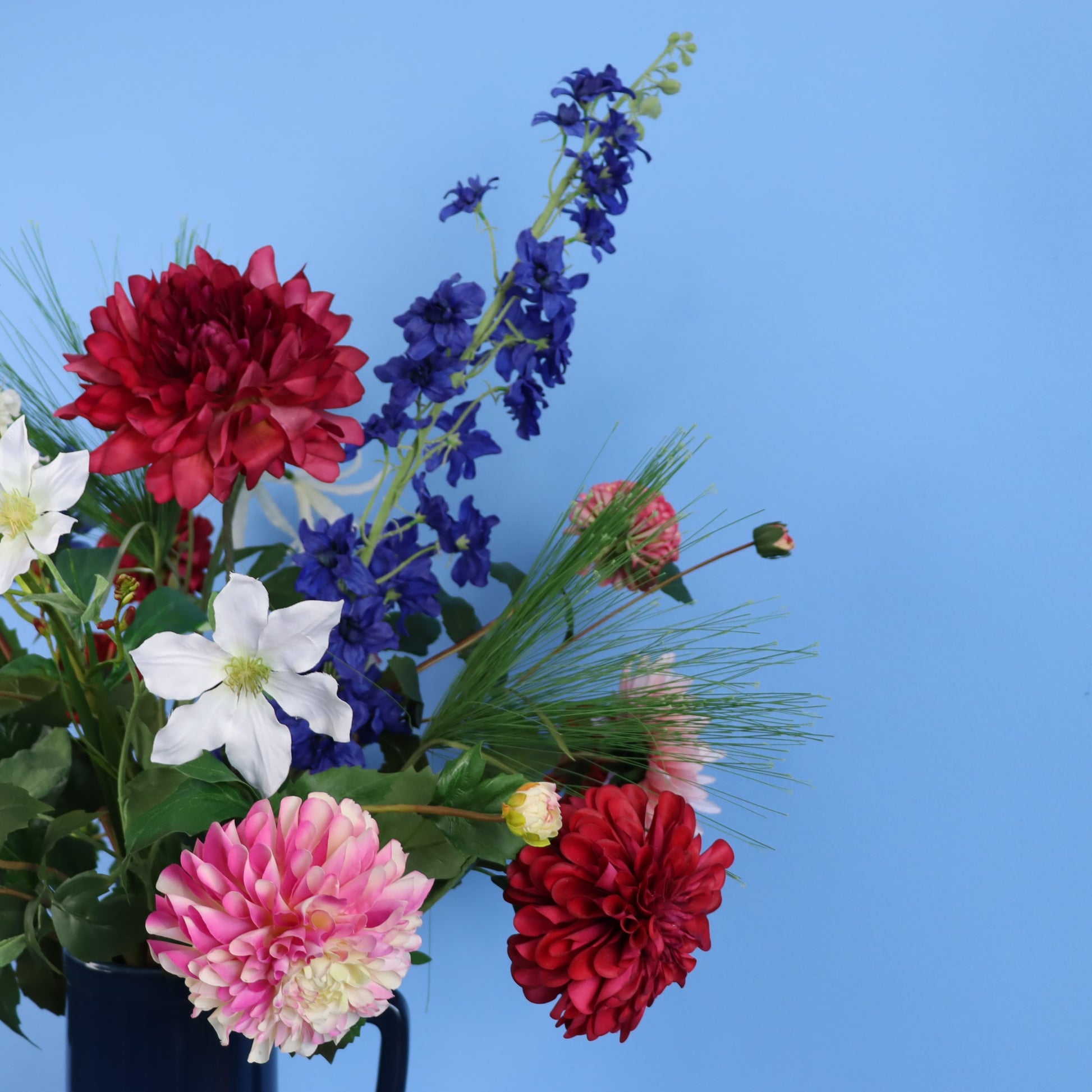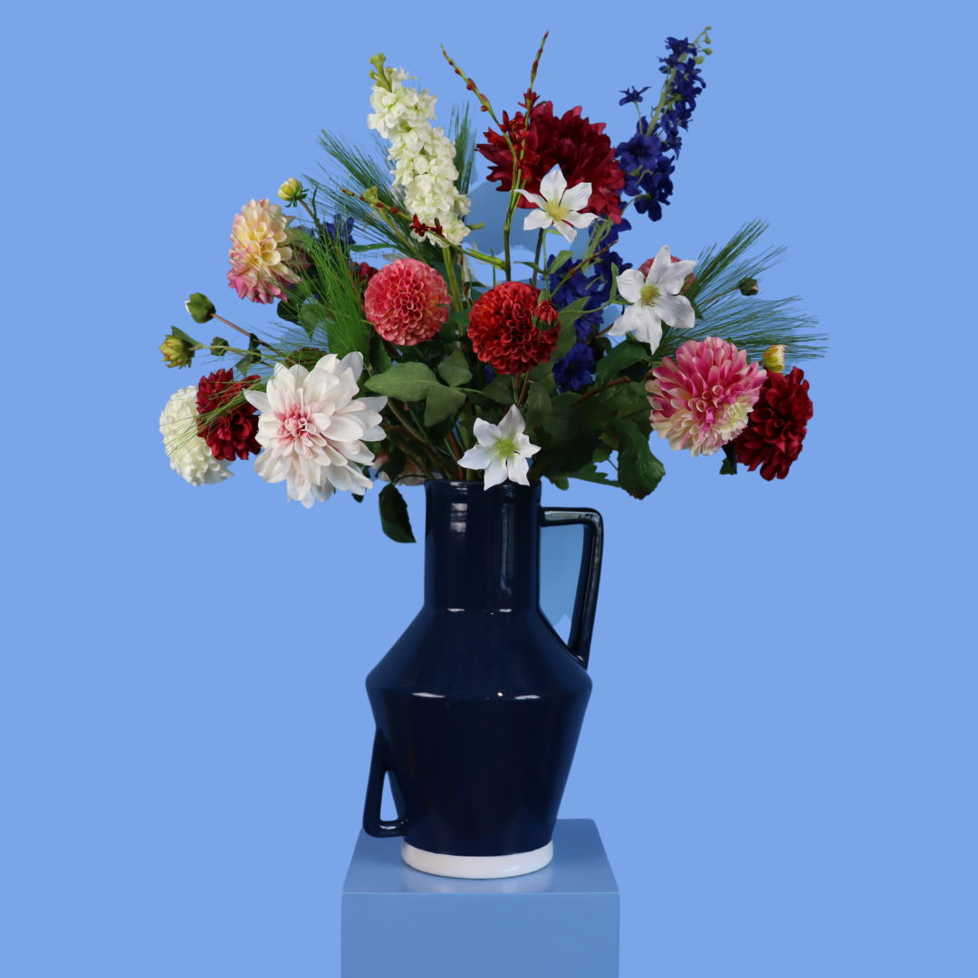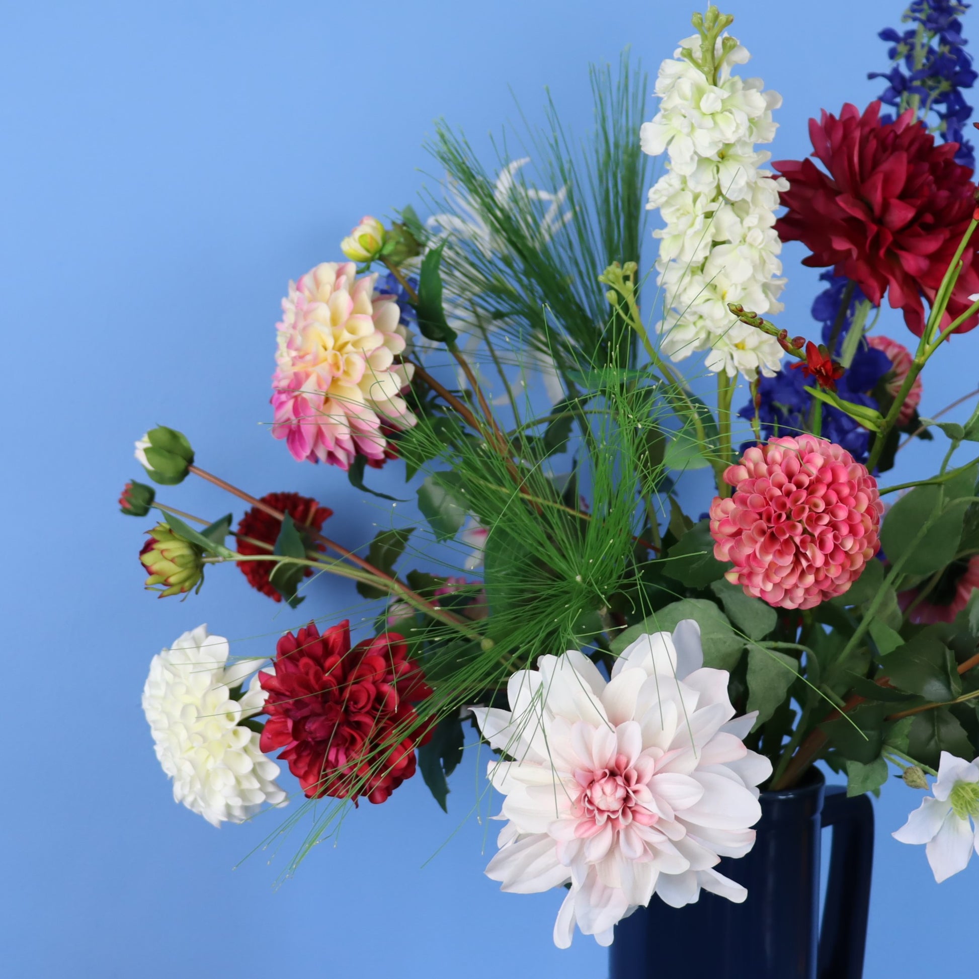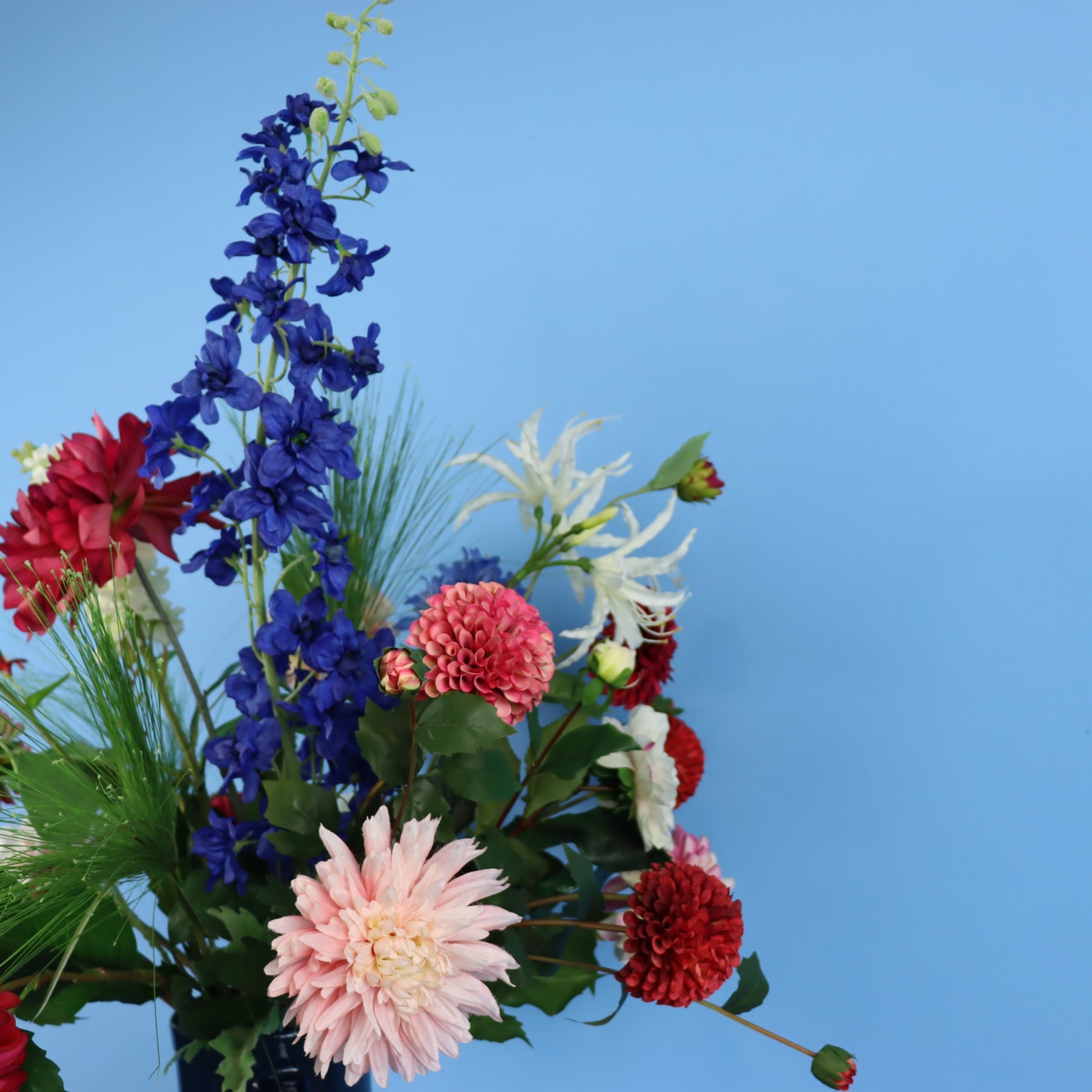 Prachtige blauwe kleur Return to sender vaas met dahlia's en ridderspoor.