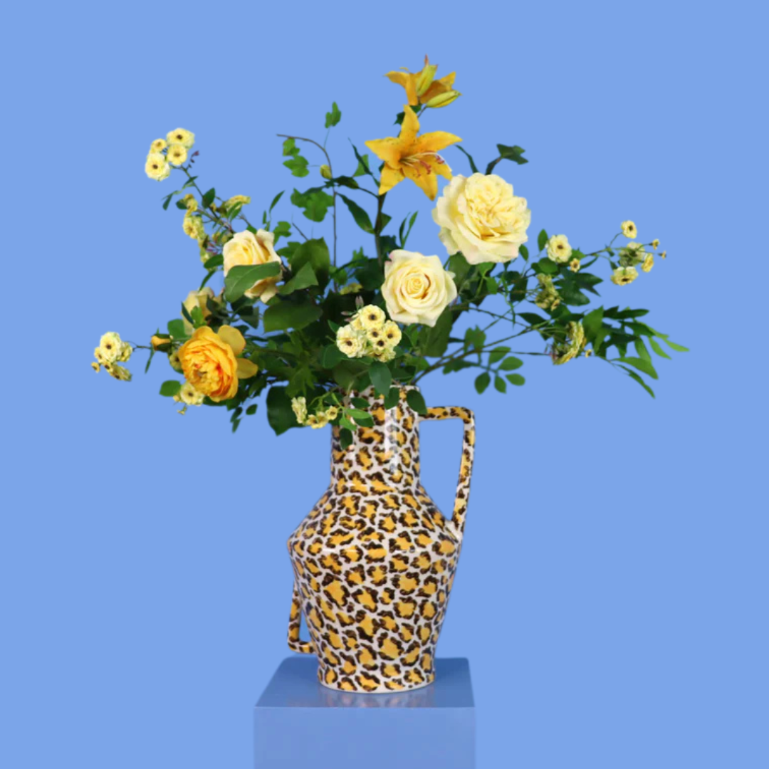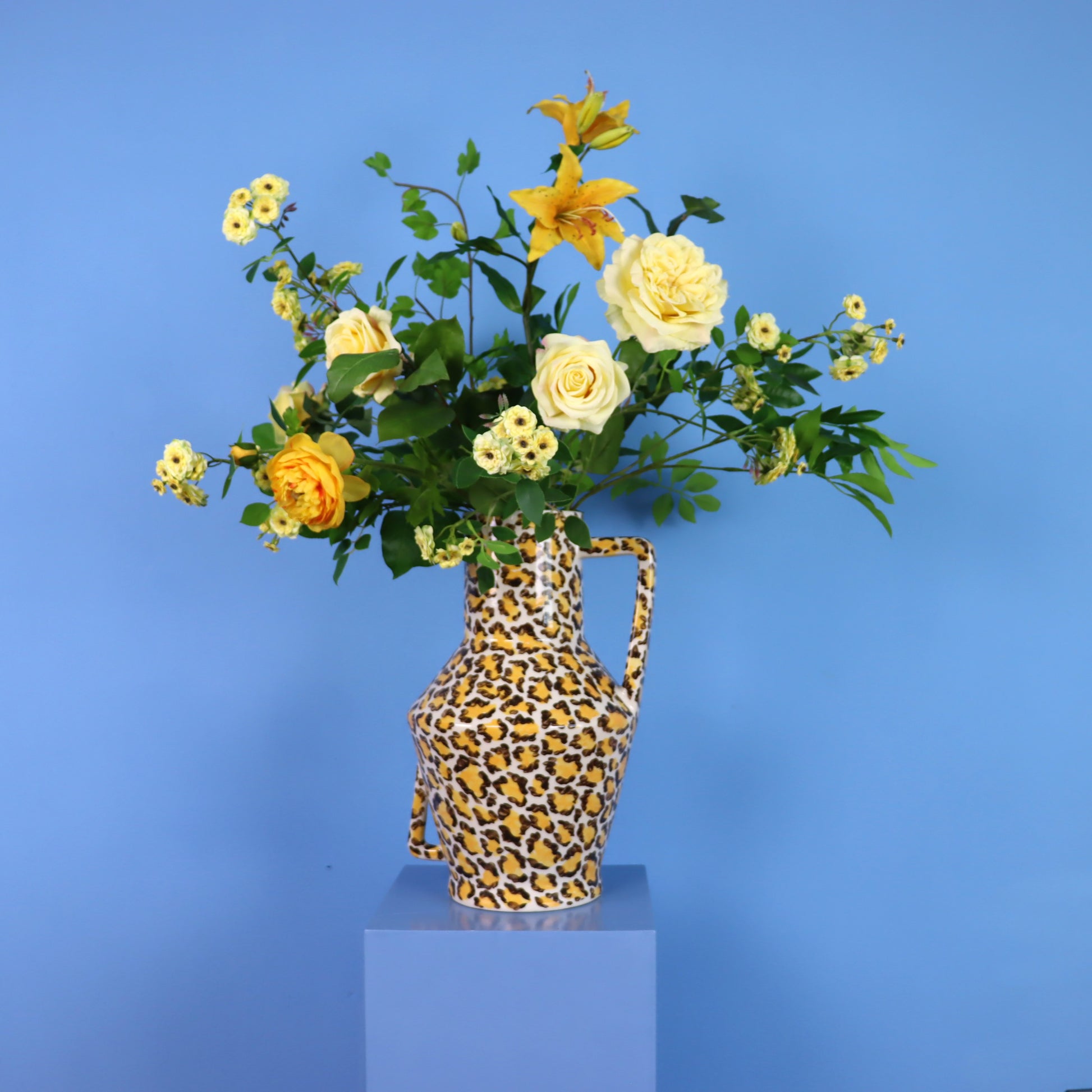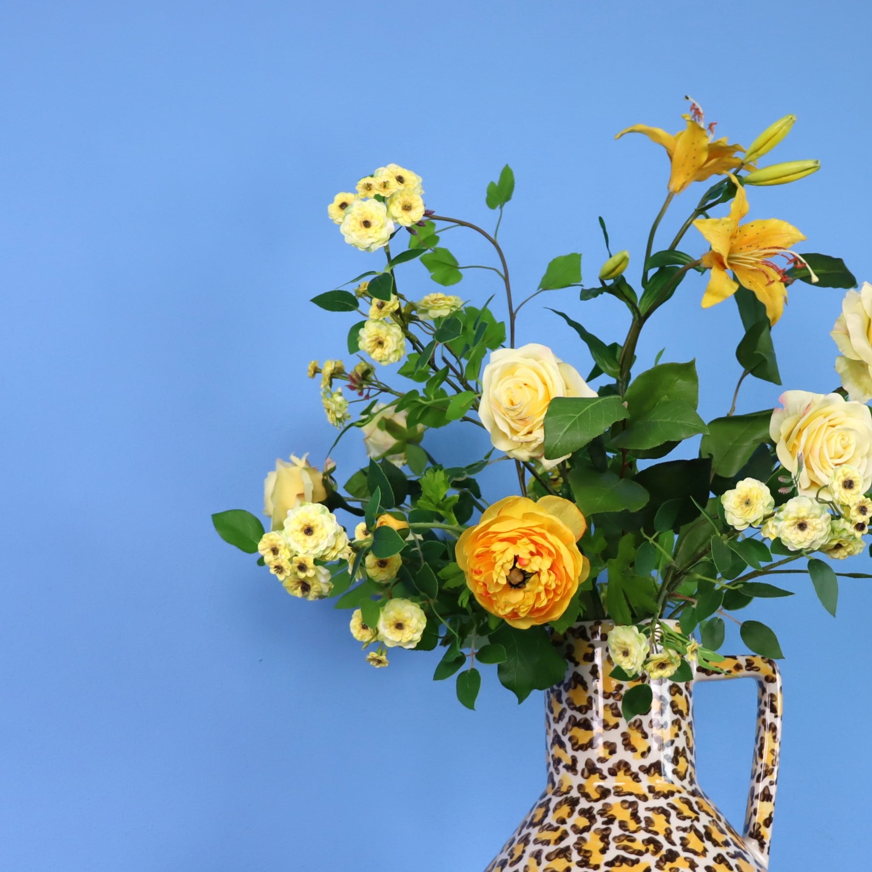 Prachtige handbeschilderde Return to Sender vaas met blijvende bloemen in geel en wit.