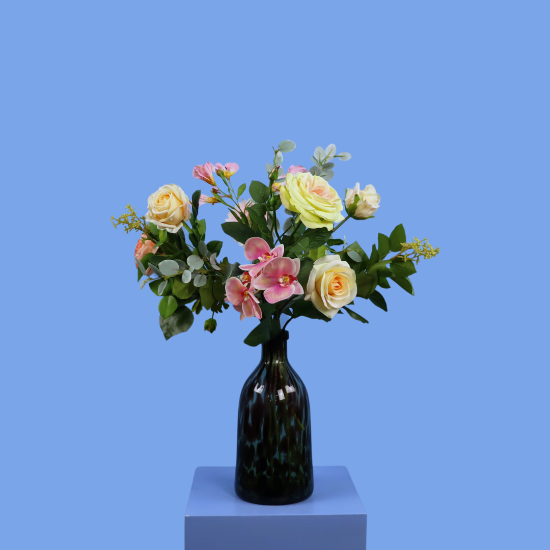 Moderne vaas met een enige bos bloemen. Dit boeket past vooral goed op kleinere plaatsen, zoals een bijzettafel of plank.