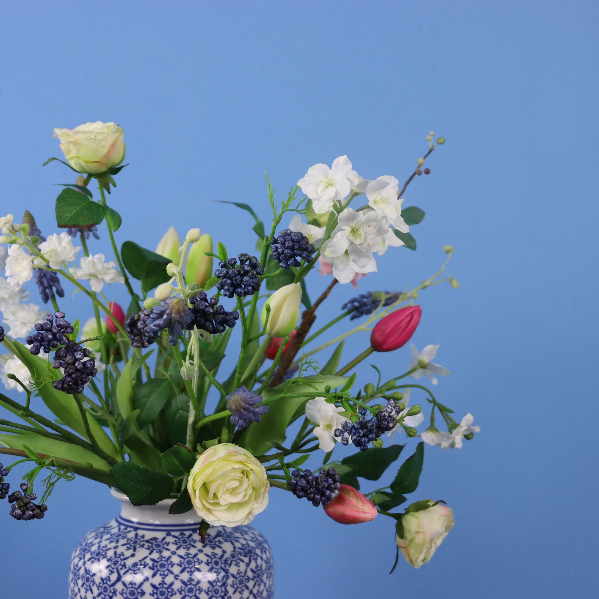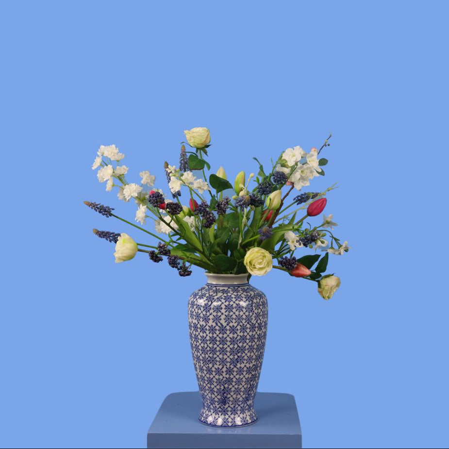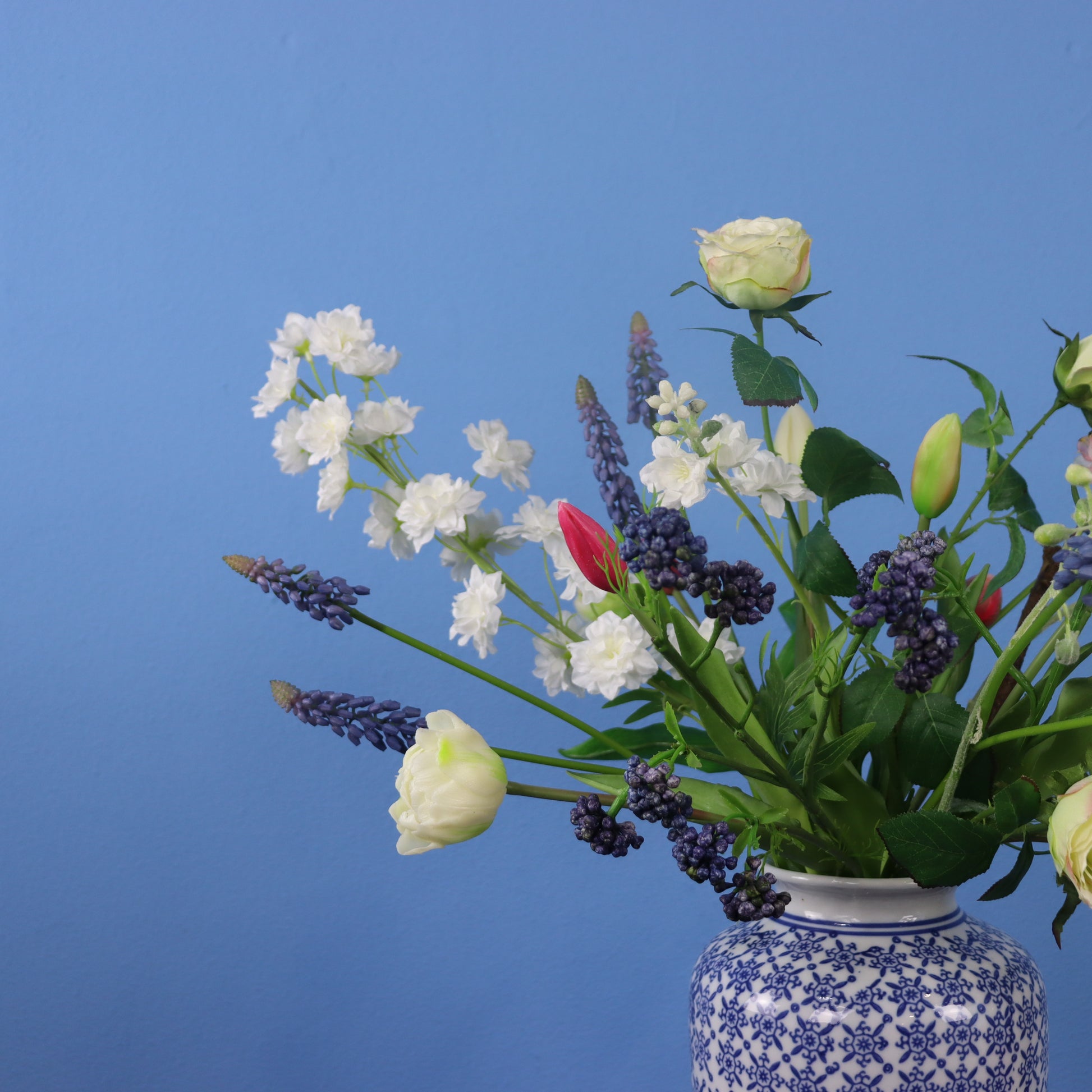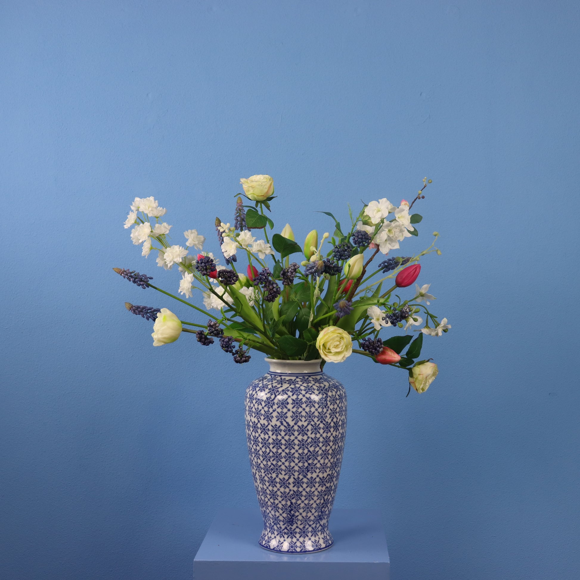 Delfts blauwe Kersten vaas met oranje en paarse bloemen.