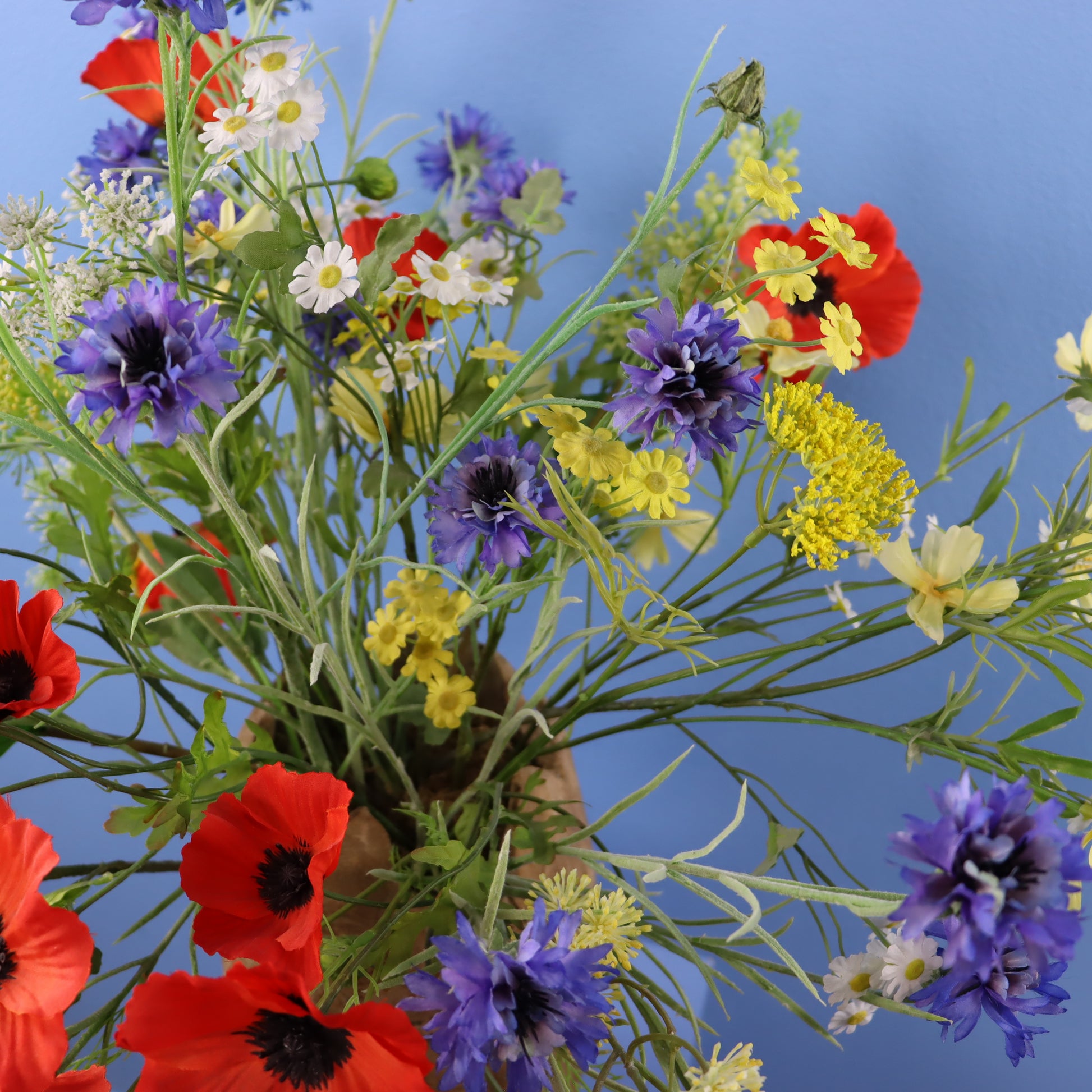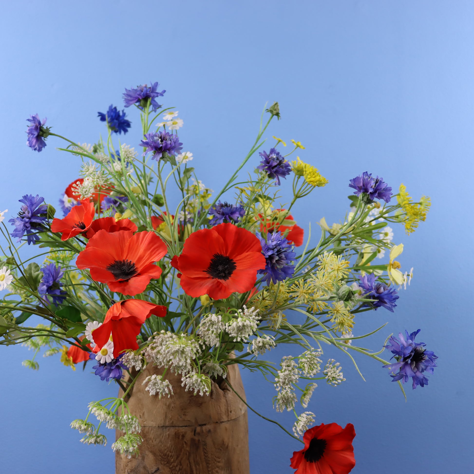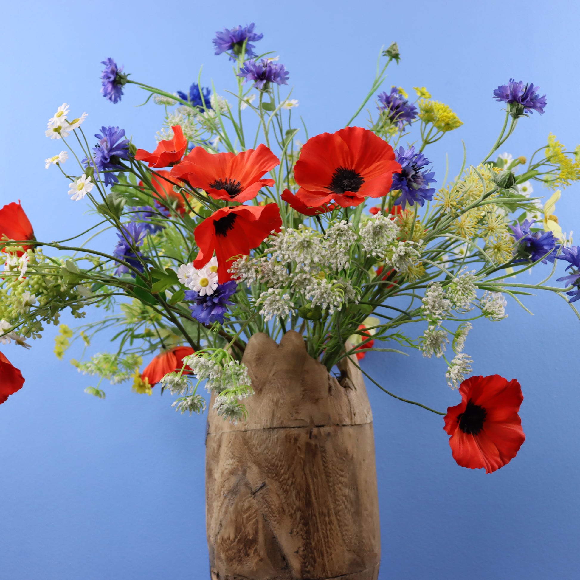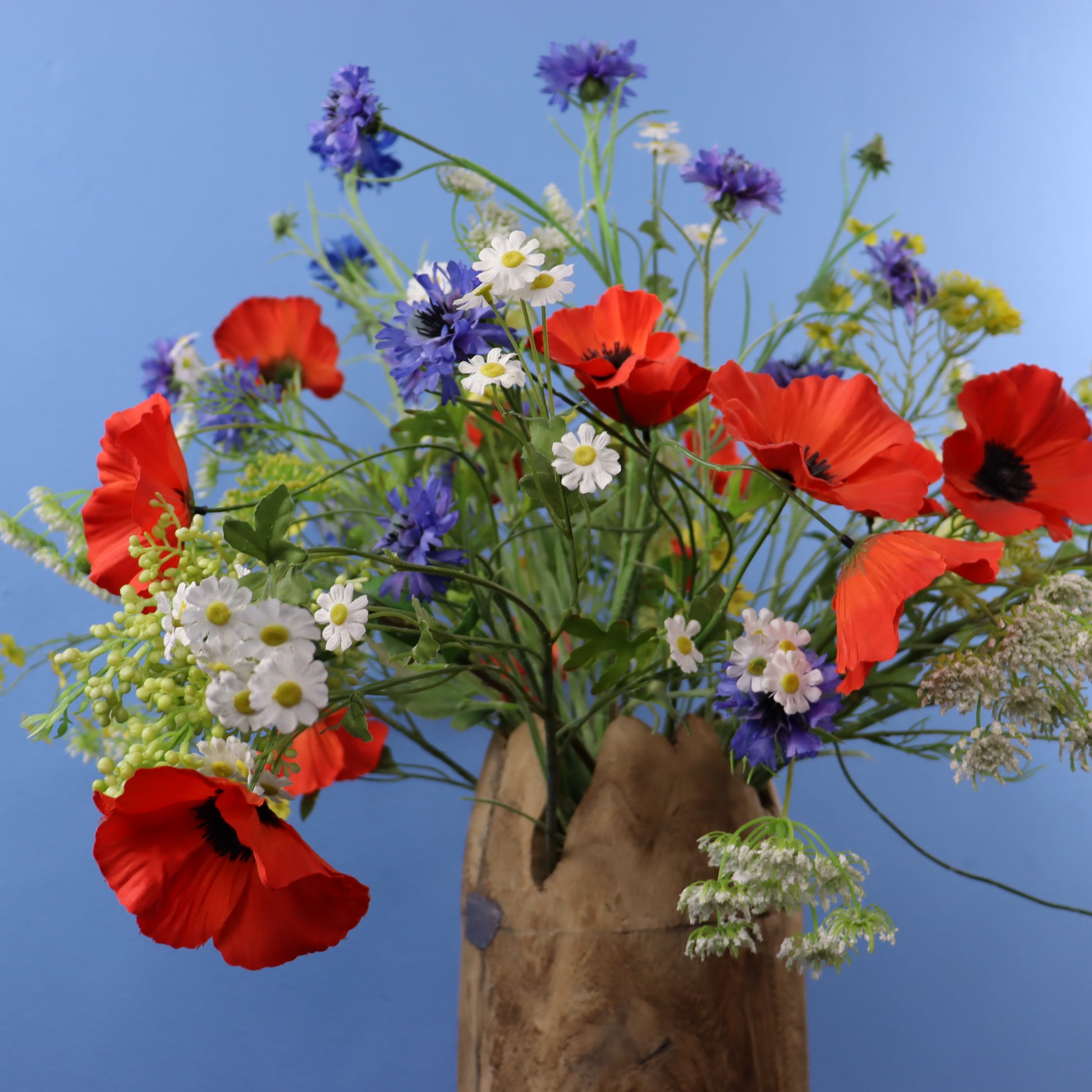Deze prachtige houten vaas is gevuld met een vol veldboeket met bloemen zoals klaprozen, korenbloem en enige madeliefjes.