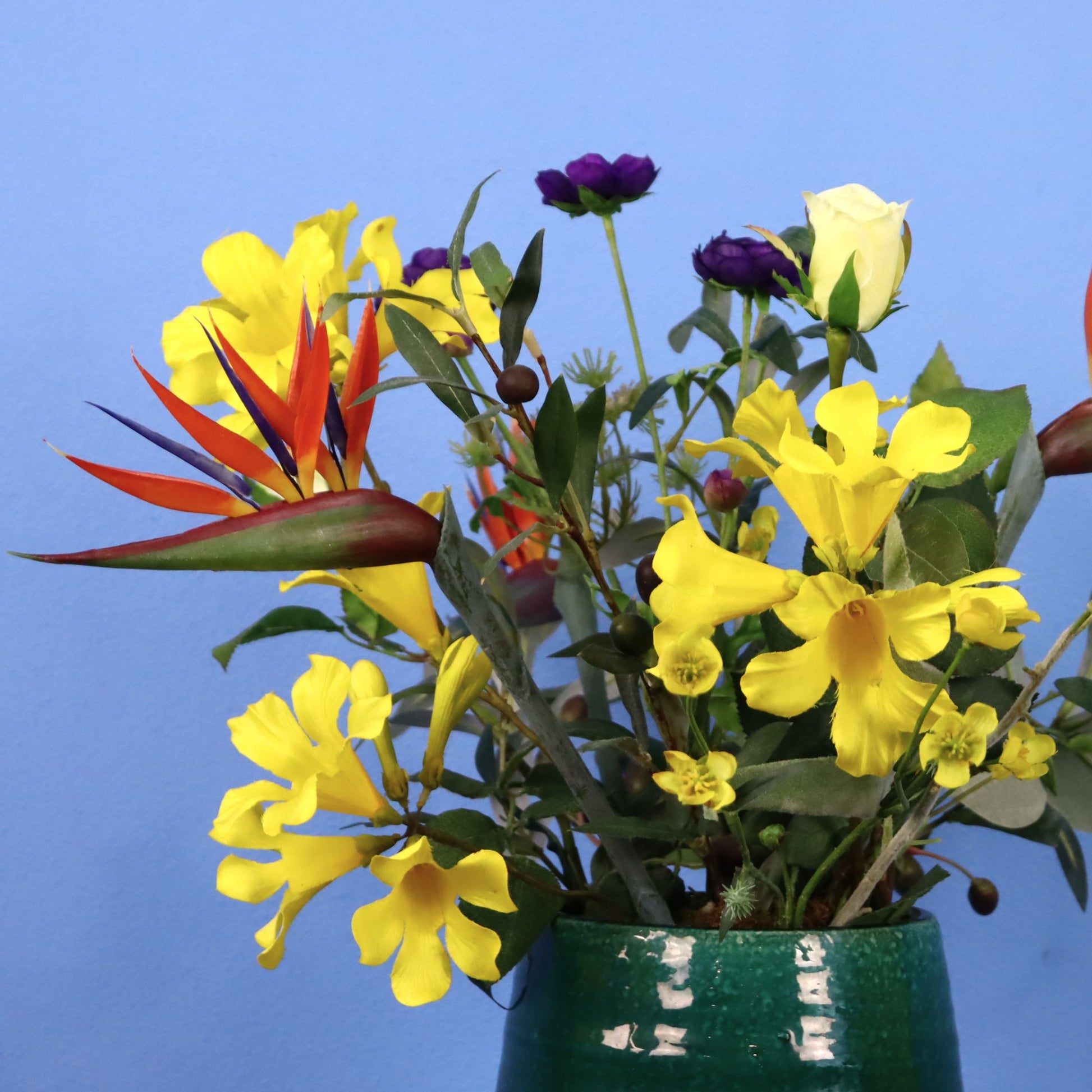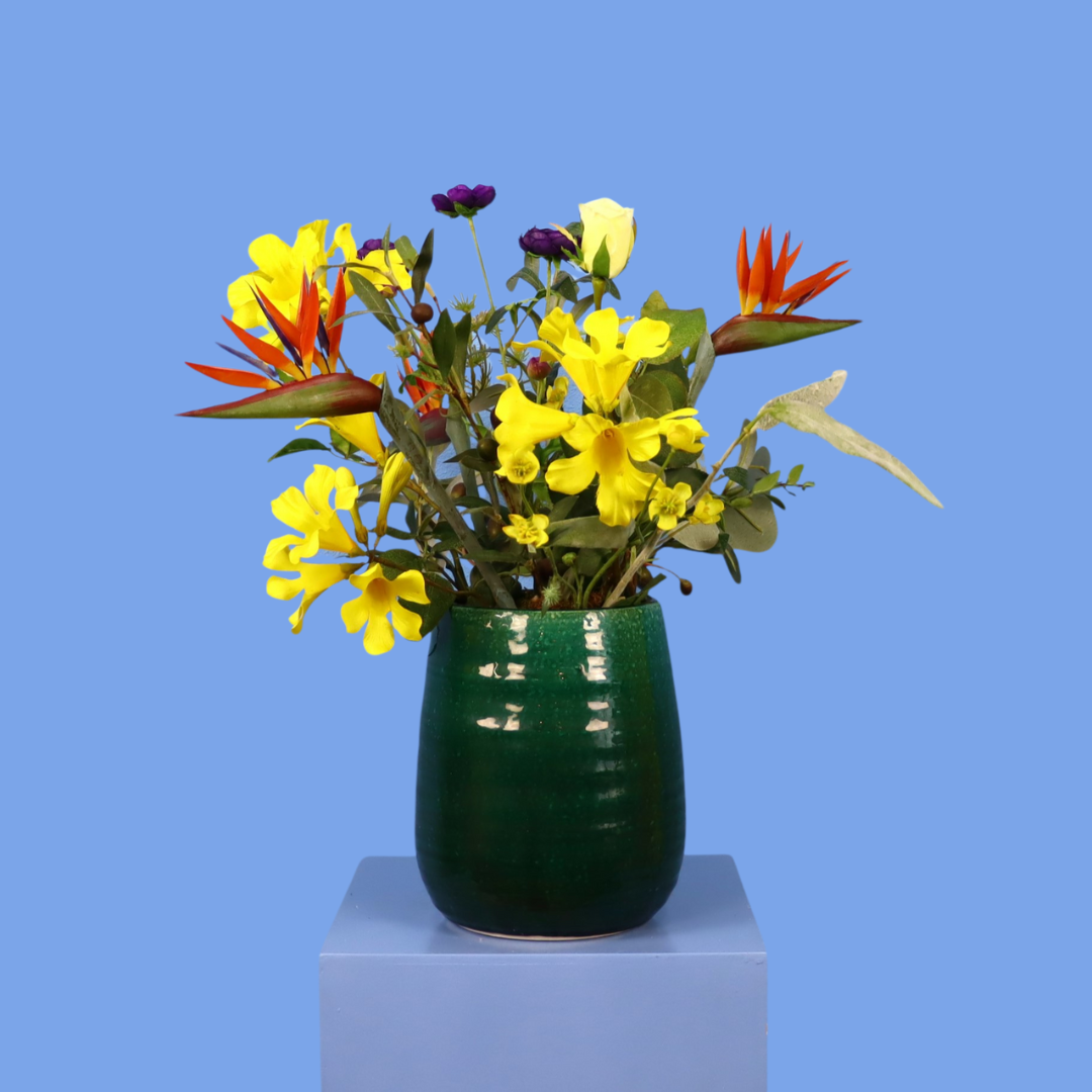 Groene vaas van designerbrand Serax met een geel boeket.