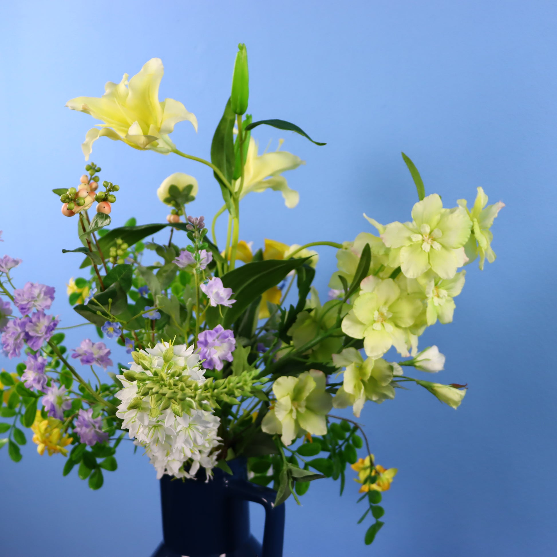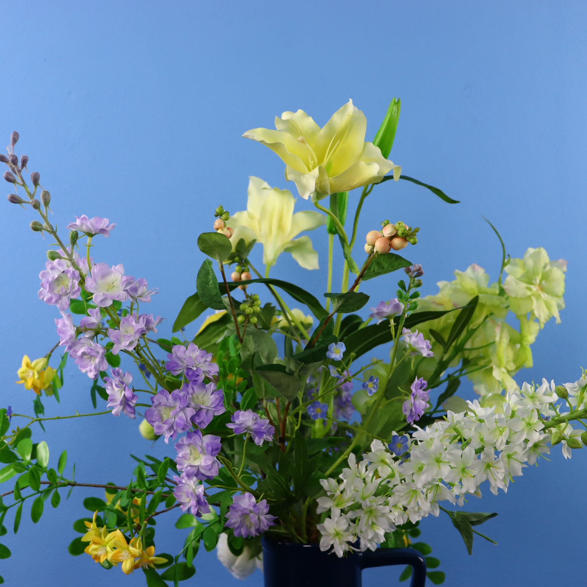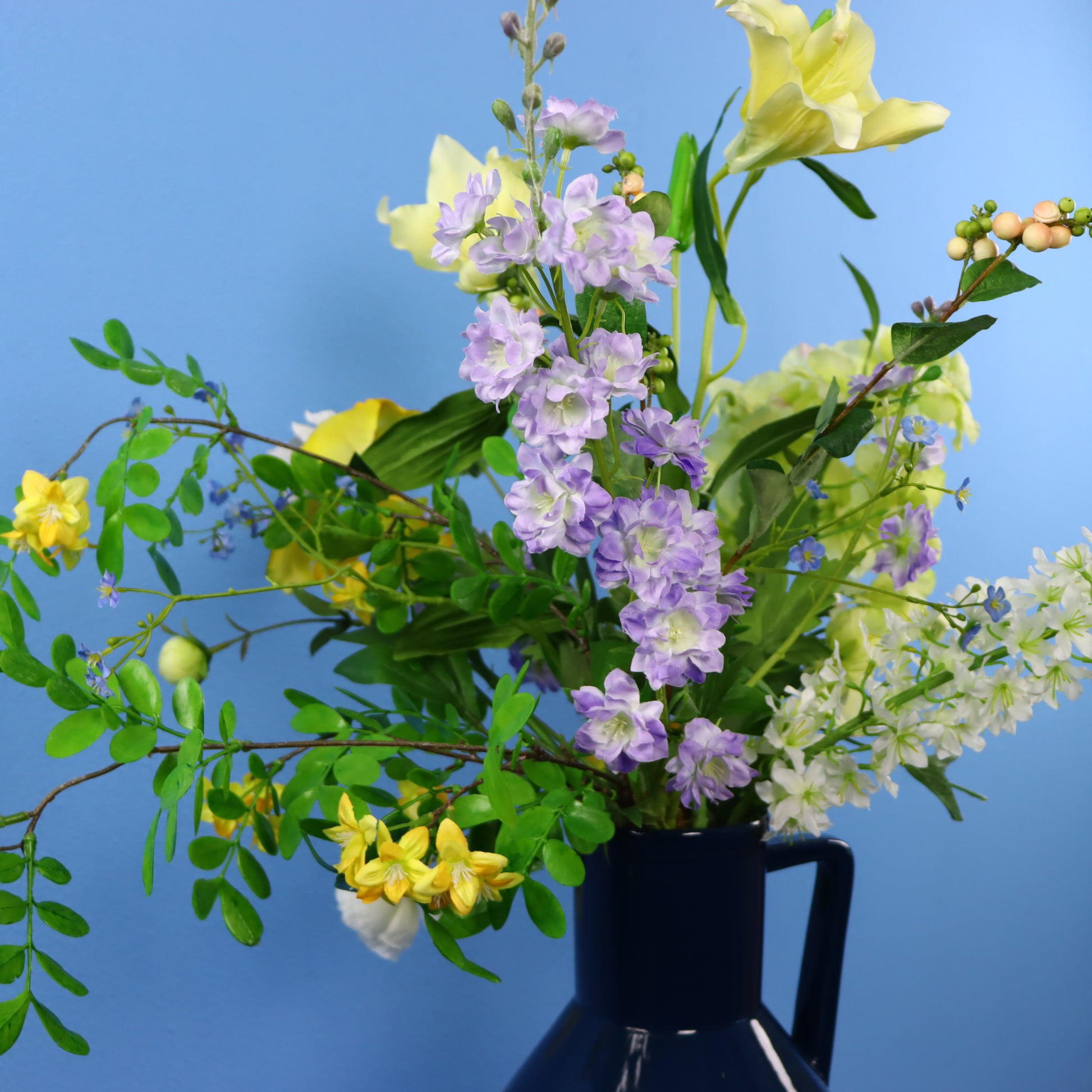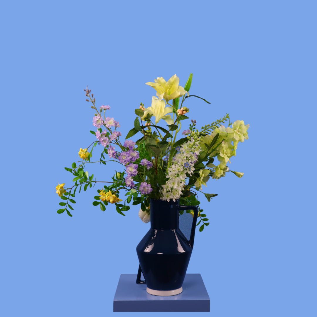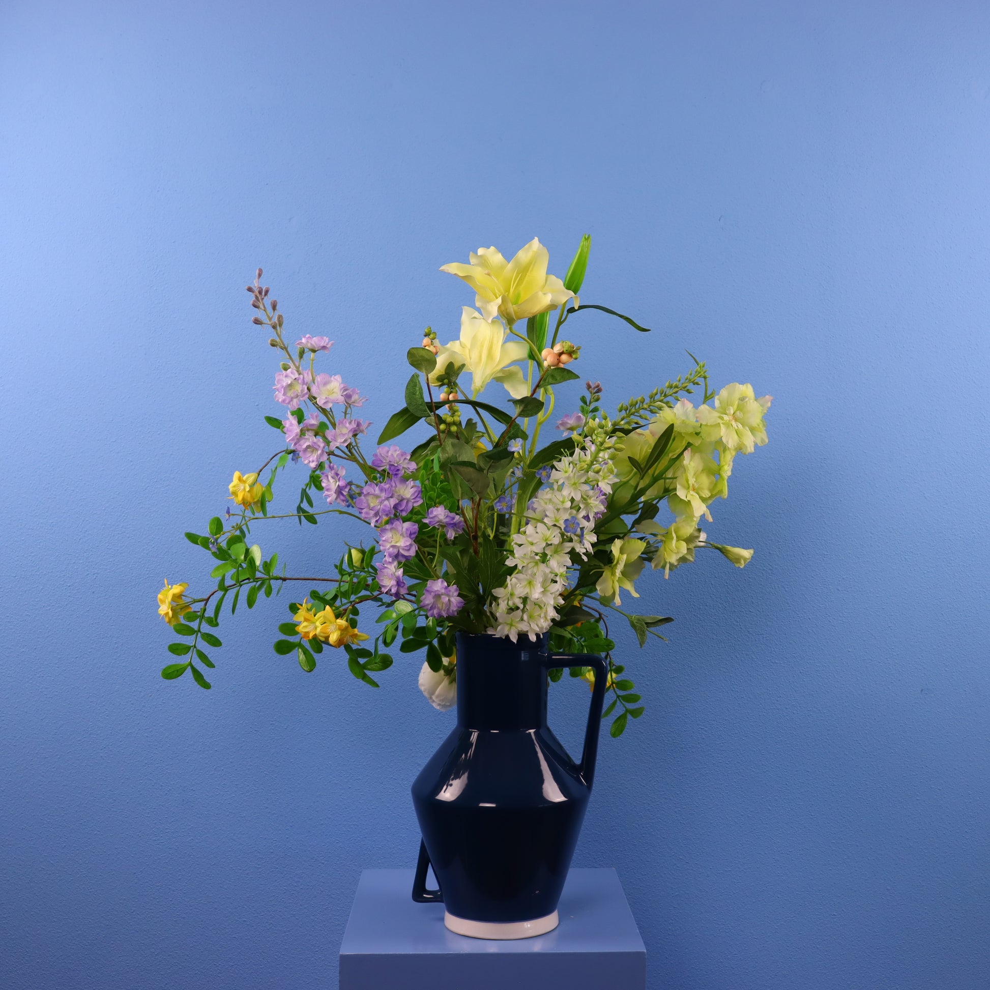 Prachtige donkerblauwe Return to Sender vaas met blijvende bloemen in lila en geel en is aangevuld met groen.