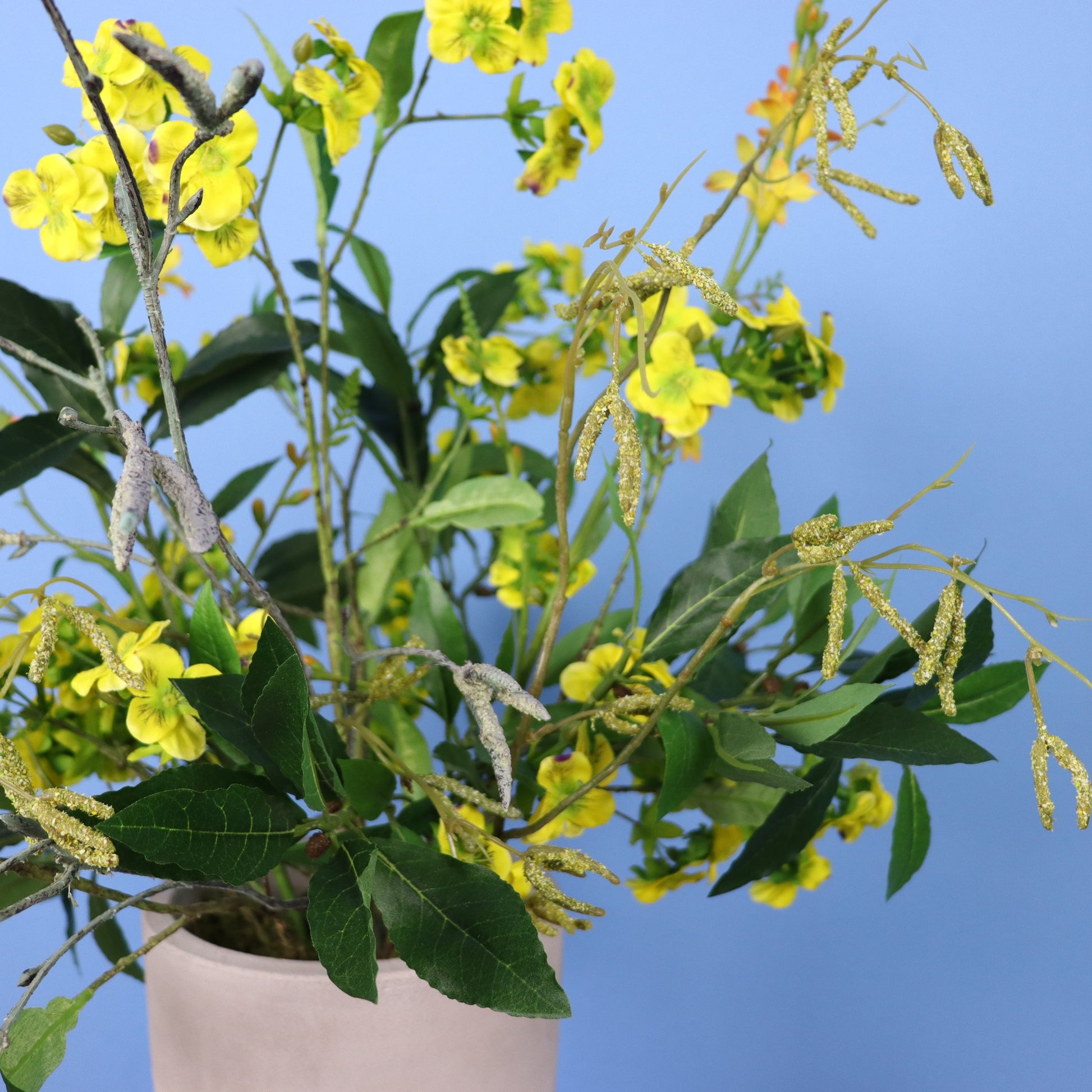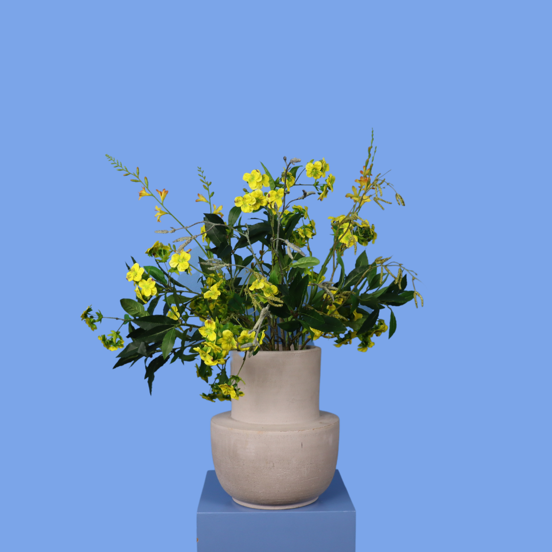 Deze prachtige betonnen piet boon vaas met vrolijk geel boeket.