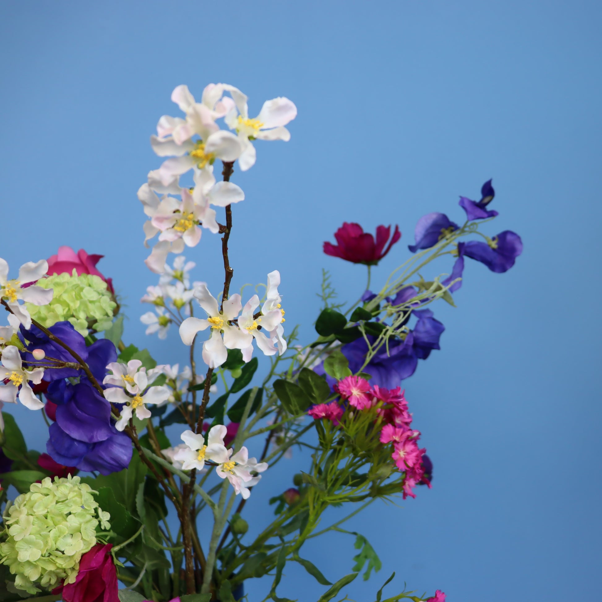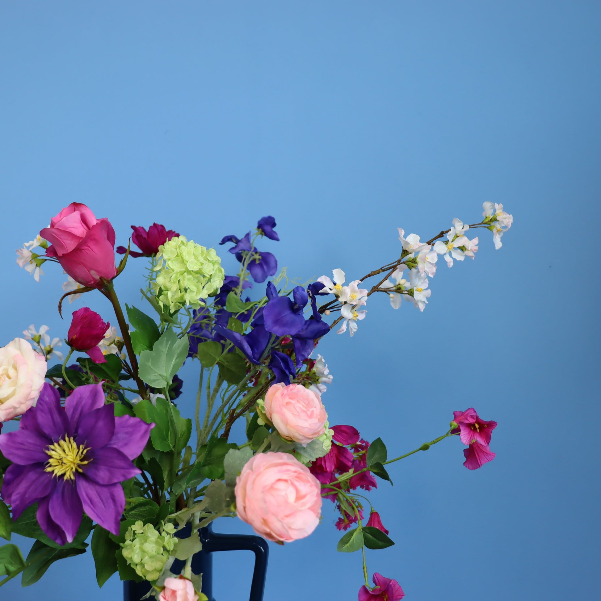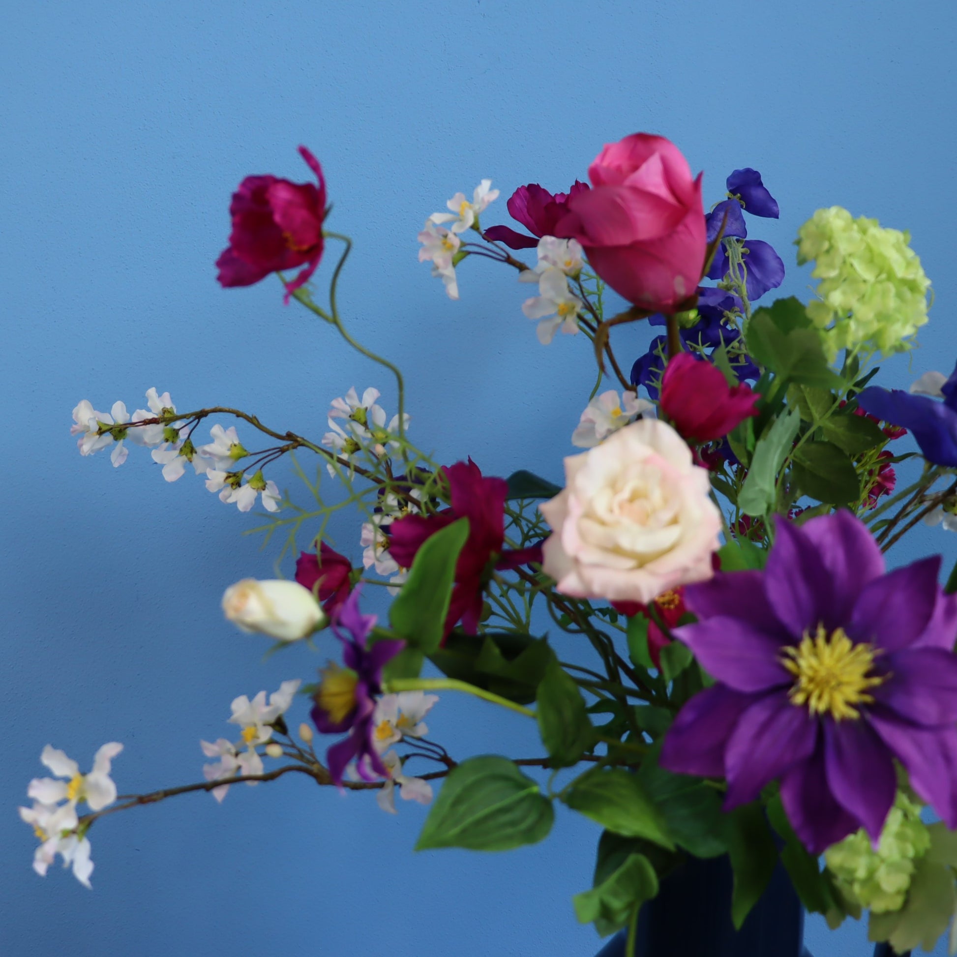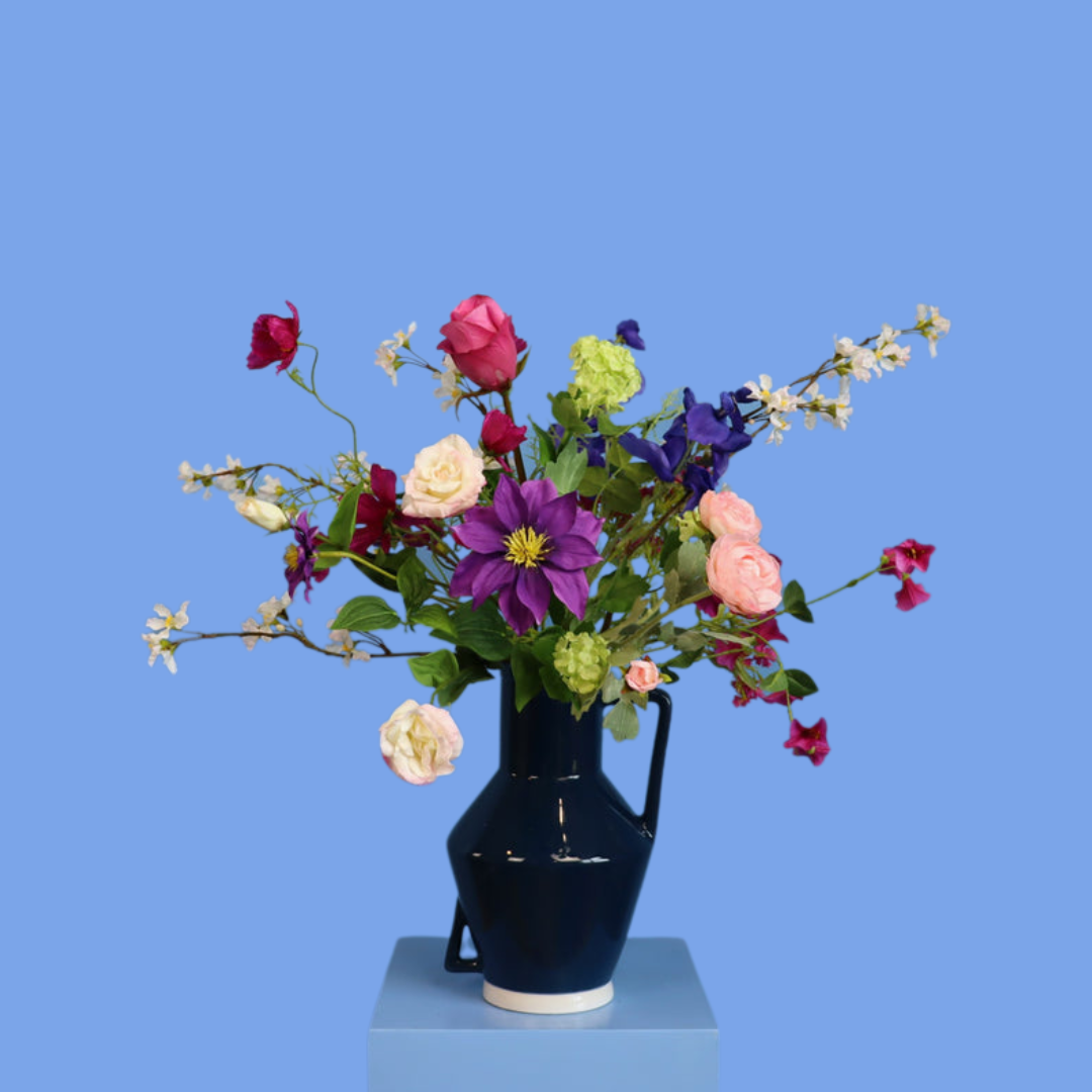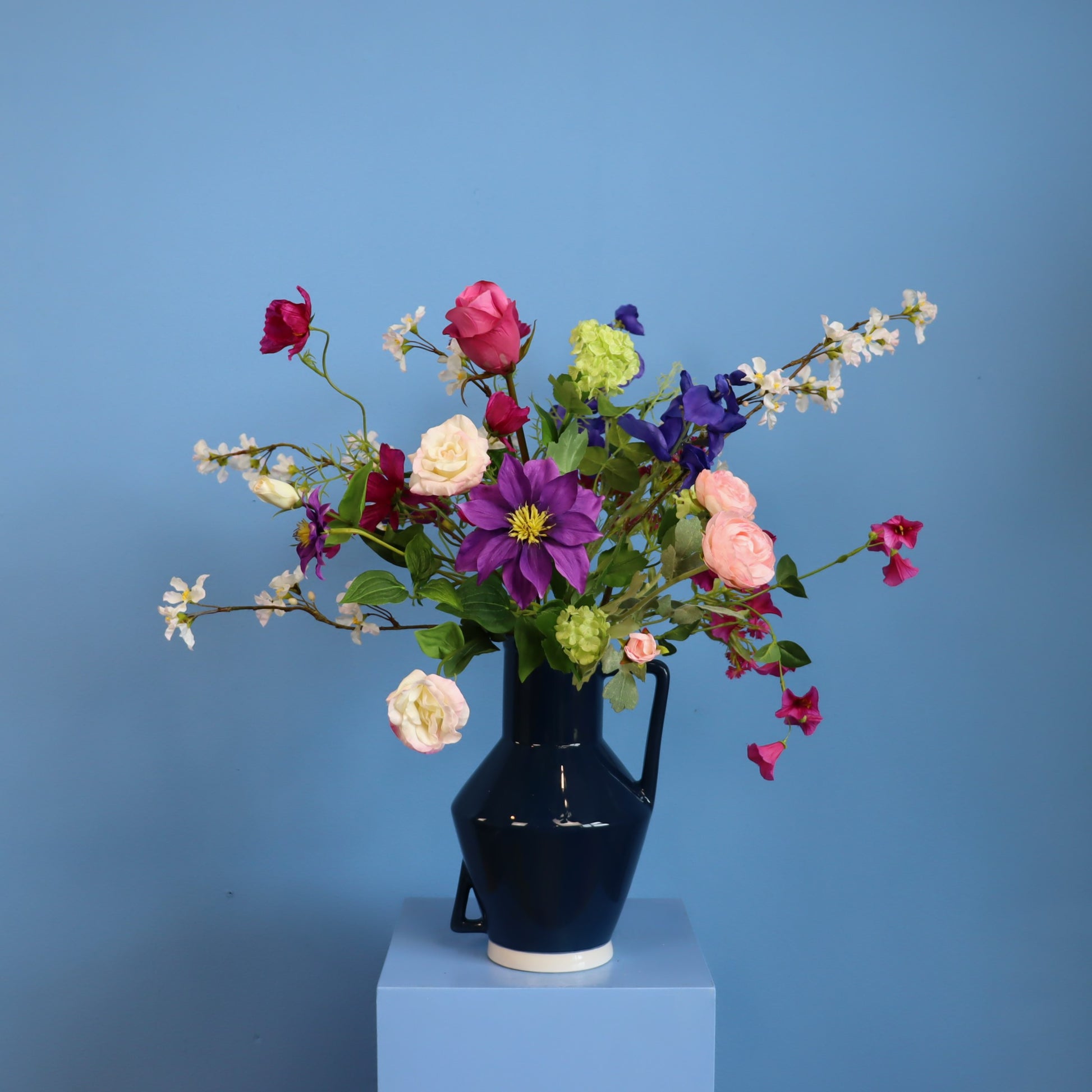 Prachtige donkerblauwe Return to Sender vaas met blijvende bloemen mix.