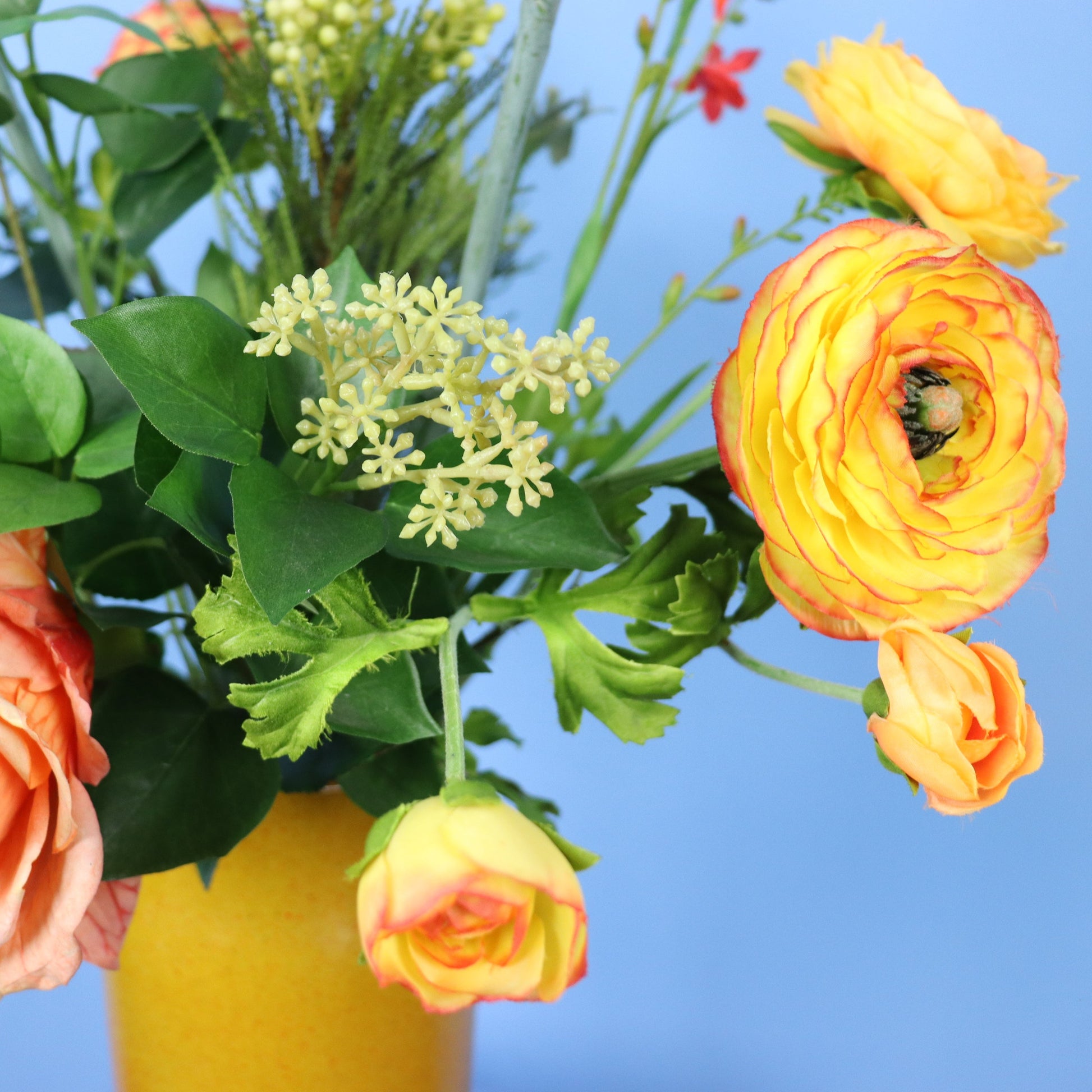 Mosterd-kleurige designvaas van Serax vaas met een oranje boeket.