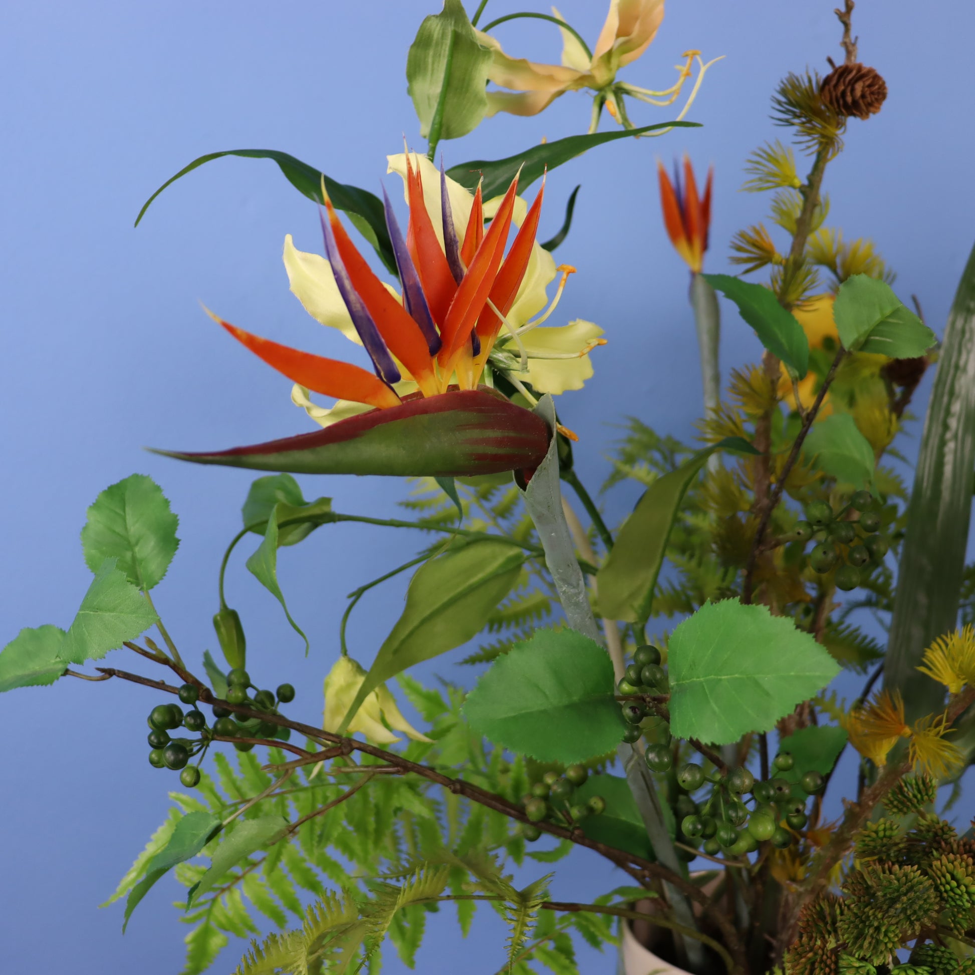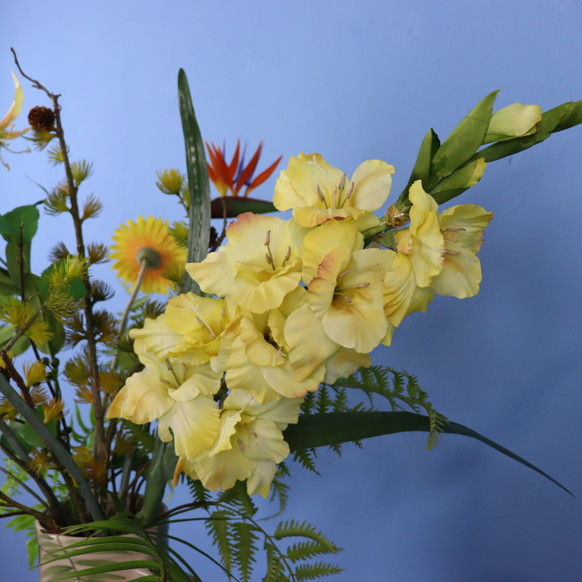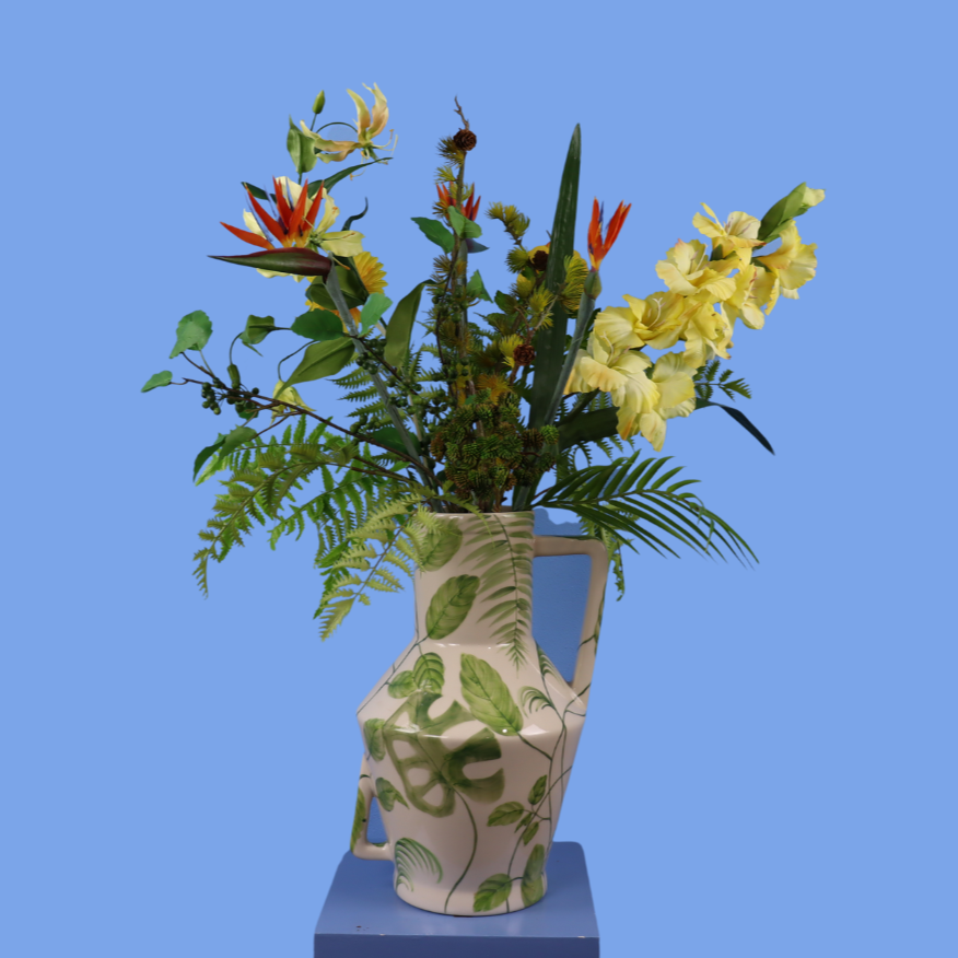 Met de hand beschilderde Return to Sender vaas met veel groen en heeft geel en oranje bloemen.
