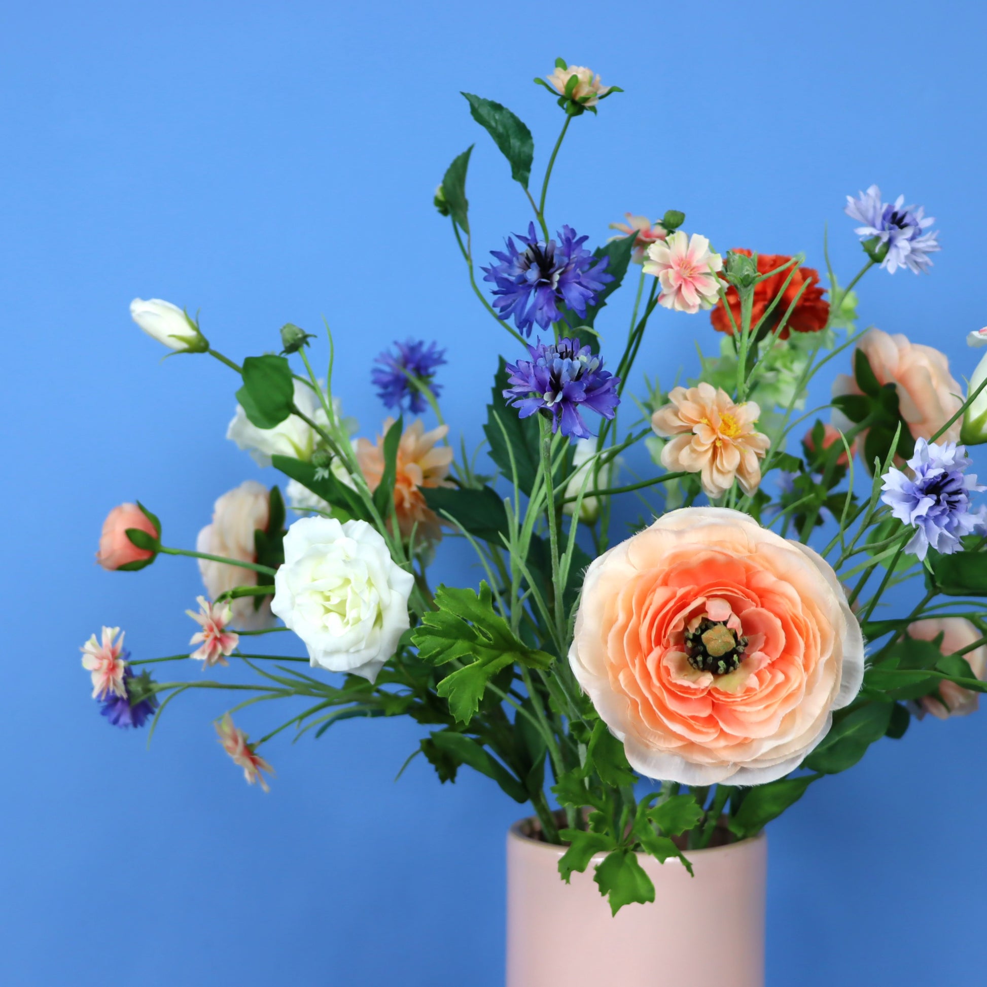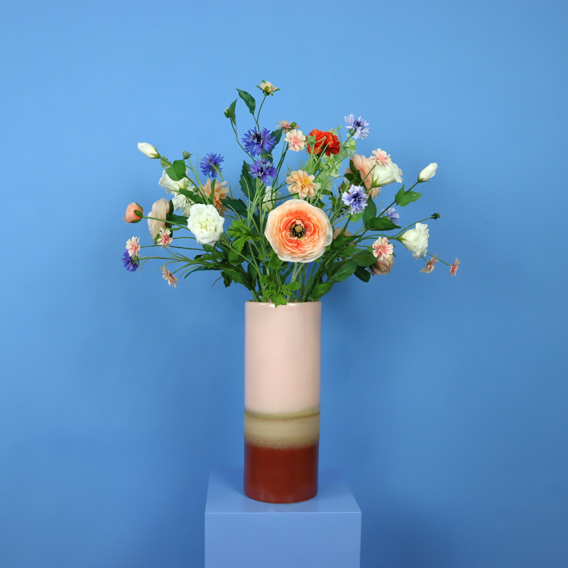 Hoge Pols Potten vaas in roze met bijkleurende blijvende bloemen.