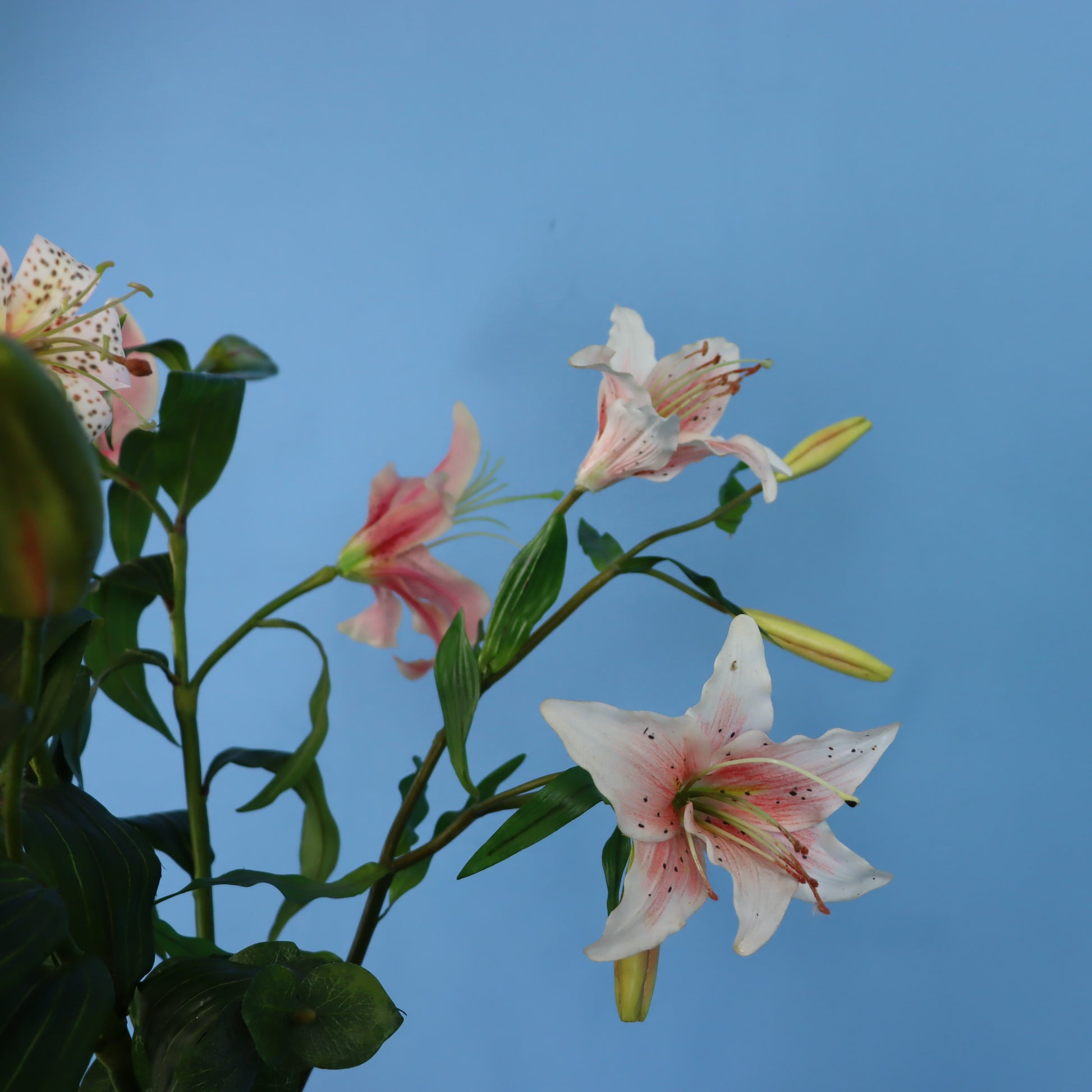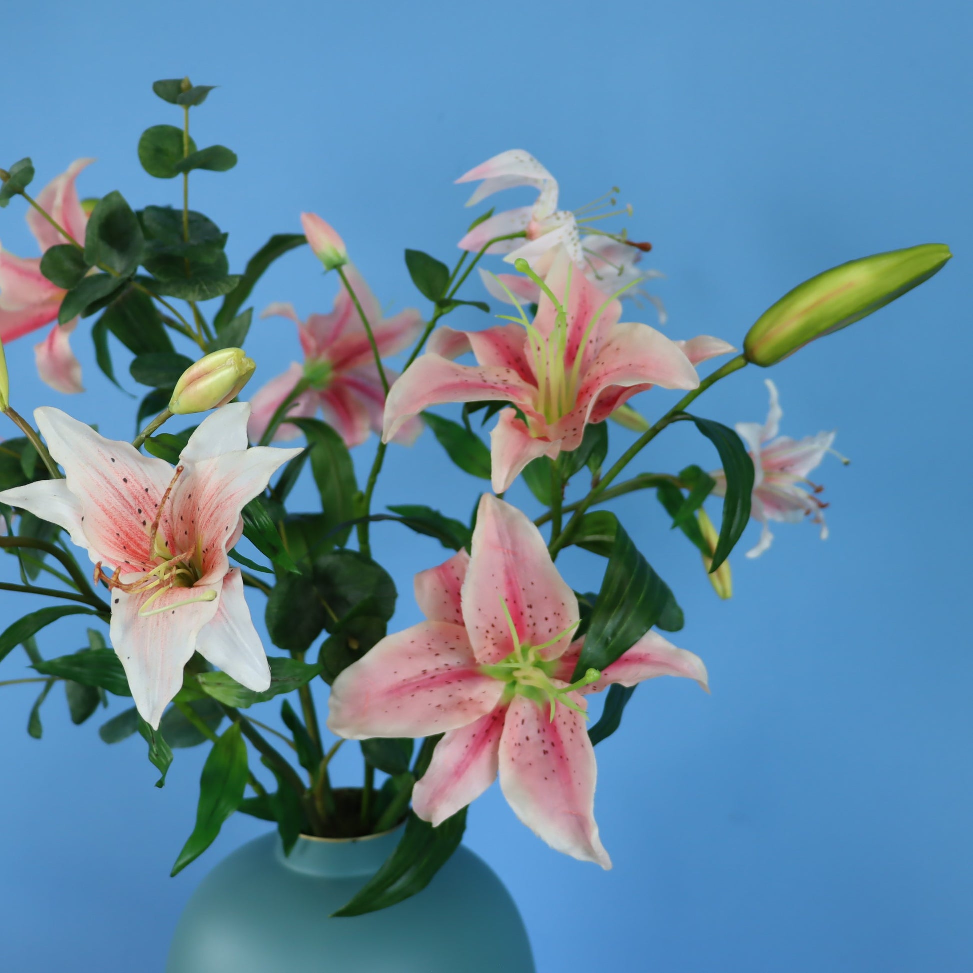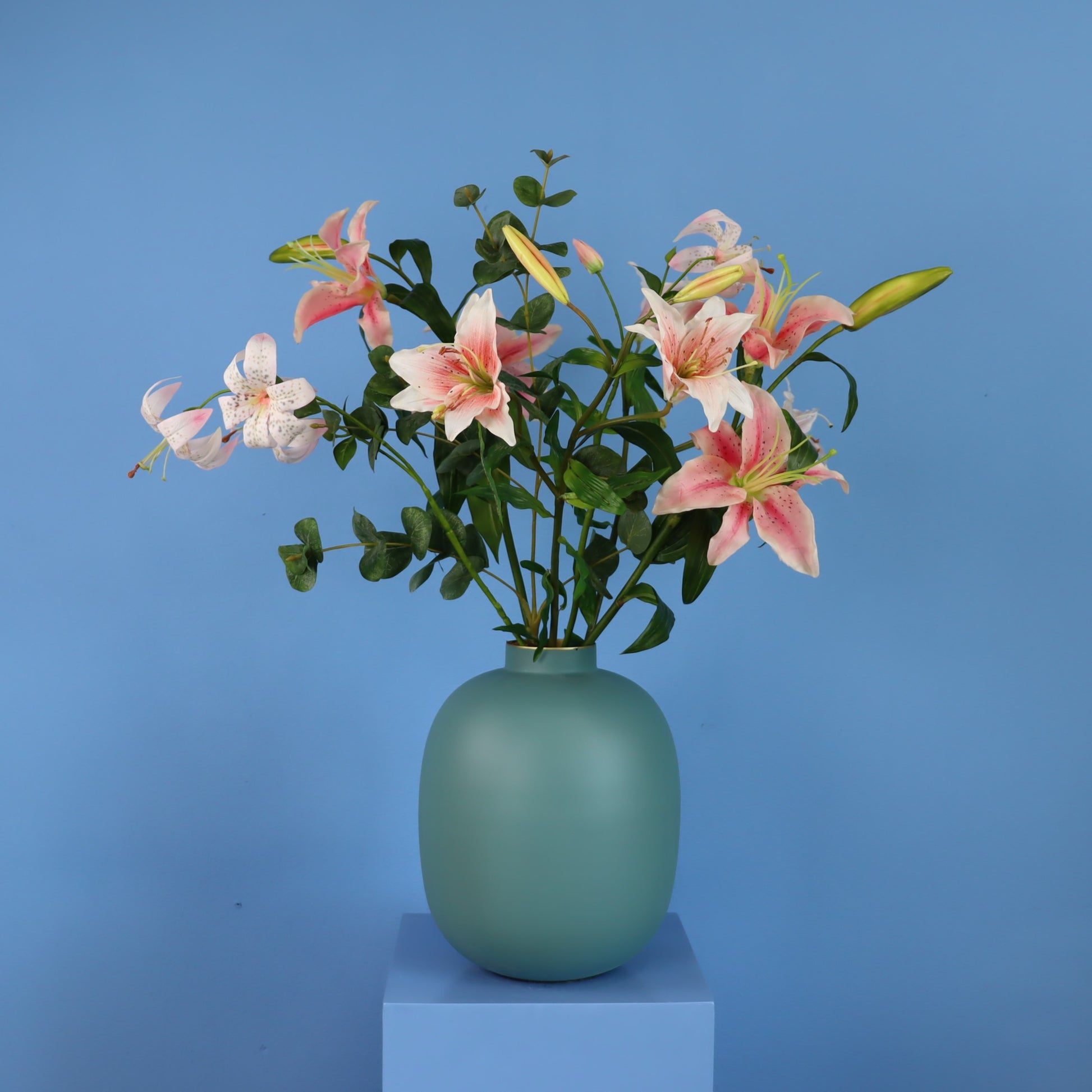 Pip Studio vaas met lelie's. Dit is een leuke kleuren combinatie, turquoise vaas met lichtroze bloemen.