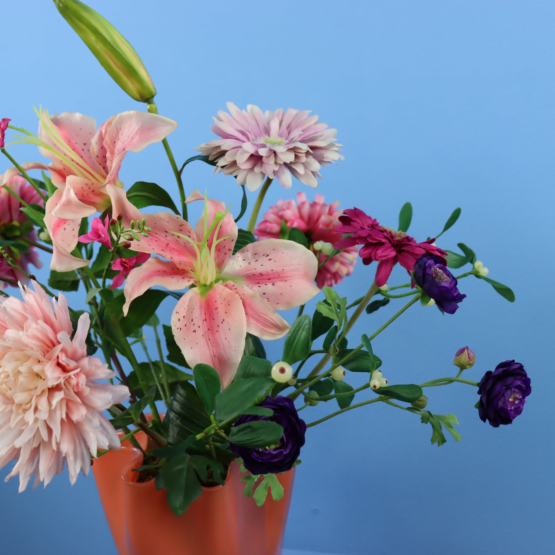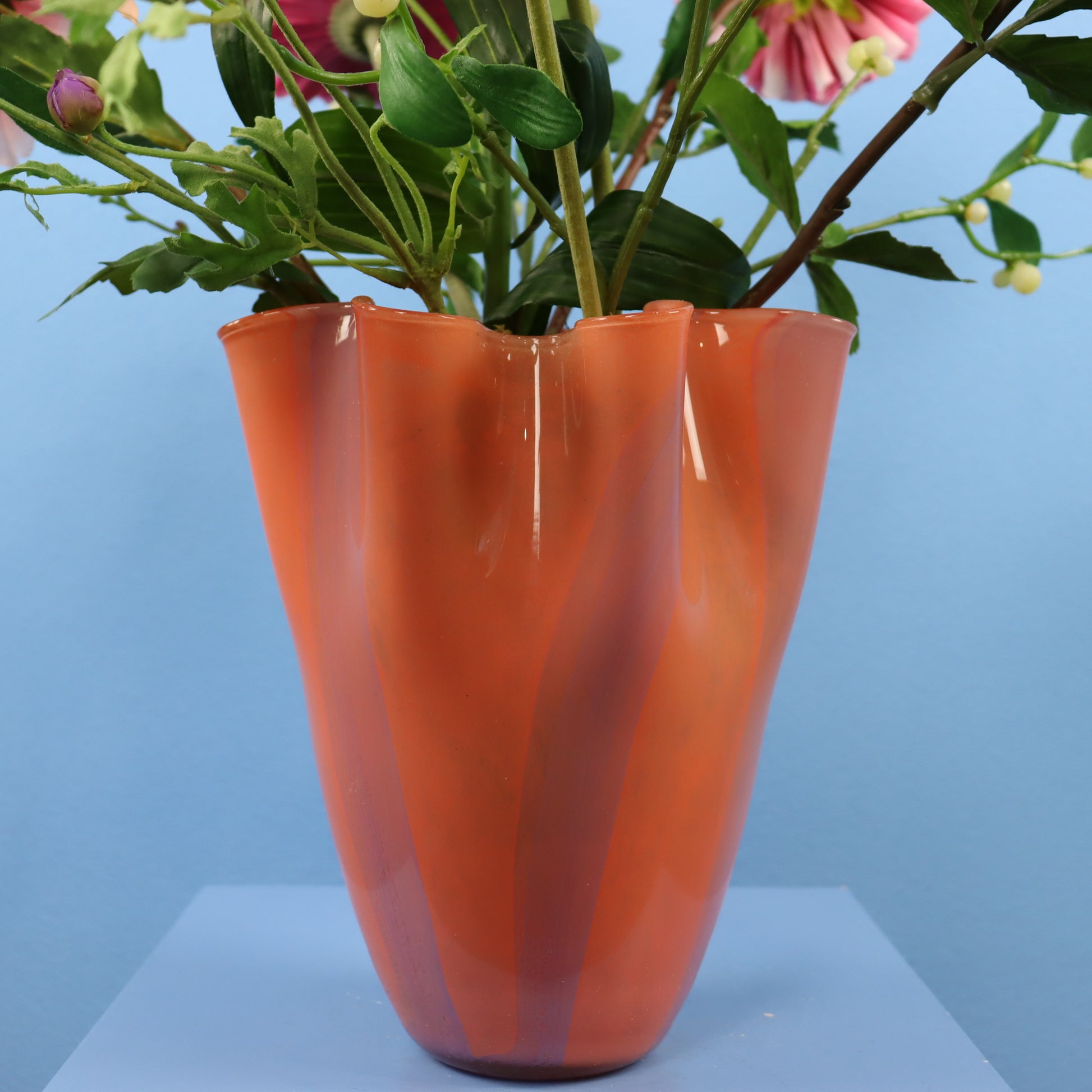 Vaas met gegolfde rand (zakdoekvaas) met een bijpassende bos blijvende bloemen.