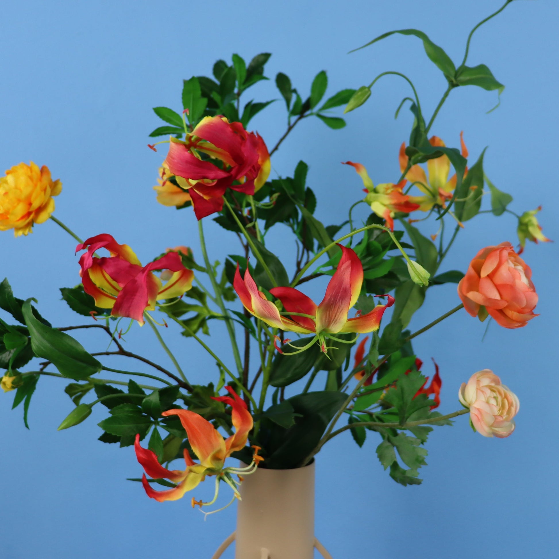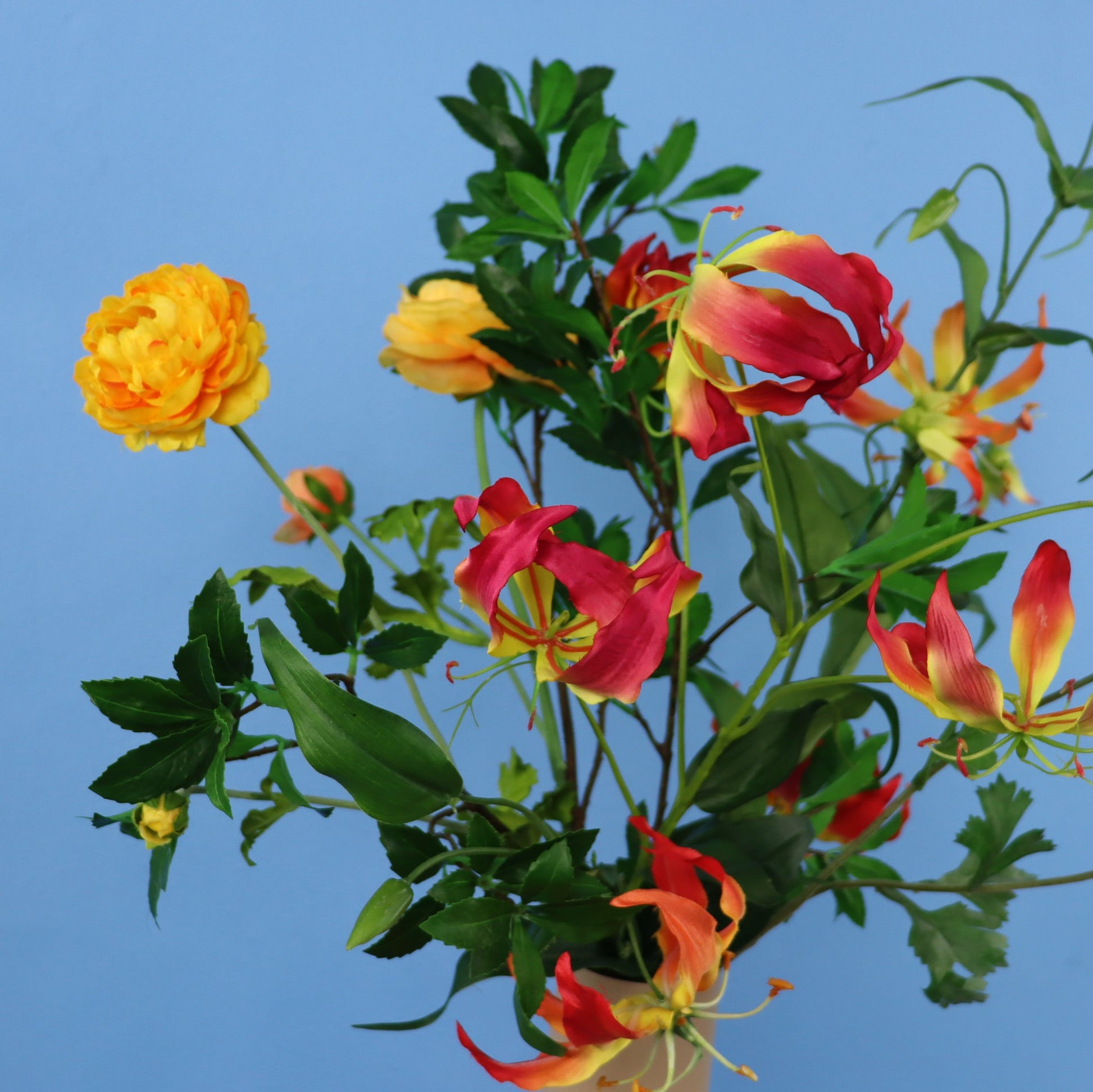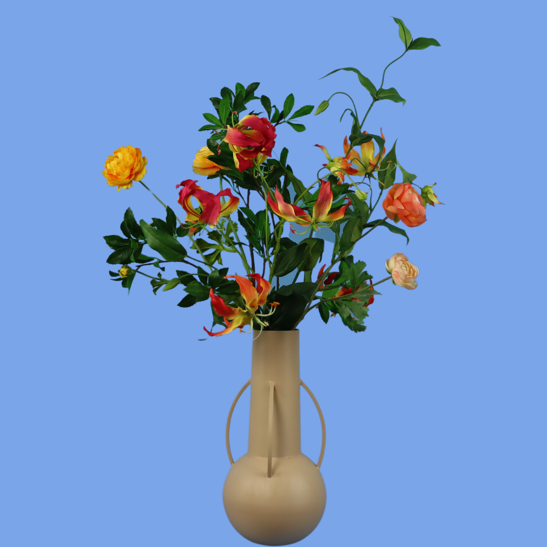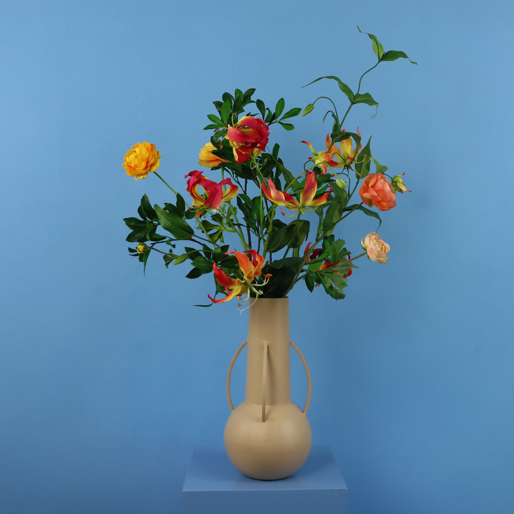 Poeder roze Pols Potten vaas met een vrolijk en kleurrijk boeket.