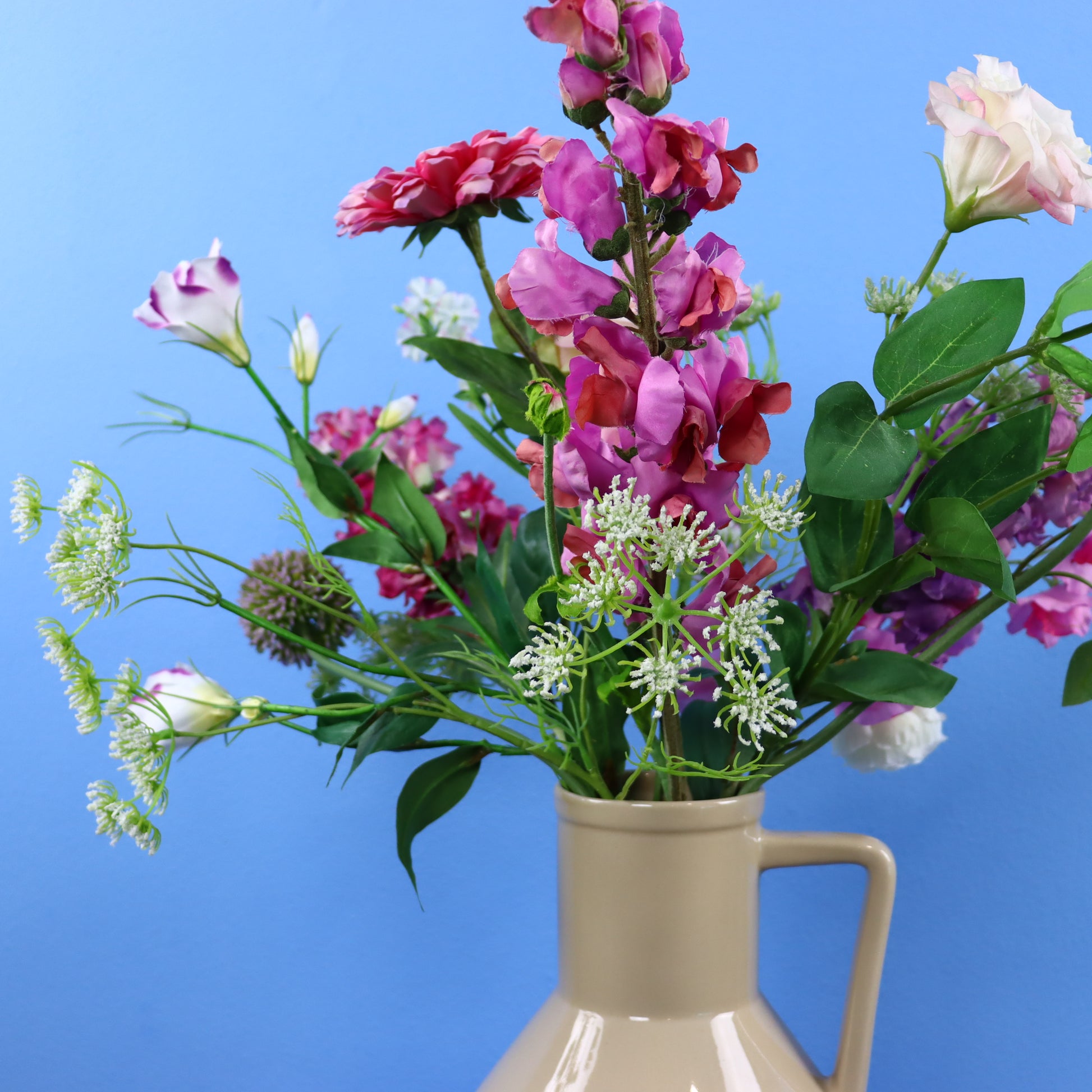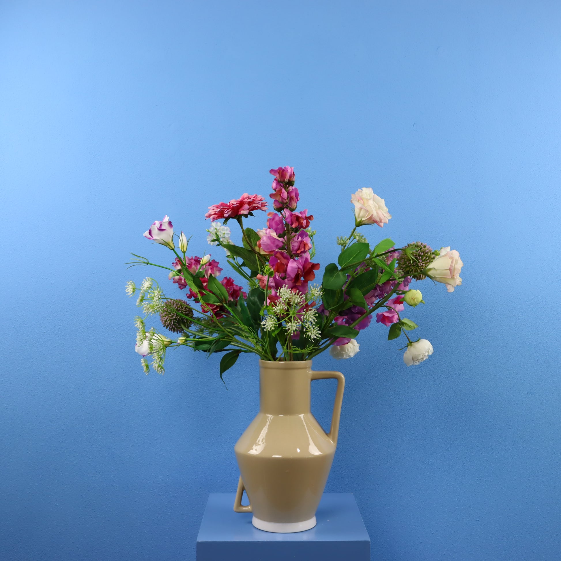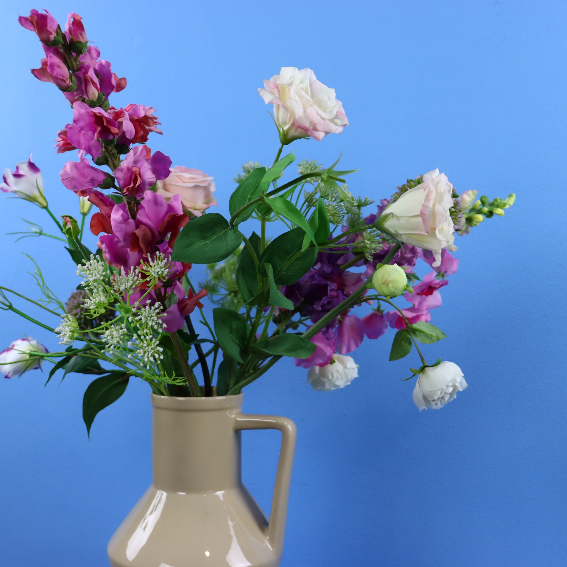 Onze lichte beige Return to Sender vaas met een roze en paars boeket met blijvende bloemen.