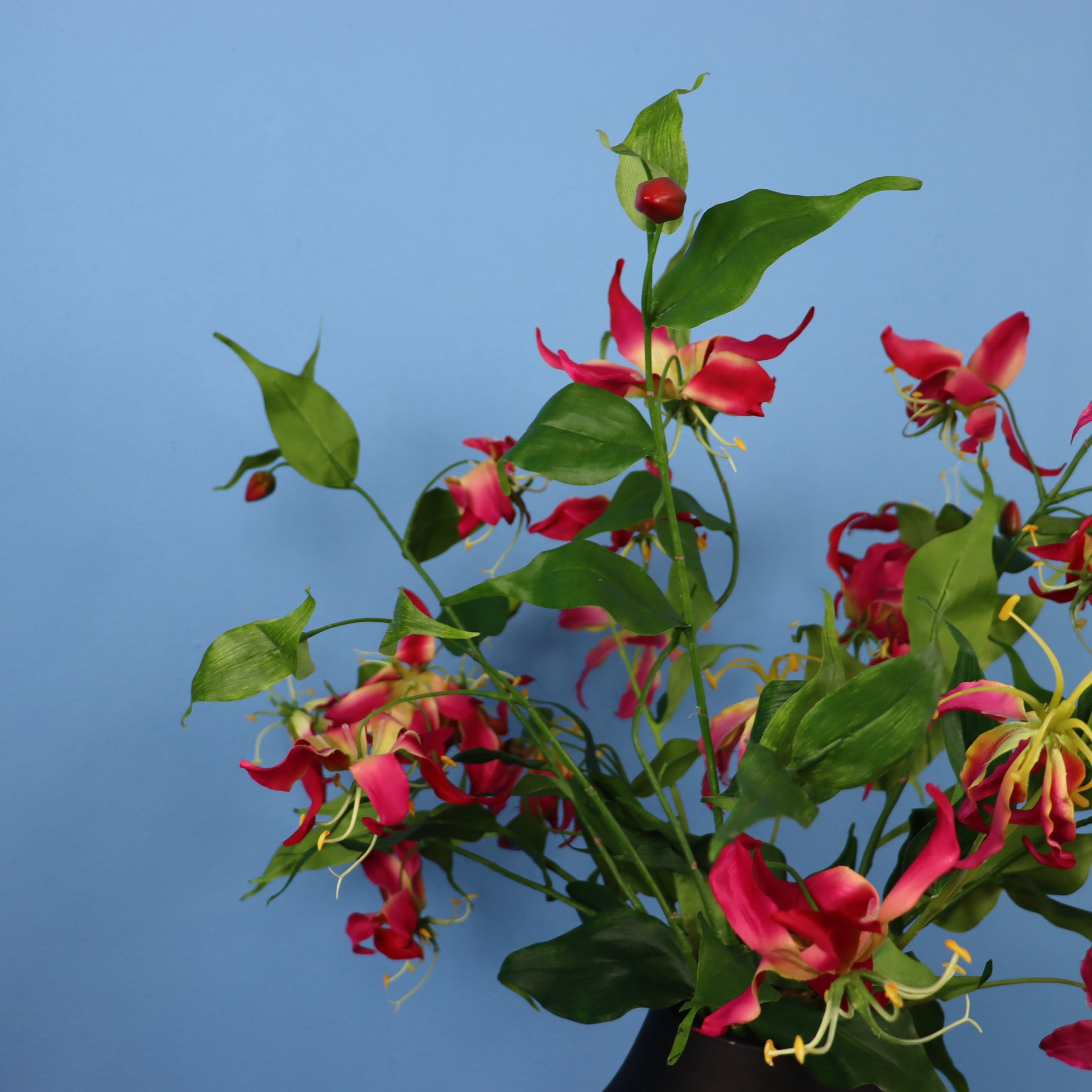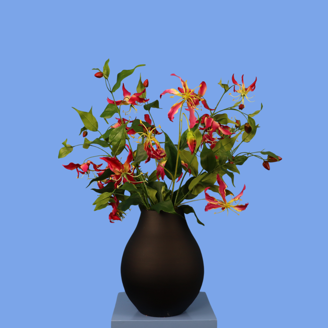 Deze leuke zwarte vaas is opgemaakt met een beeldige straelitzia.