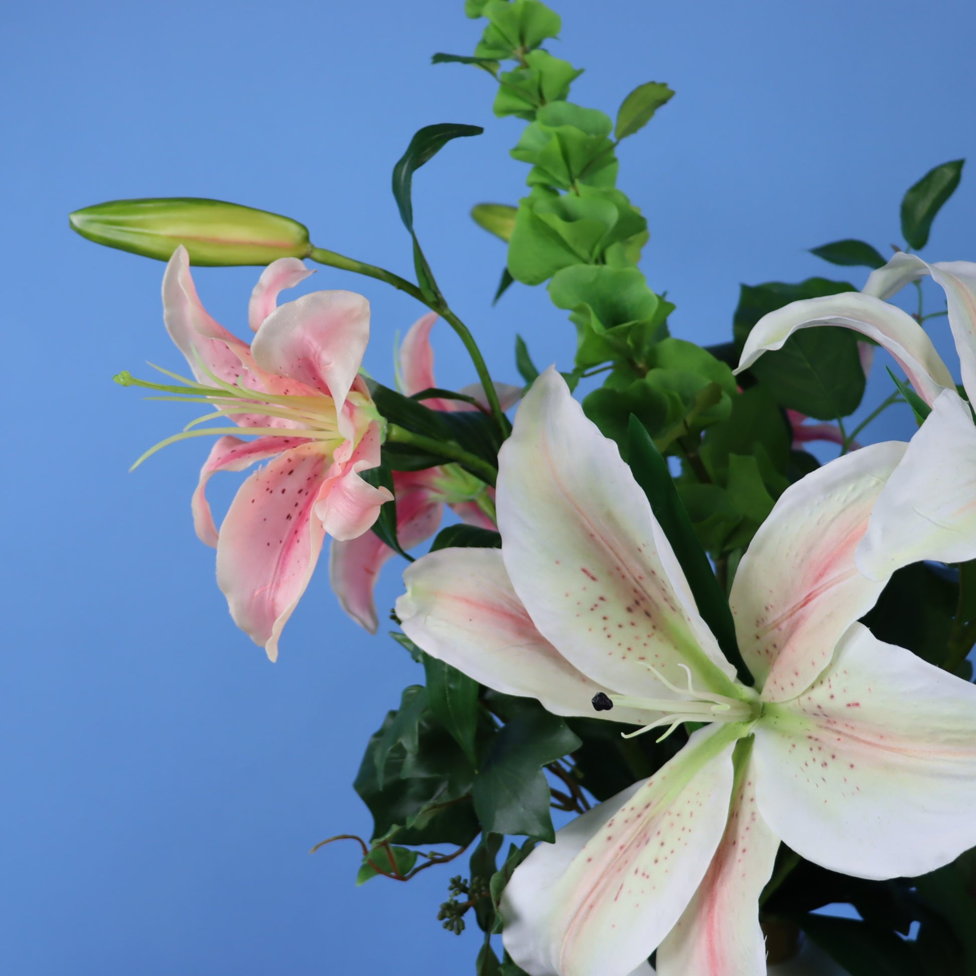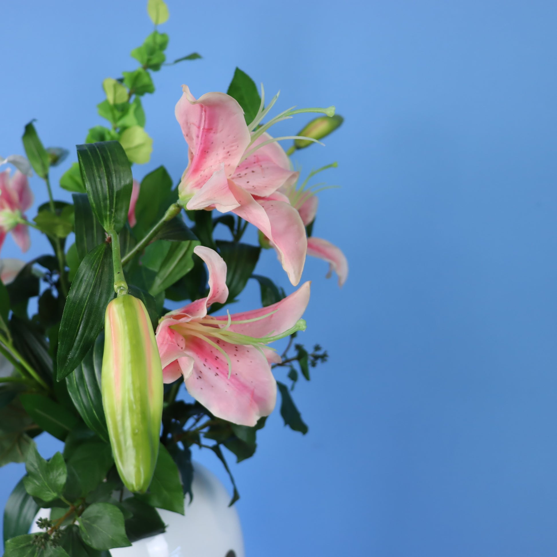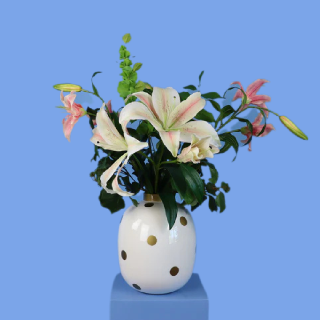 Pip Studio vaas - wit met gouden stippen, gevuld met roze en witte lelies - die niet stinken!