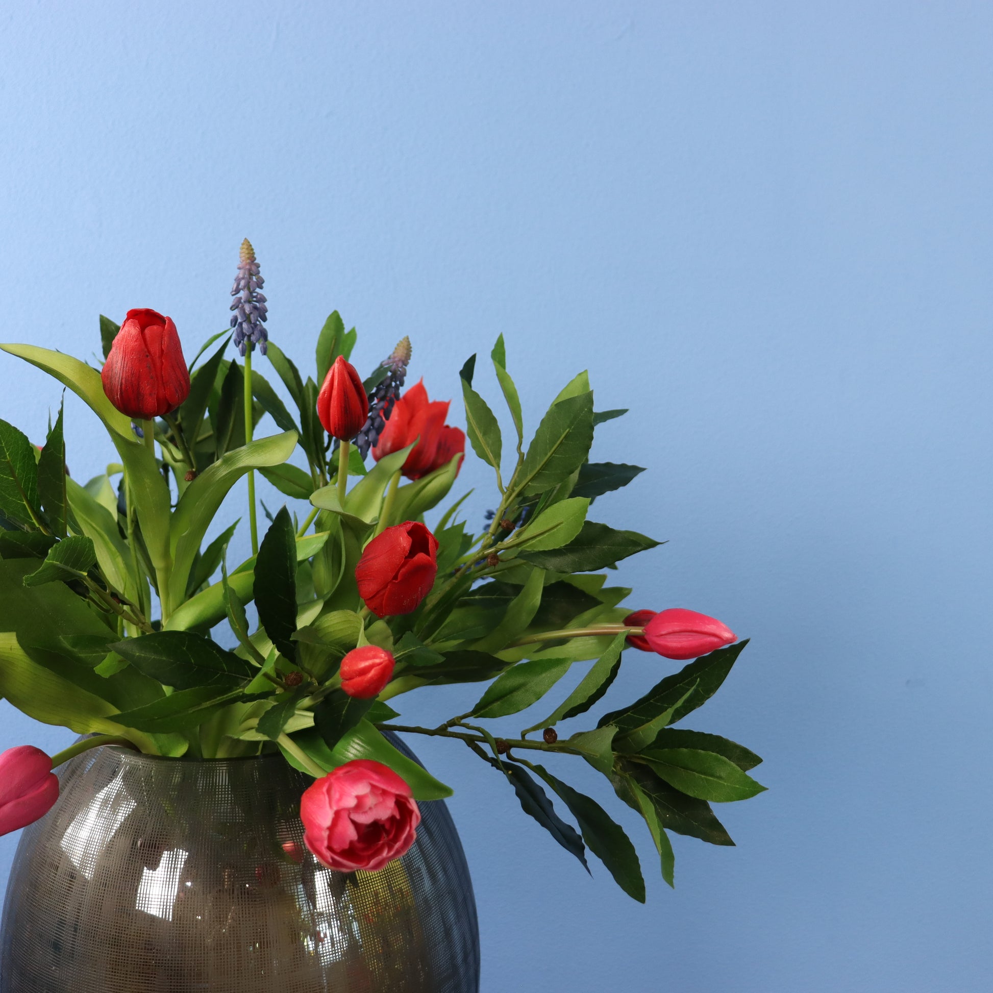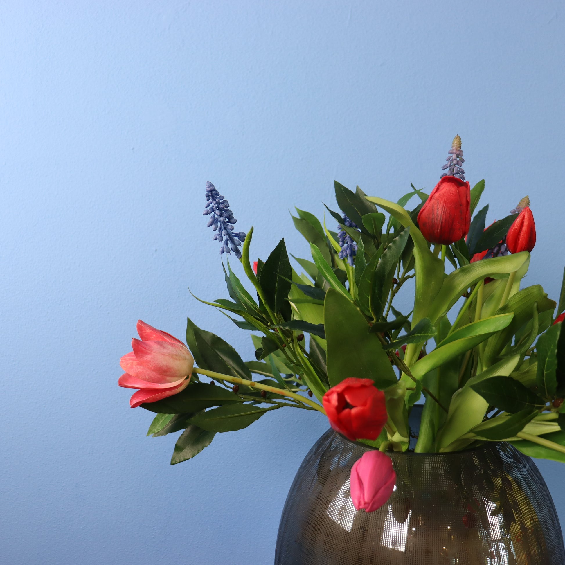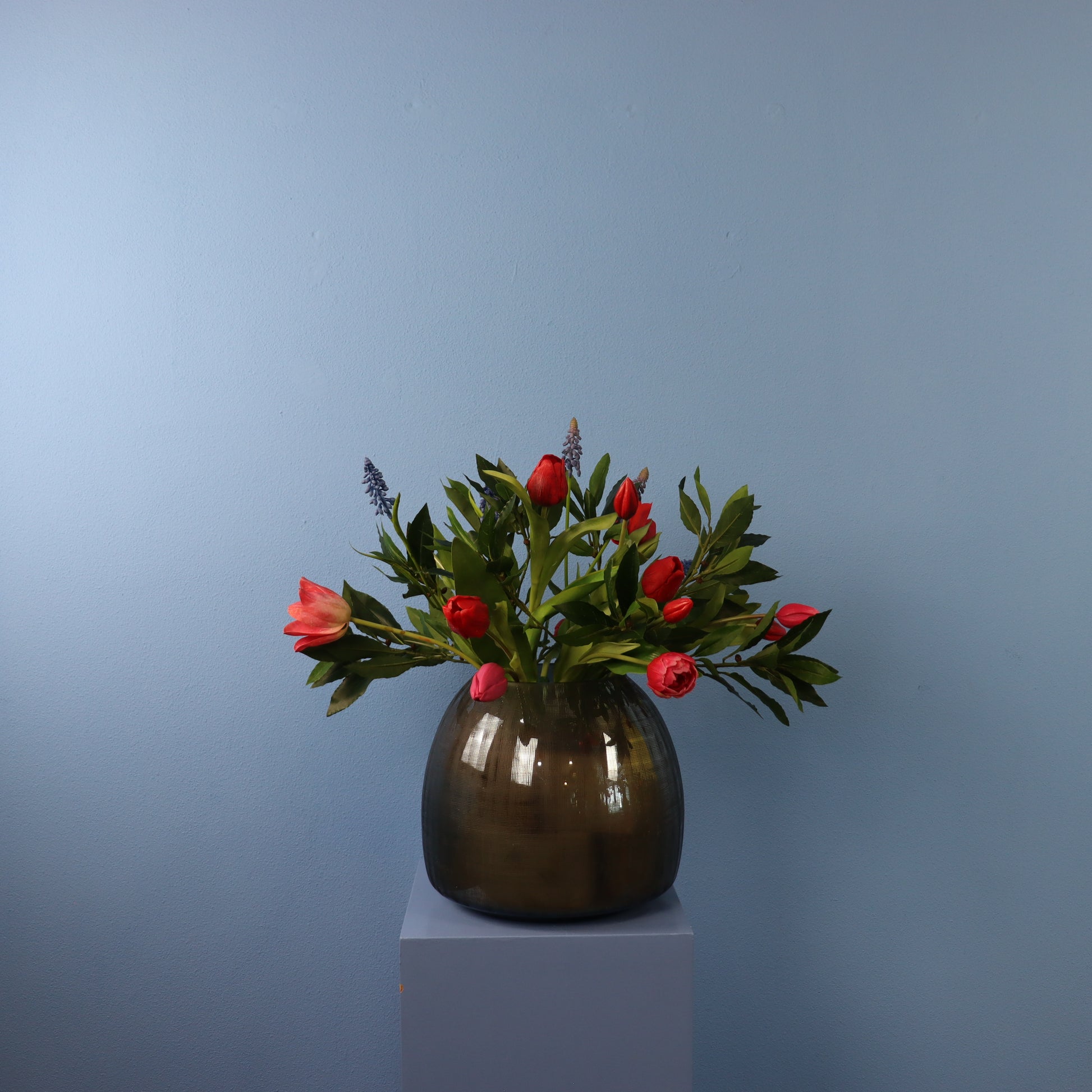 Glazen Pols Potten vaas met een vrolijk boeket van blijvende bloemen.