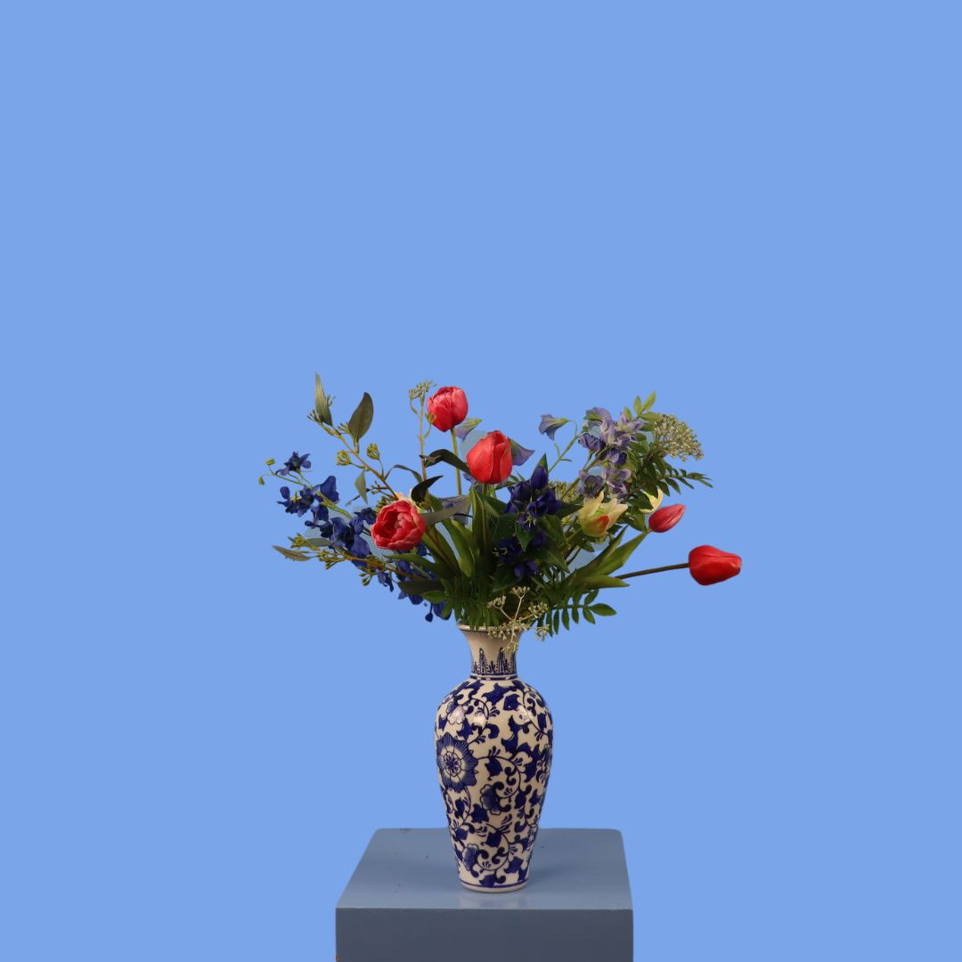 Deze vaas in Delftse stijl is gevuld met een bos kleurrijke blijvende bloemen.