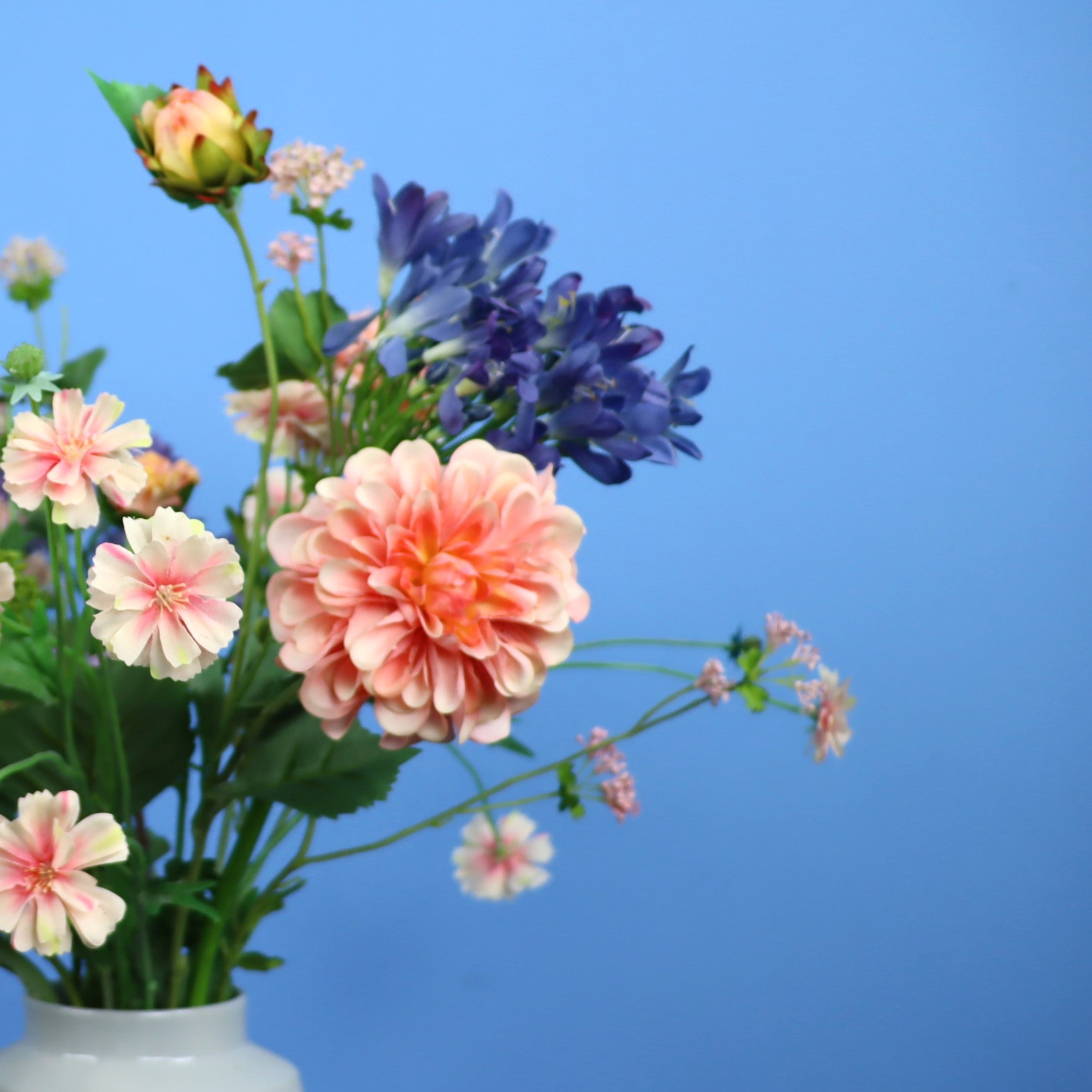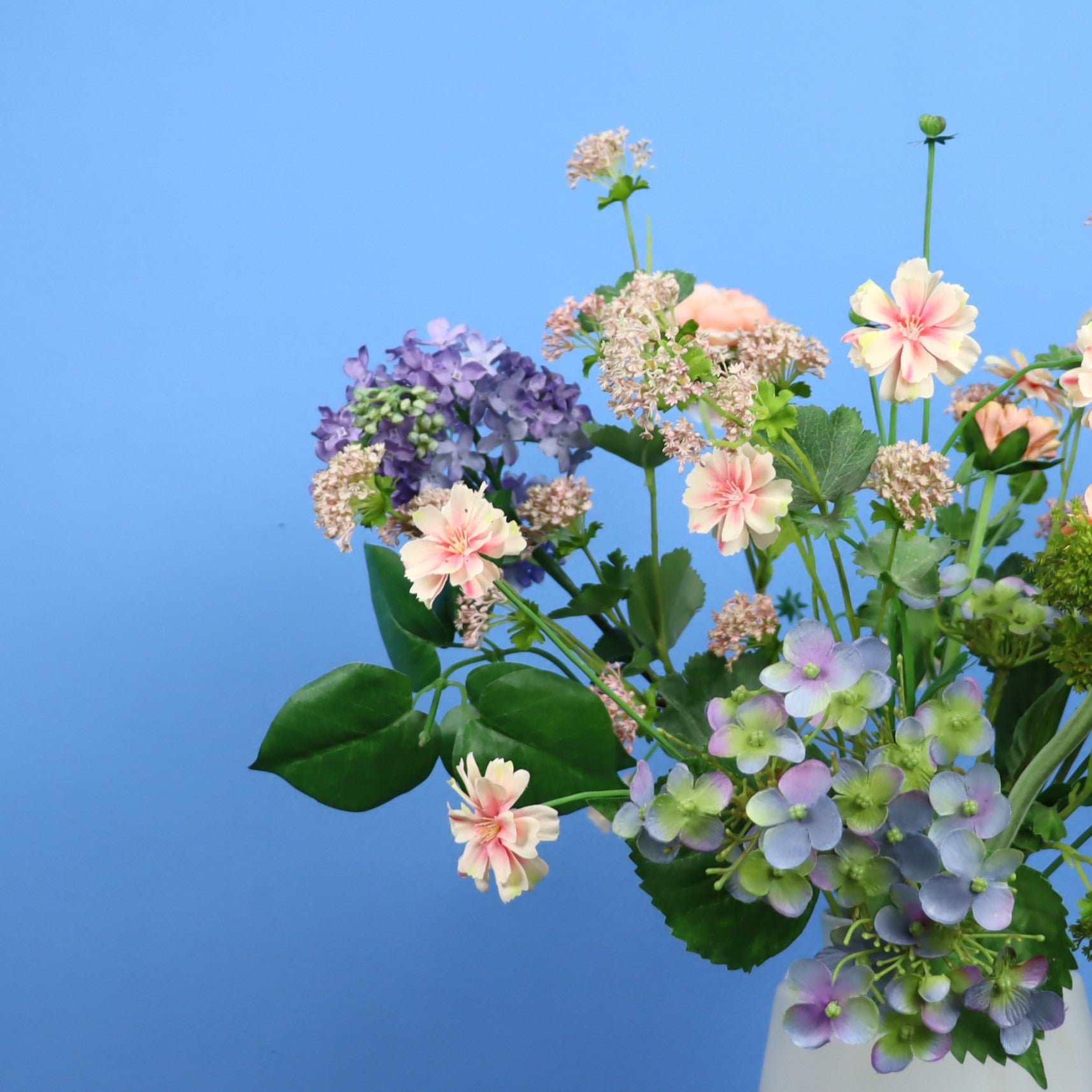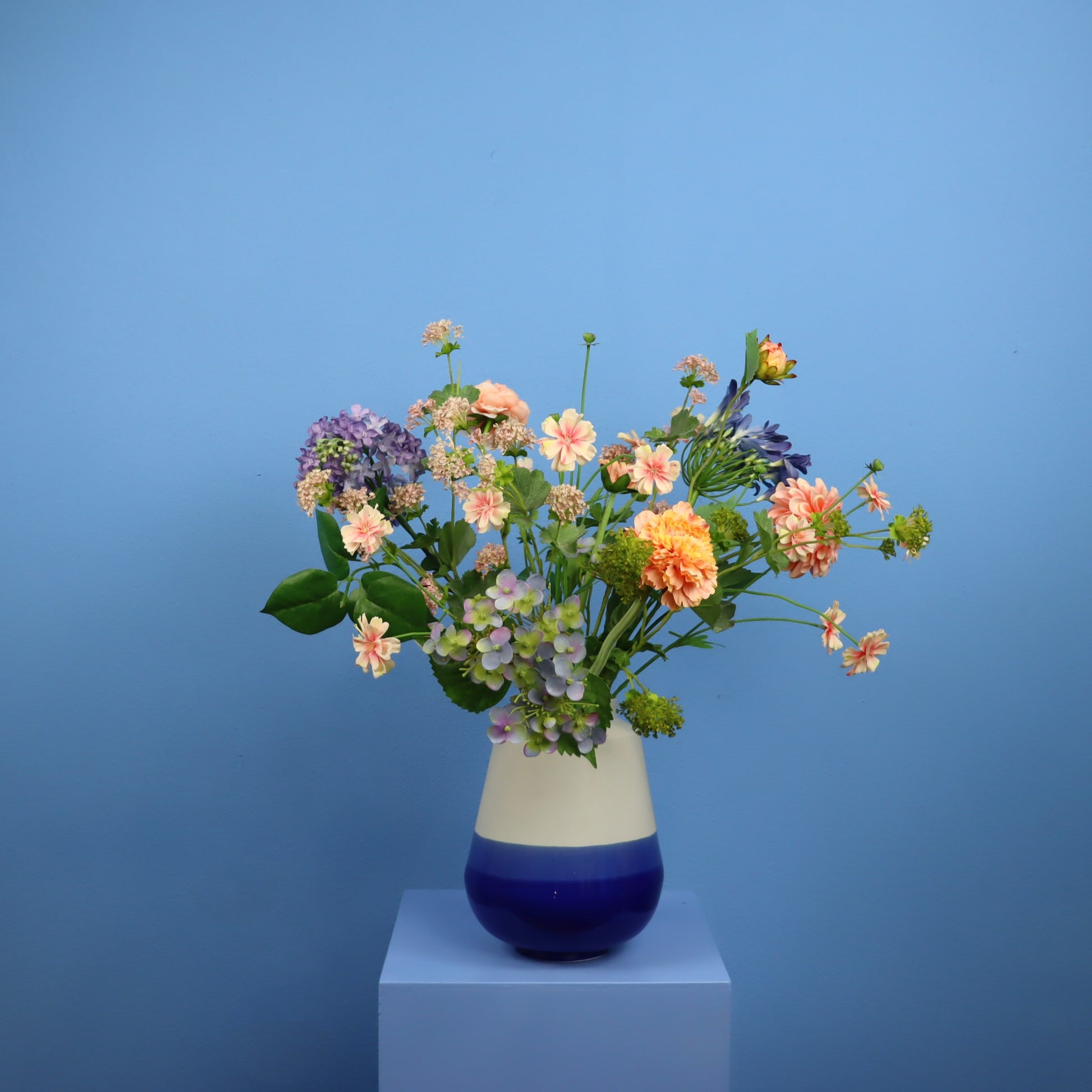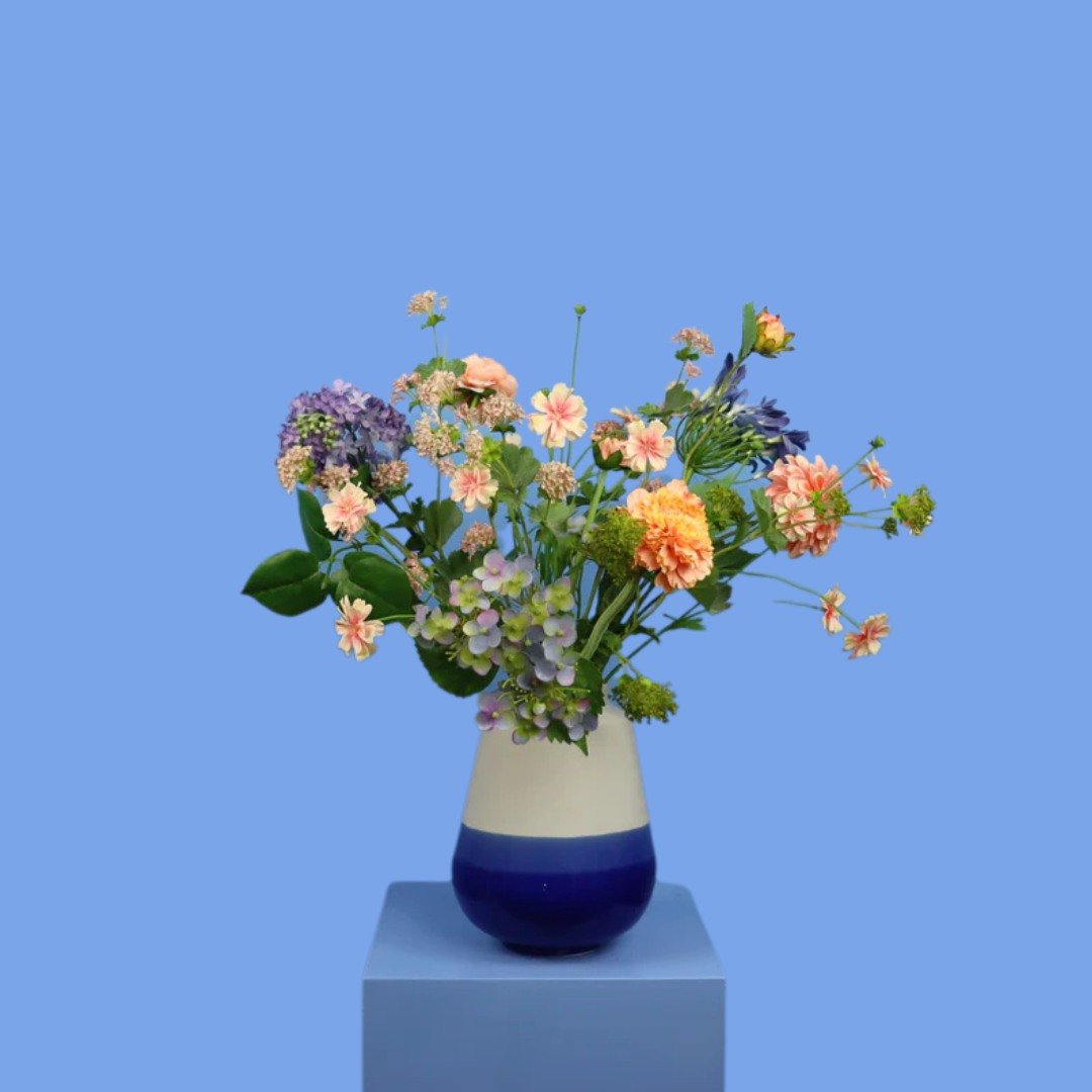 Deze witte Serax vaas met een verloop naar donkerblauw is rijkelijk gevuld met diverse soorten bloemen in de kleuren lichtroze, paars en blauw.