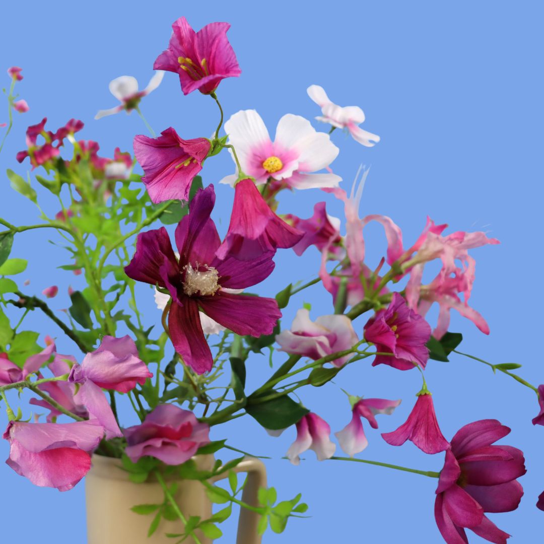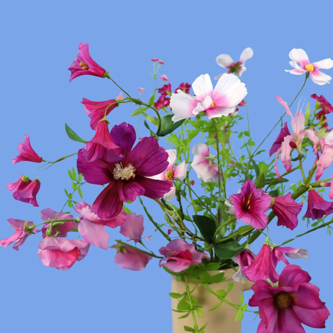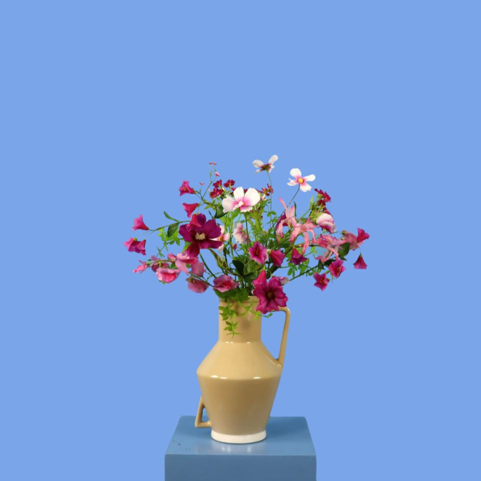Return to Sender vaas met een roze en paars boeket met blijvende bloemen.