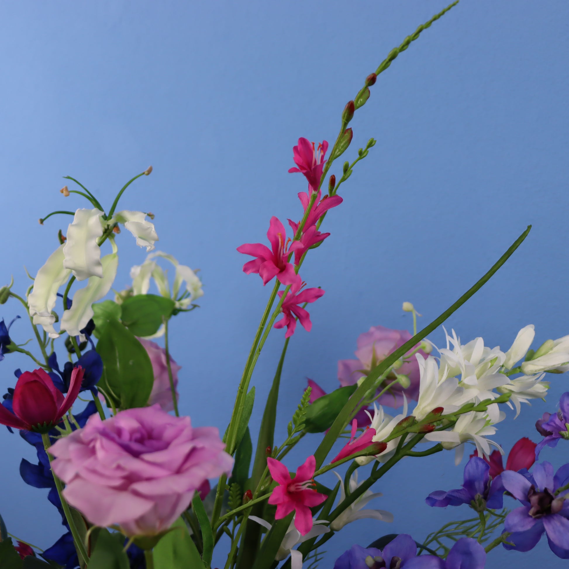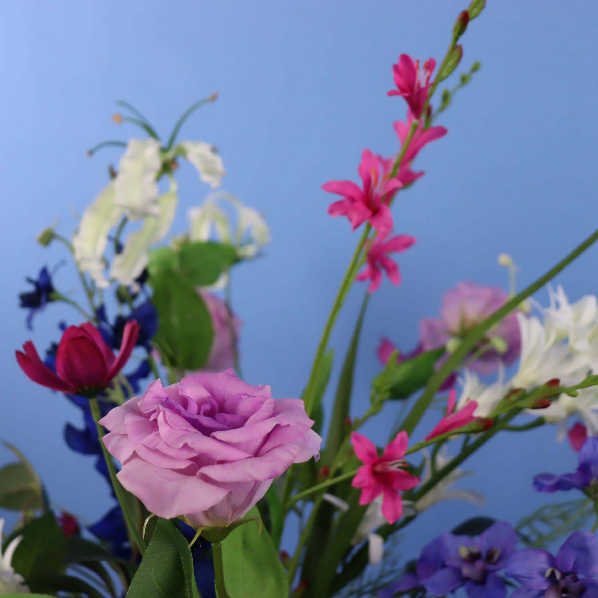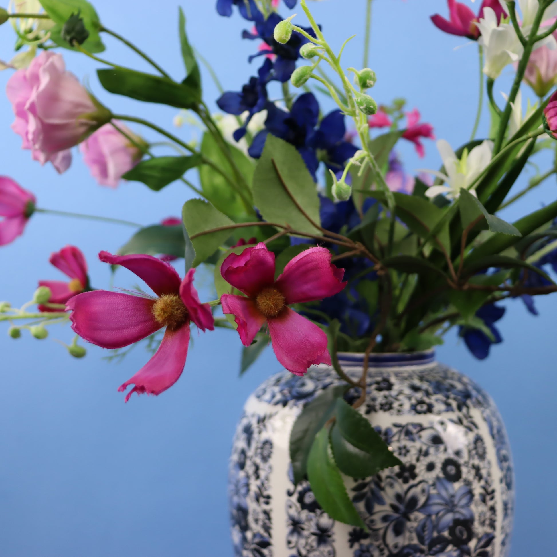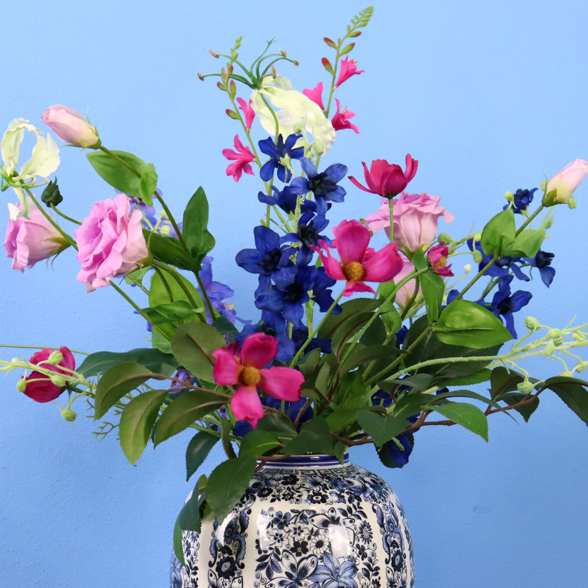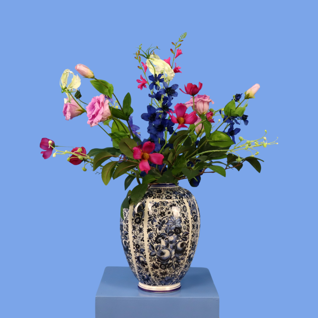 Een blauwe vintage vaas gevuld met kleurrijke bloemen.