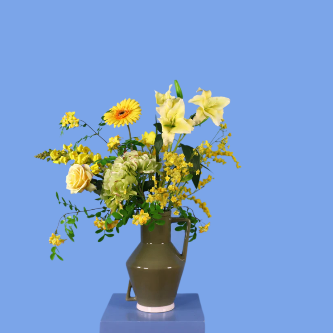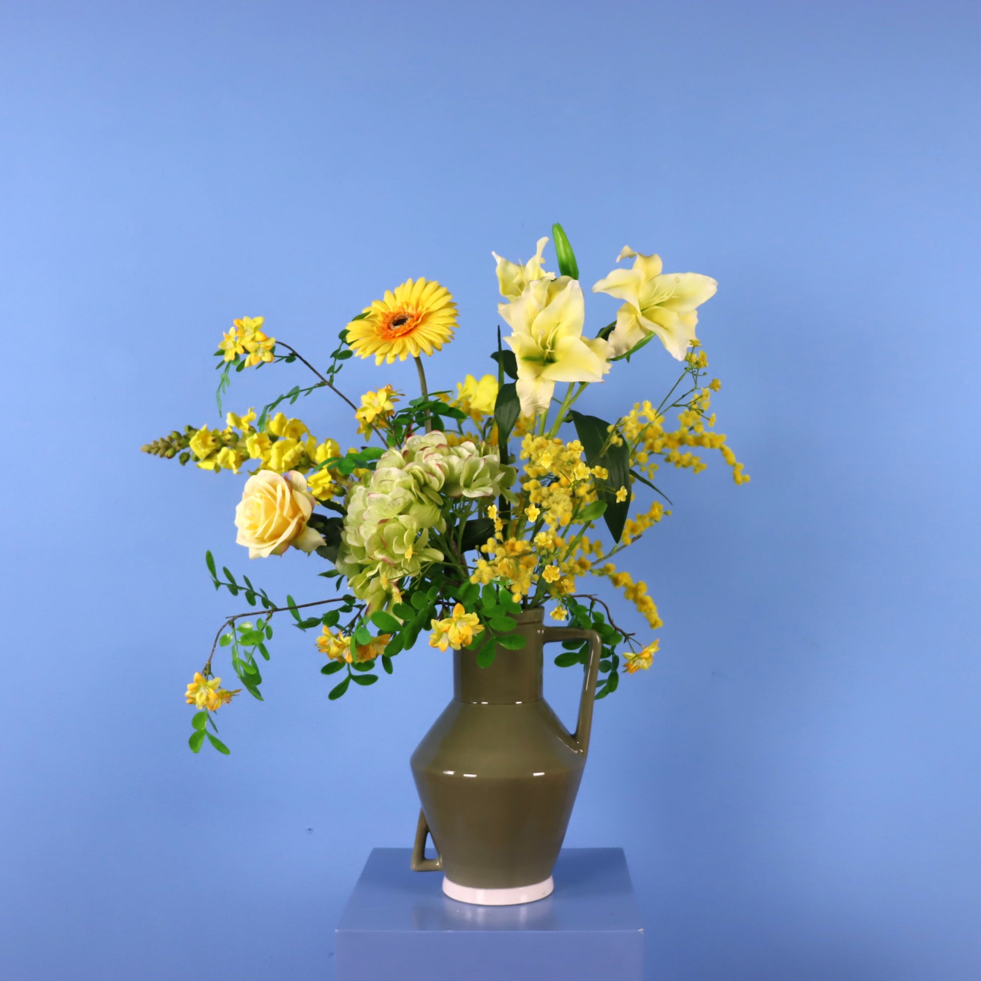 Prachtige donkergroene Return to Sender vaas met een blijvende bloemen mix.