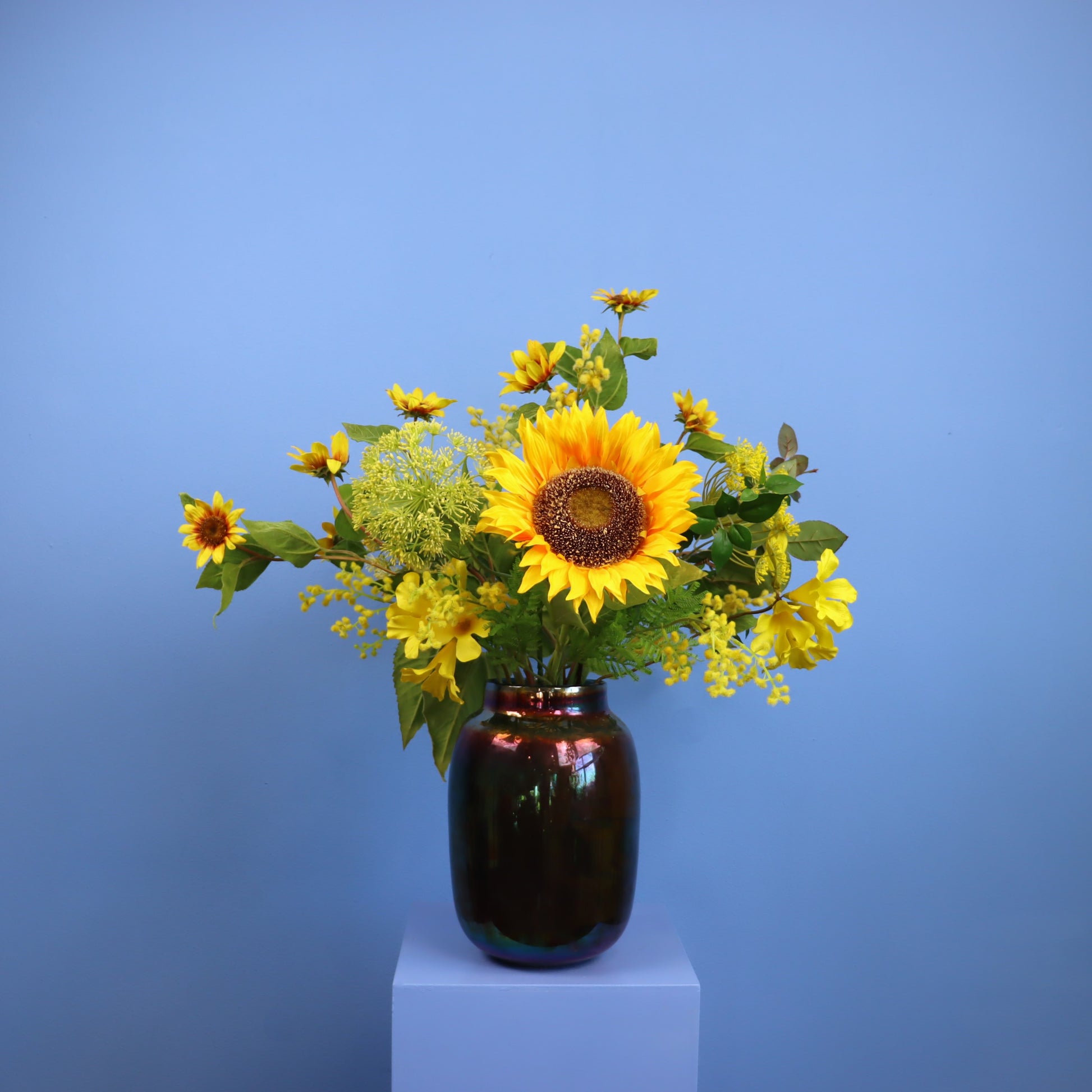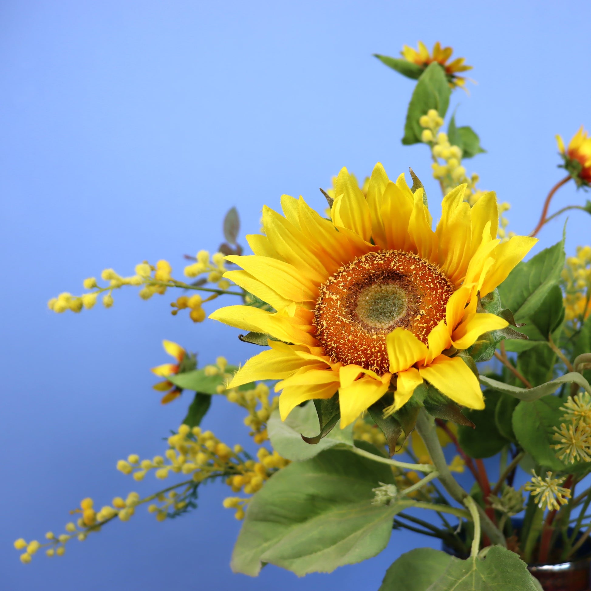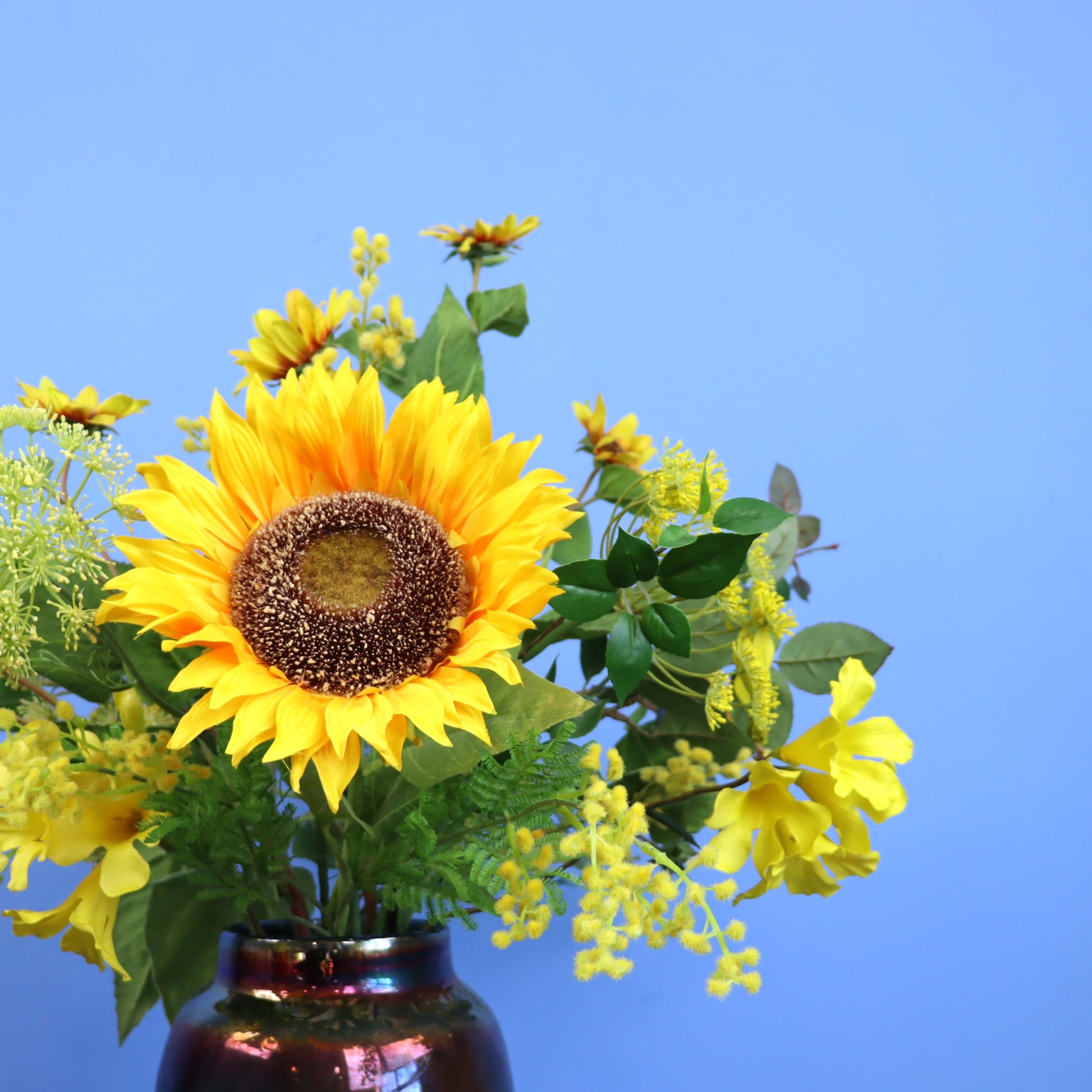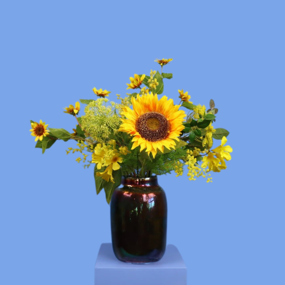 Haal het zonnetje in huis met dit prachtige gele boeket in een glazen vaas.