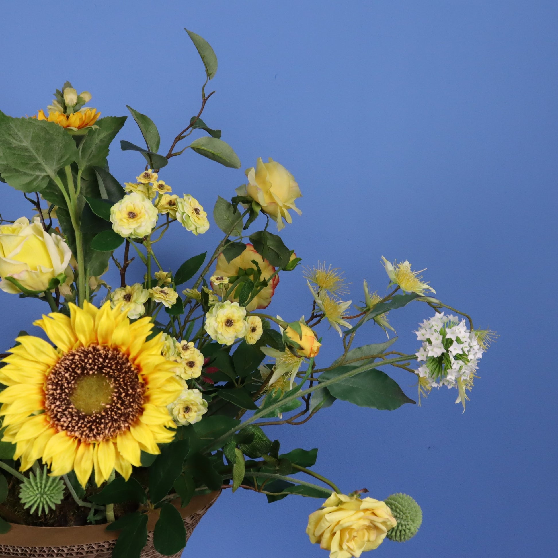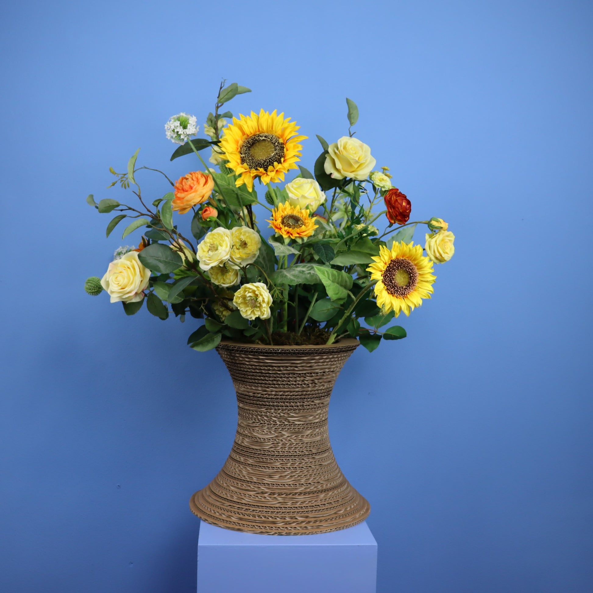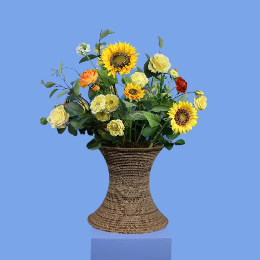 Deze unieke Kartent kartonnen vaas is gemaakt van ons eigen afvalkarton en biedt een duurzaam en stijlvol alternatief voor traditionele vazen. De vaas heeft een hip ontwerp en een neutrale kleur, waardoor het perfect past bij elk interieur. De vaas wordt geleverd met een prachtige bos gele rozen en zonnebloemen, aangevuld met groen om een weelderig en kleurrijk boeket te creëren.