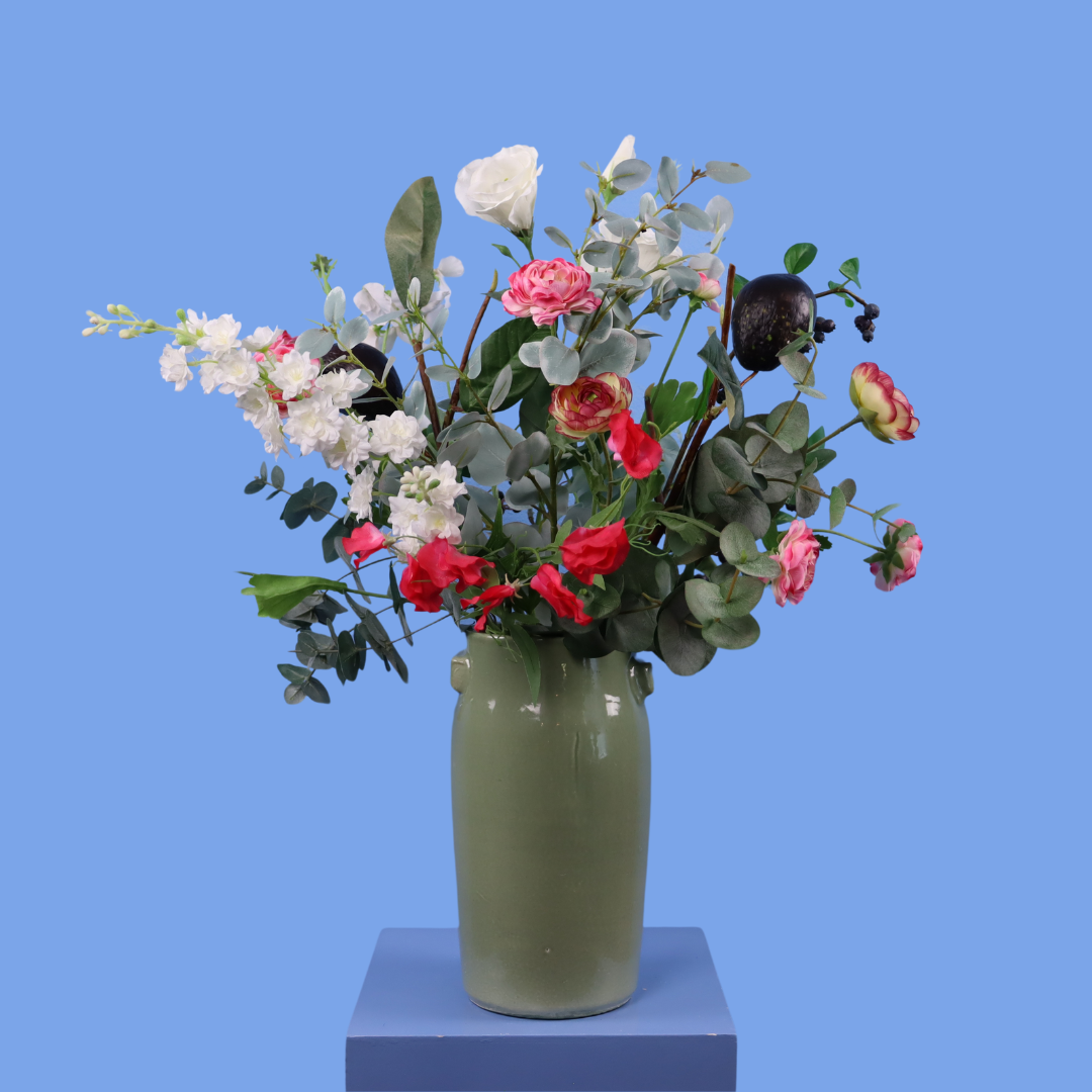 Groene Serax vaas met rozen, lisianthus en is aangevuld met groen.
