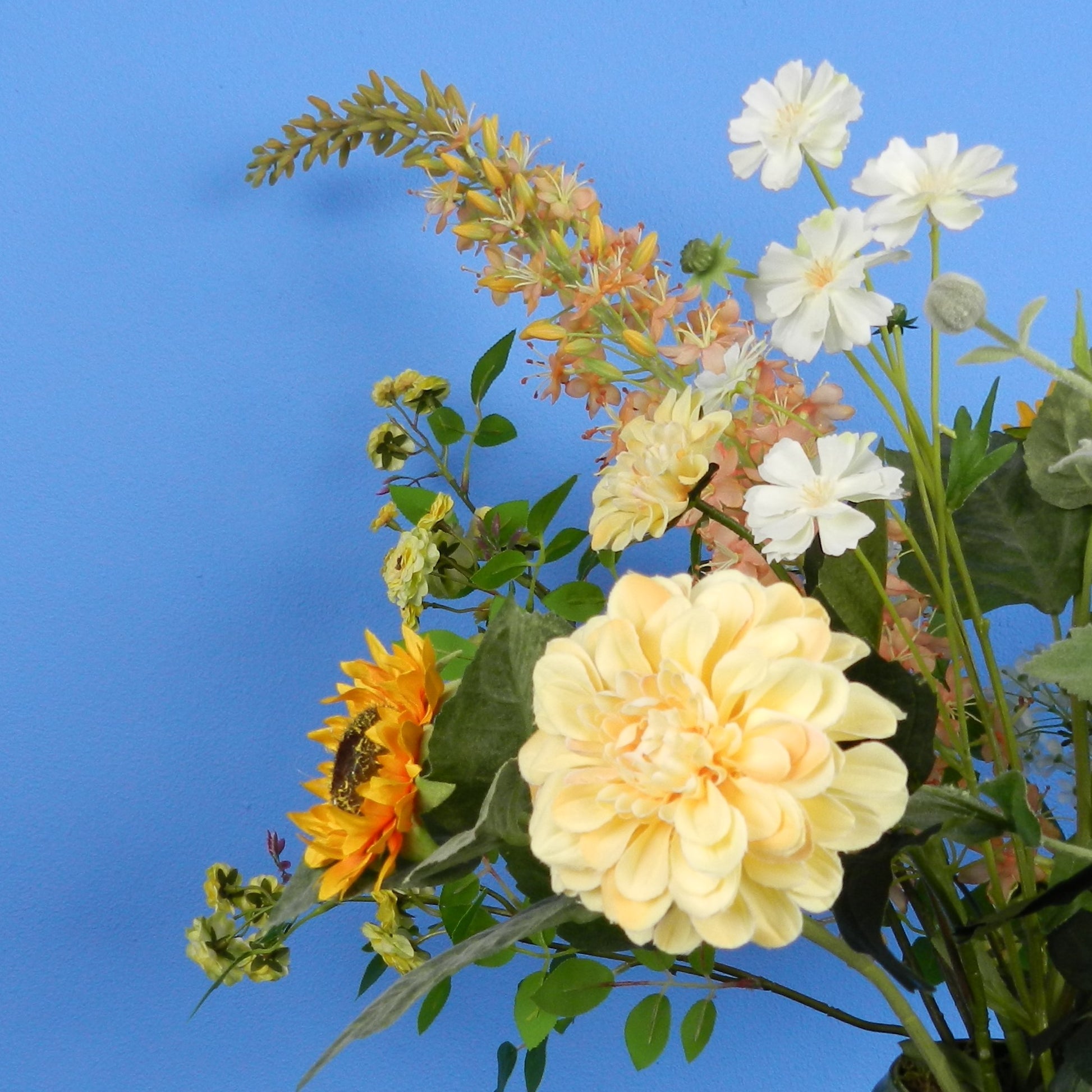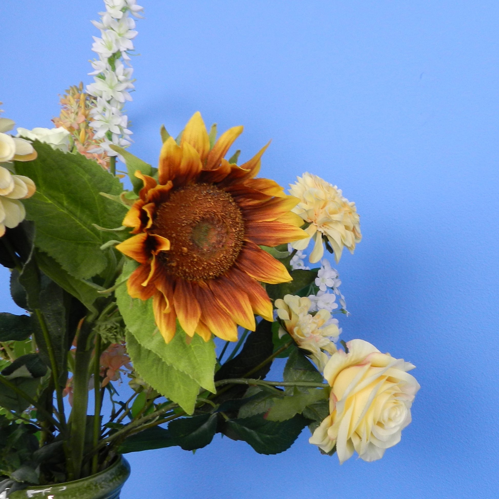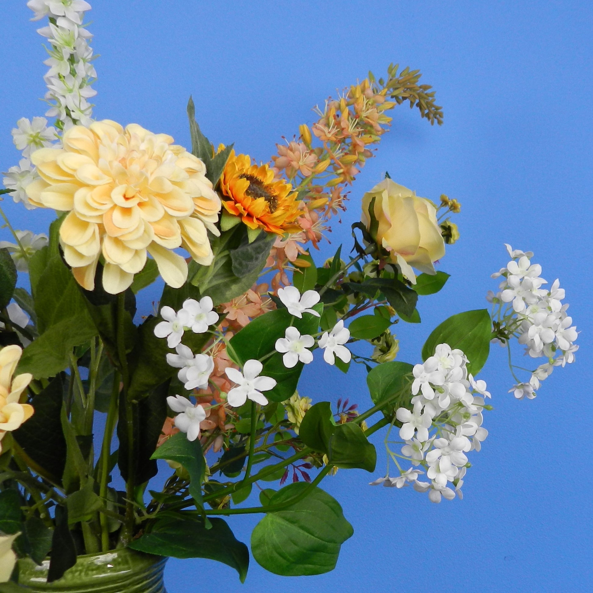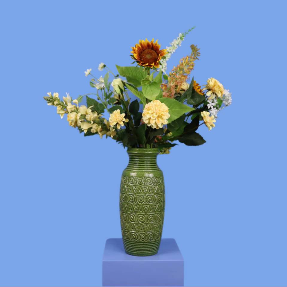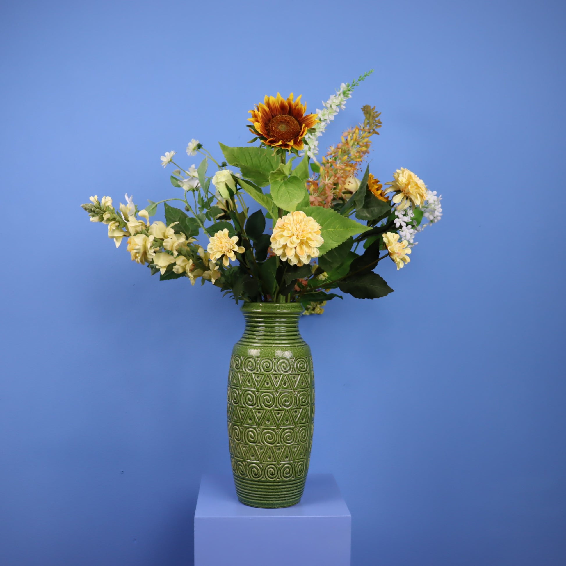 Een olijfgroene West Germany vaas met reliëf, gevuld met een kleurrijk boeket van dahlia's, zonnebloemen en vossenstaarten in voornamelijk gele tinten.
