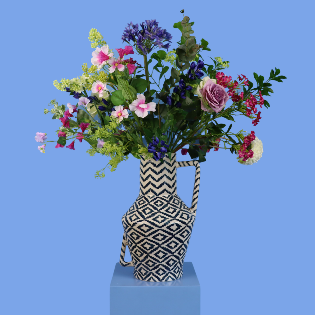 Deze Return to Sender vaas is ontworpen door Laura de Monche en heeft een prachtige etnische blauw-witte print.