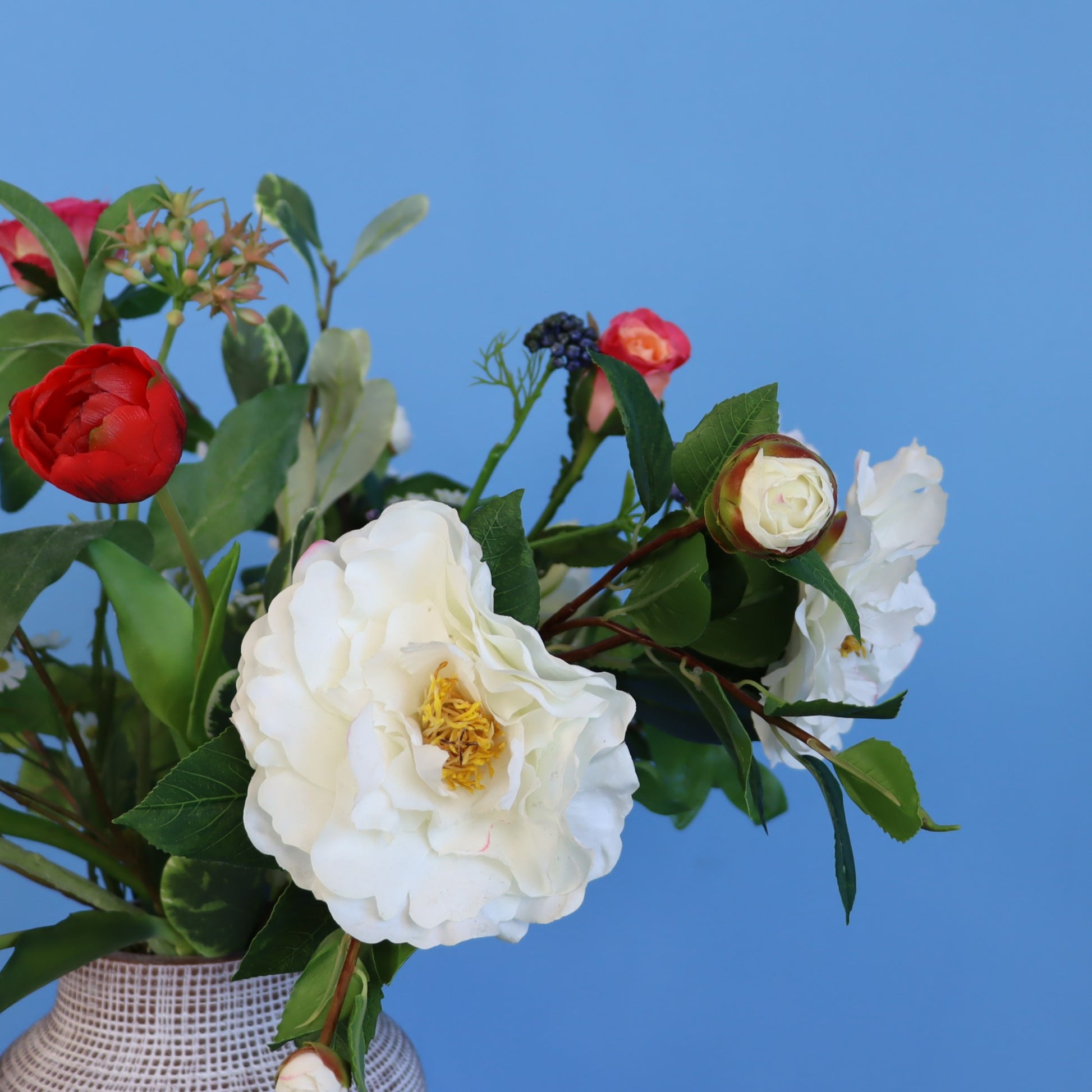 Vaas met bruin reliëf en vrolijke blijvende bloemen mix.