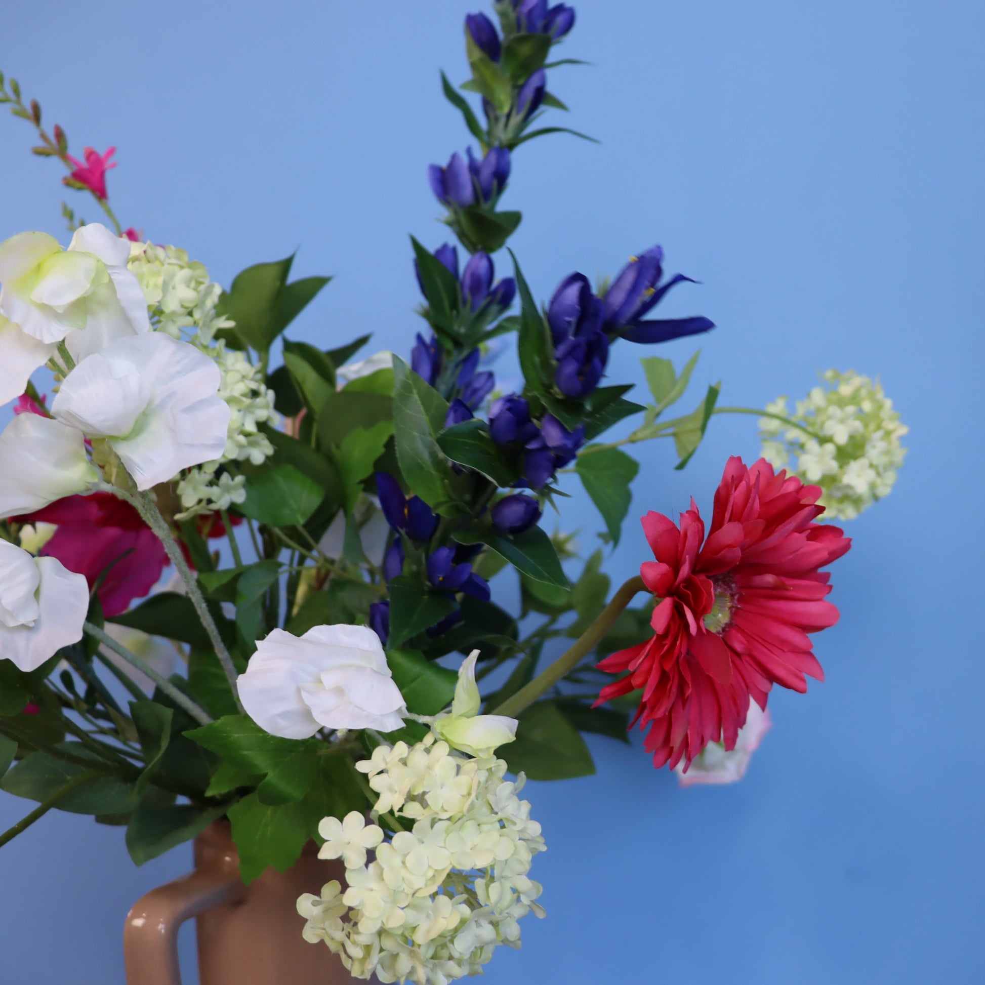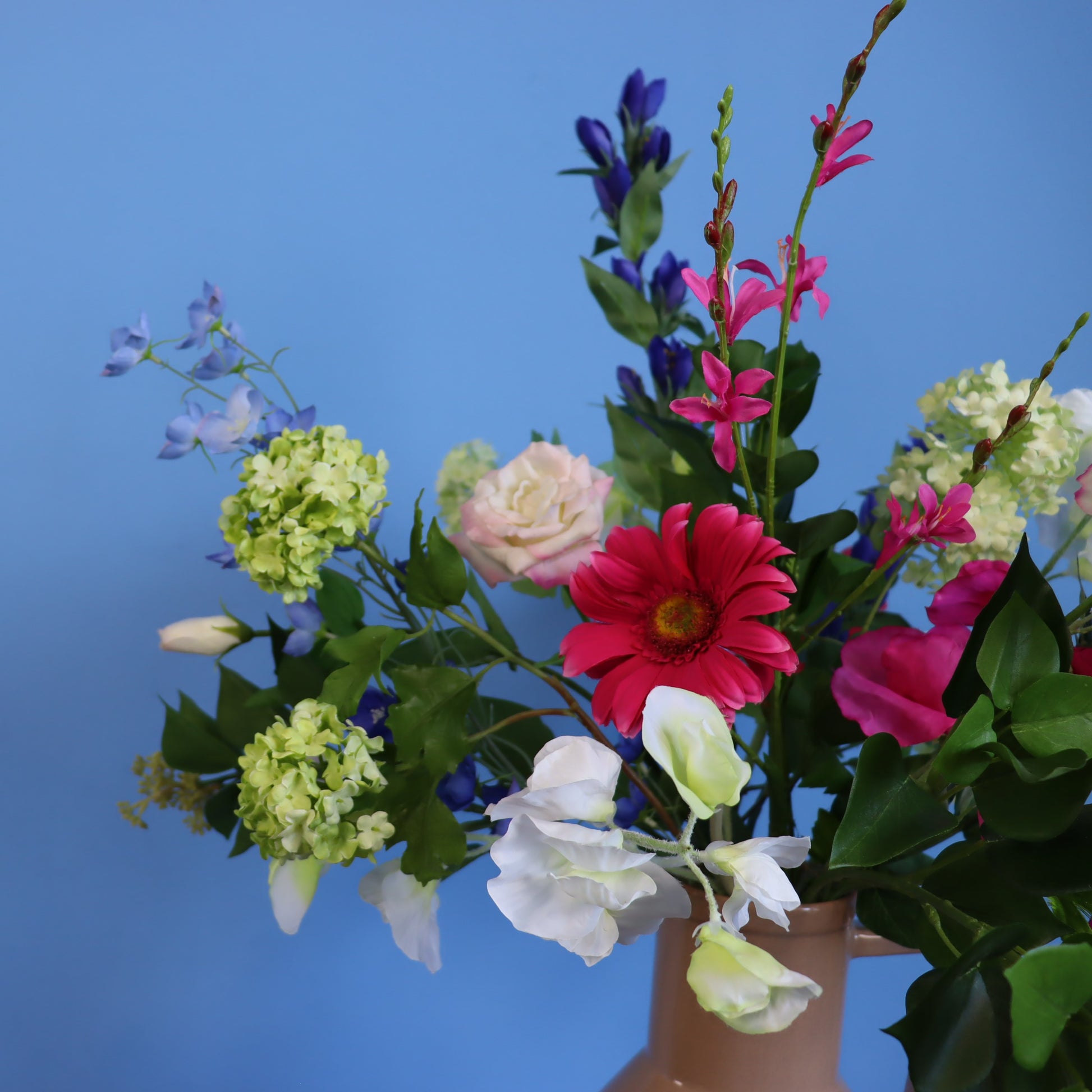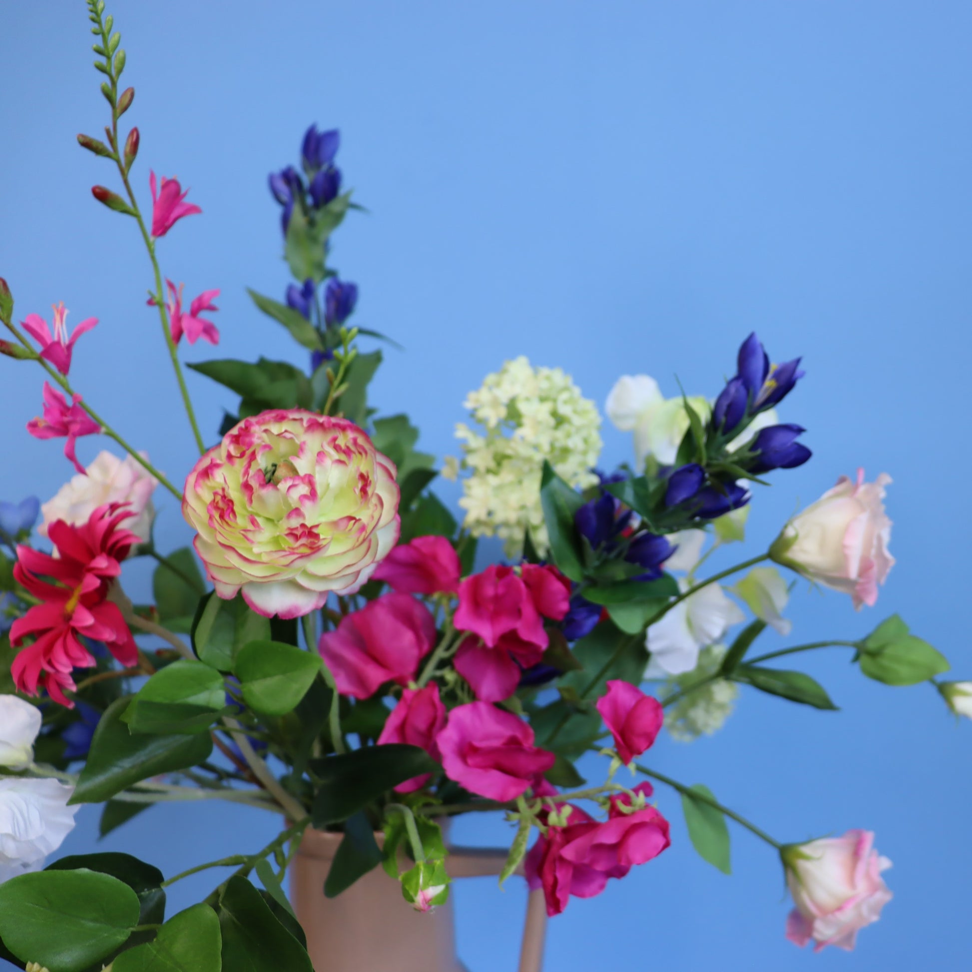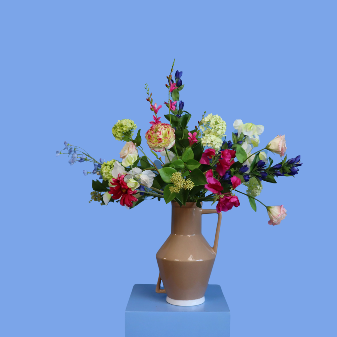 Deze beige Return to Sender vaas is gevuld met een kleurrijke bloemenmix.