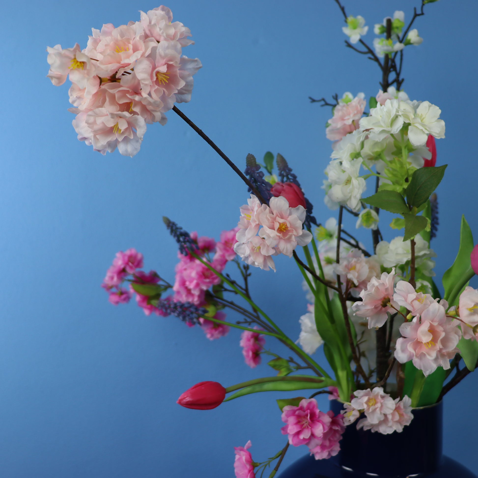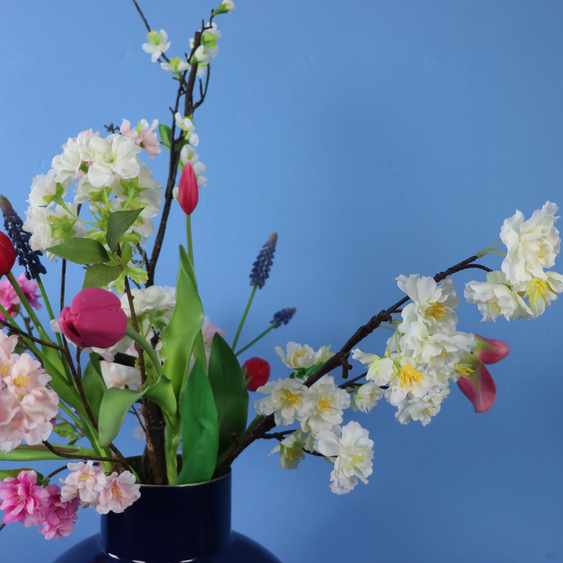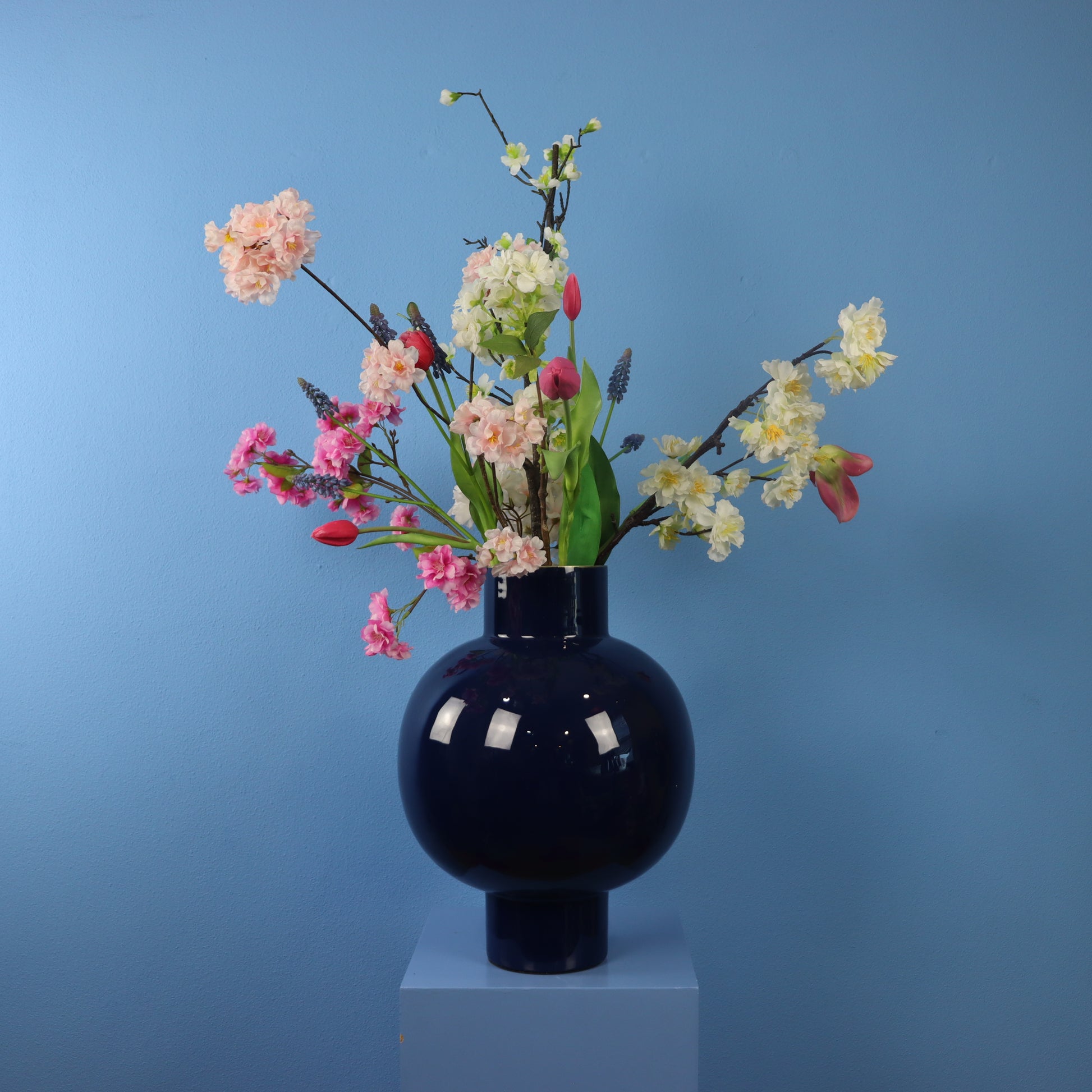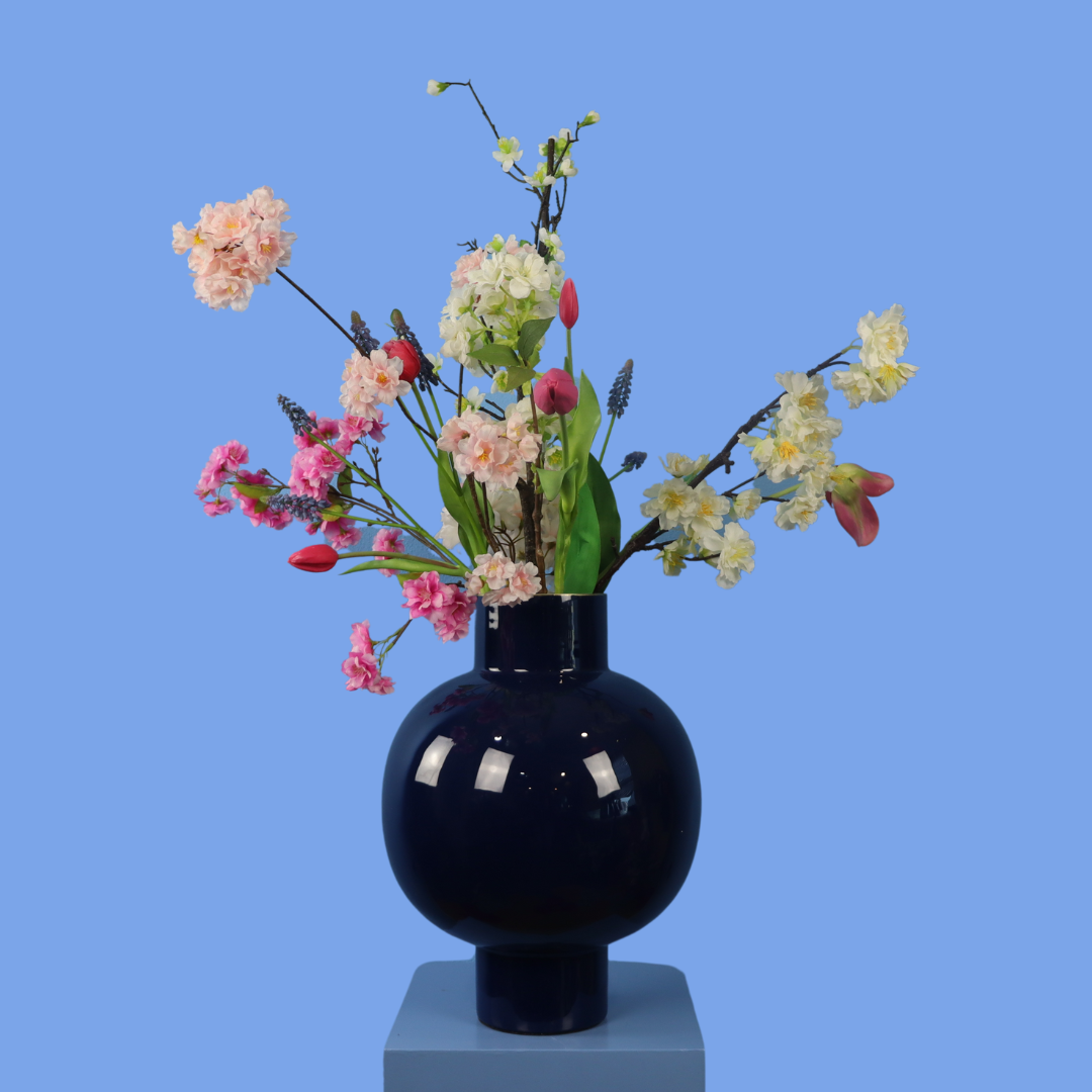 Mooie donkerblauwe metalen vaas van Pip Studio, gevuld met een prachtige blijvende bloemen.