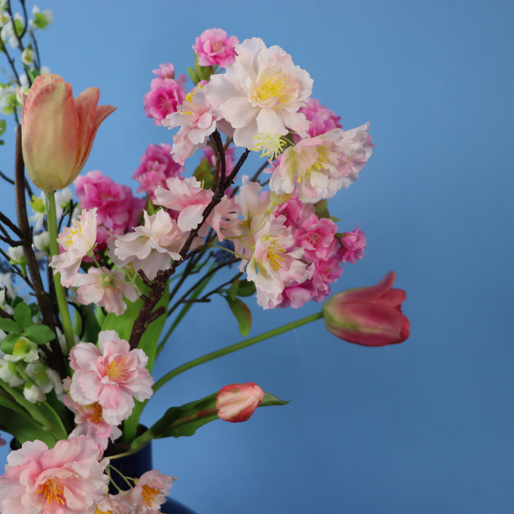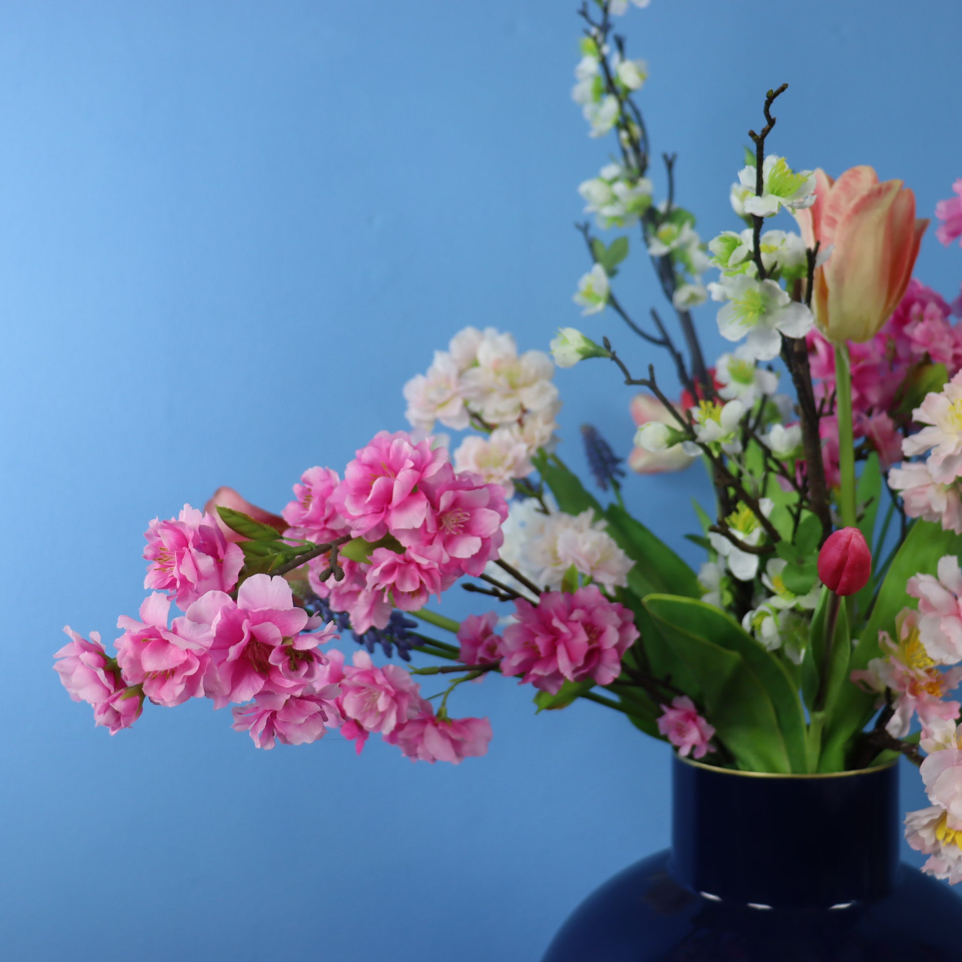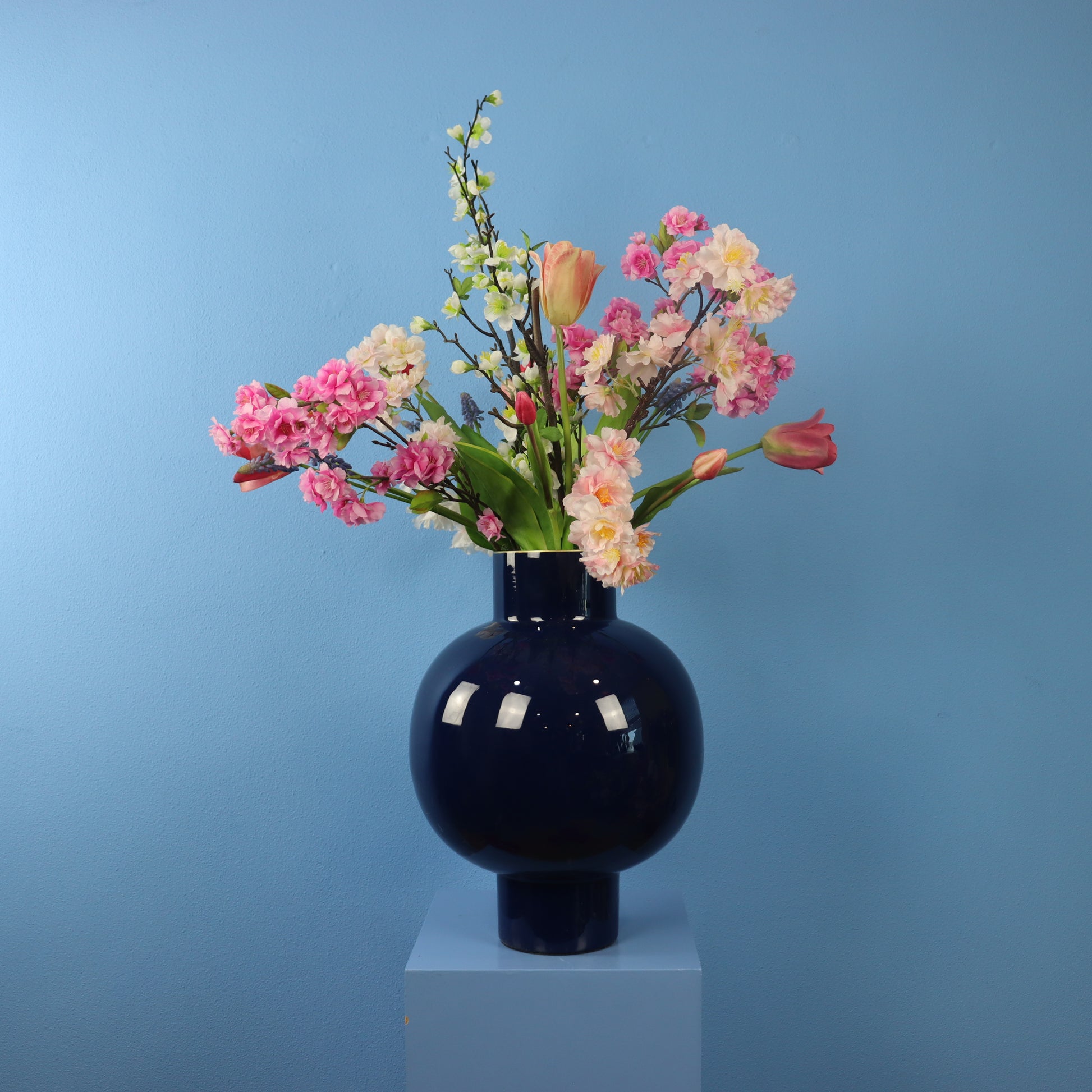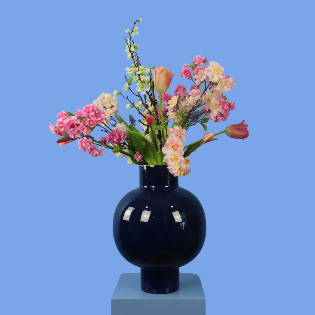 Mooie donkerblauwe vaas van Pip Studio, gevuld met een prachtige blijvende bloemen.