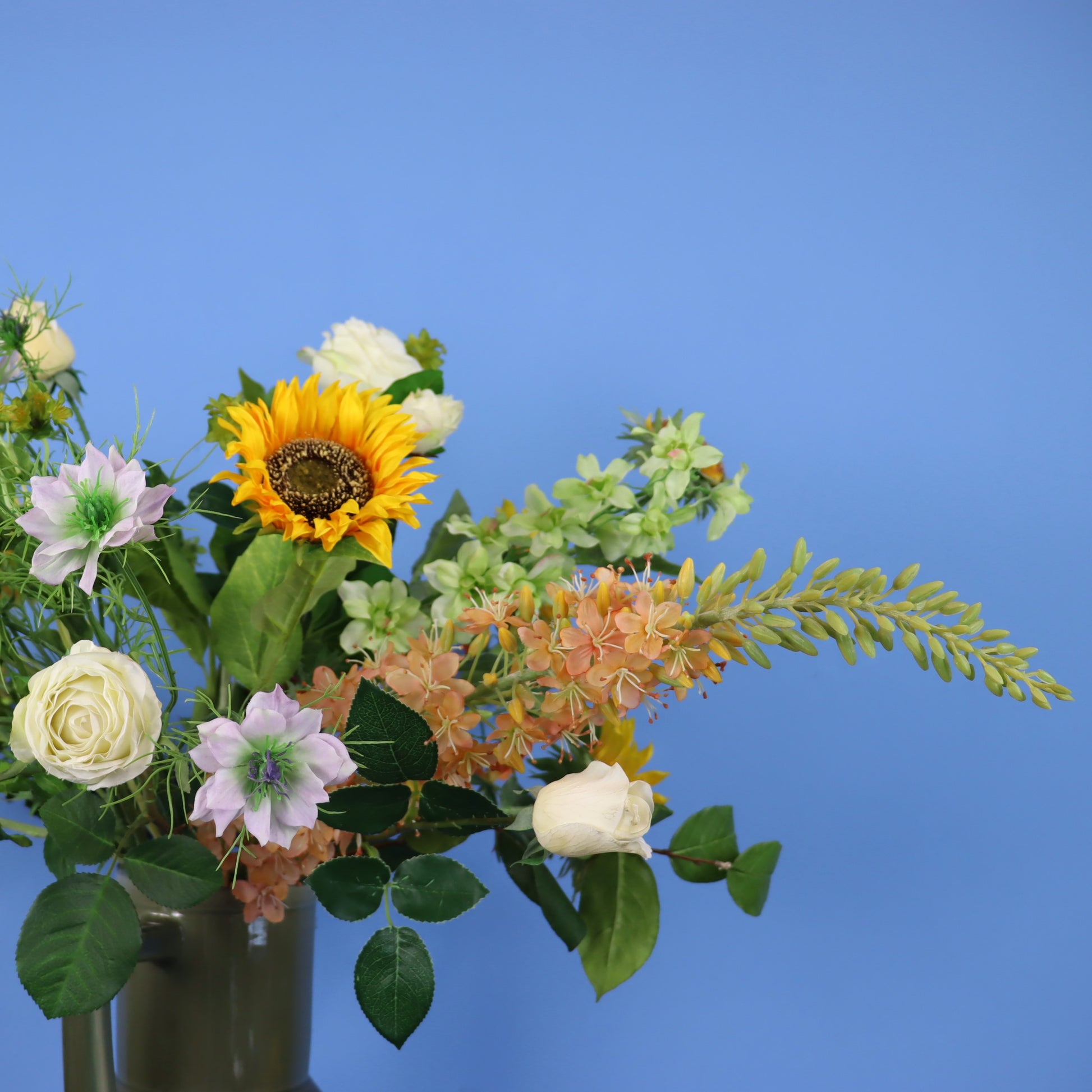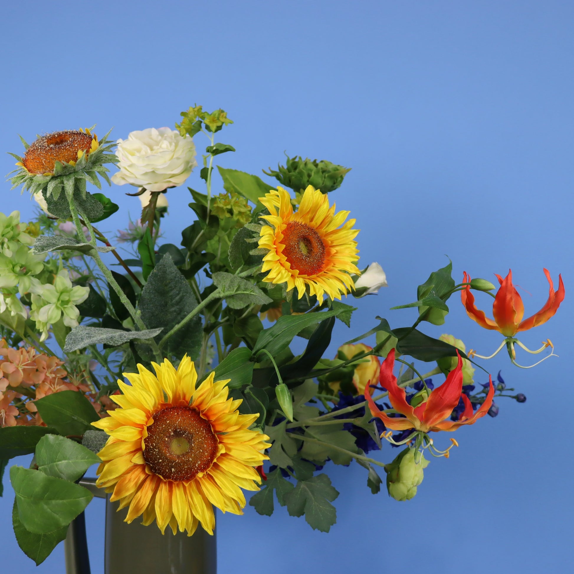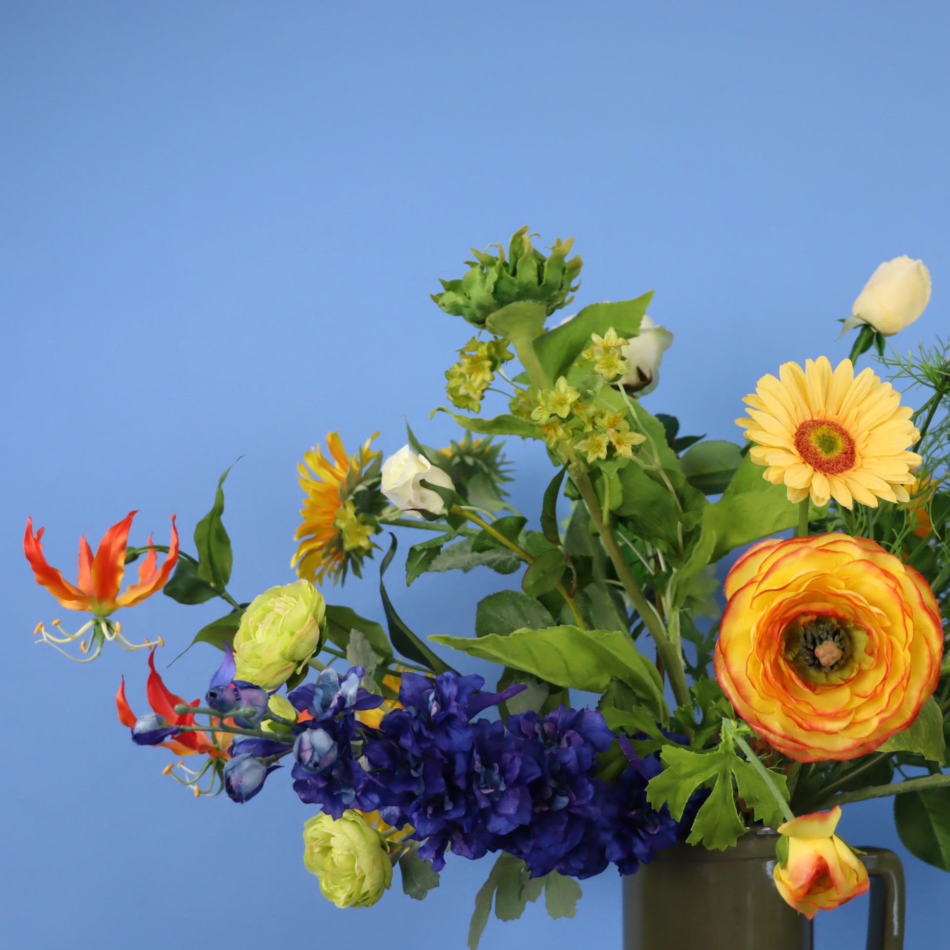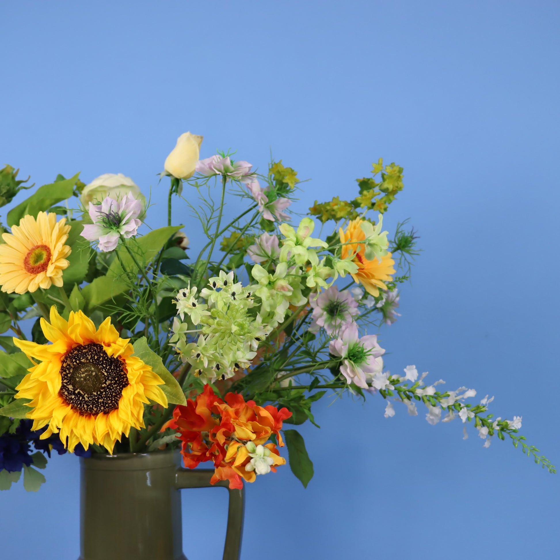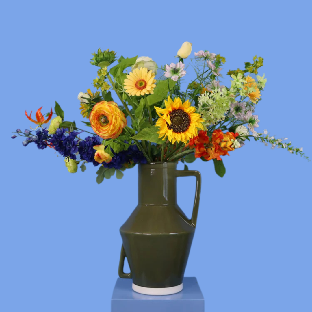 Deze prachtige donkergroene Return to Sender vaas met vrolijke zonnebloemen en diverse andere oranje, gele en blauwe bloemen.