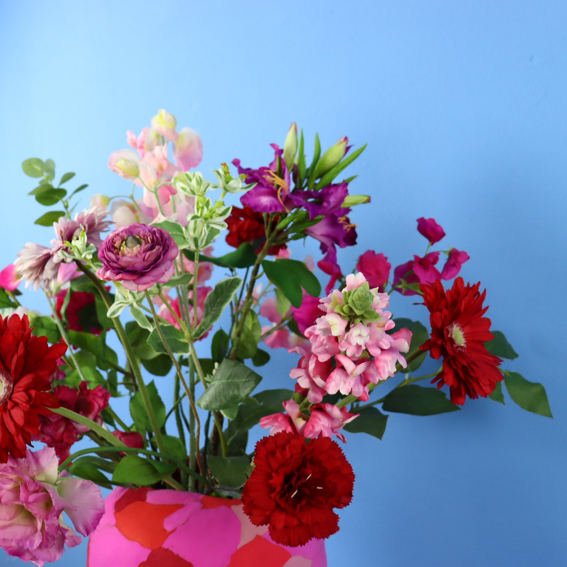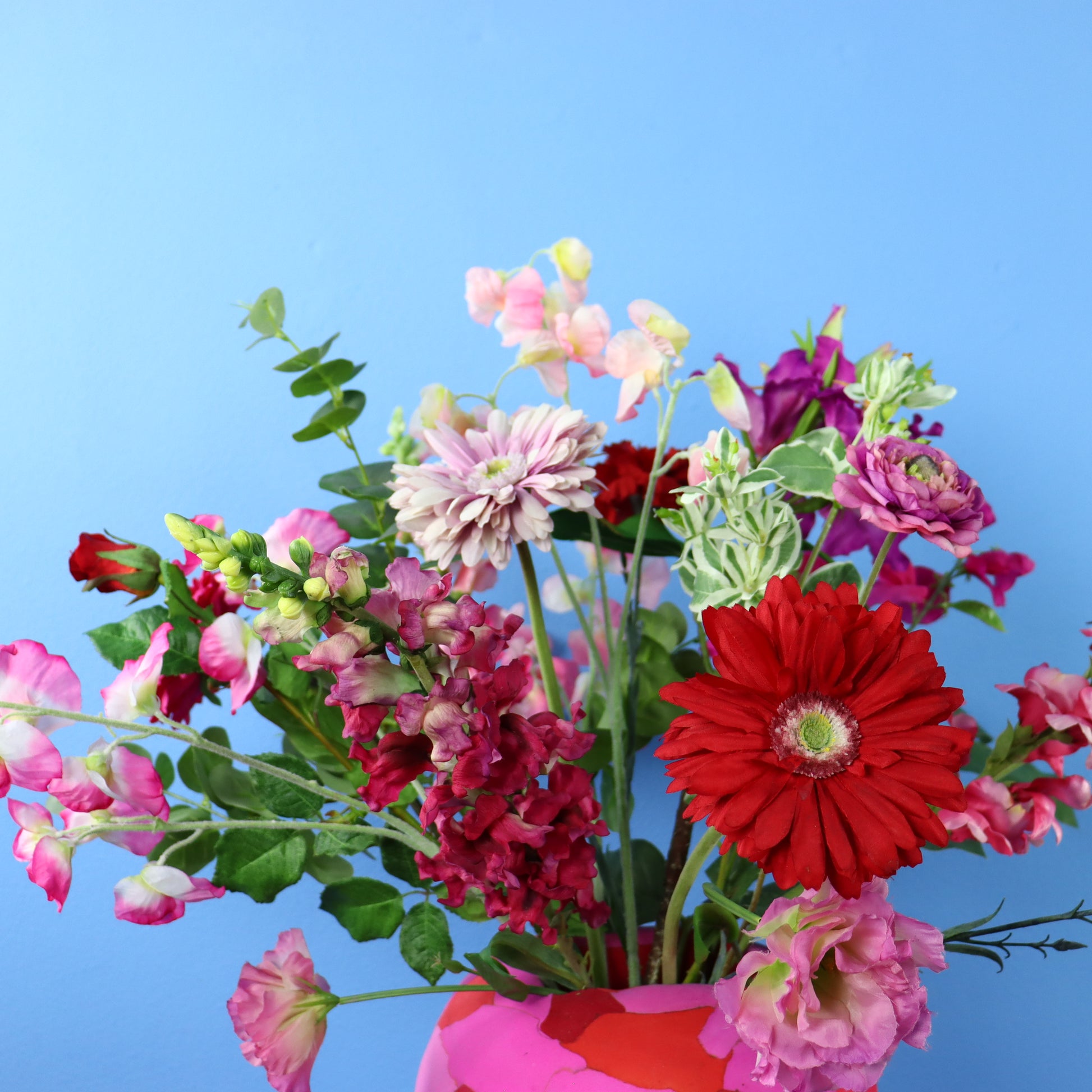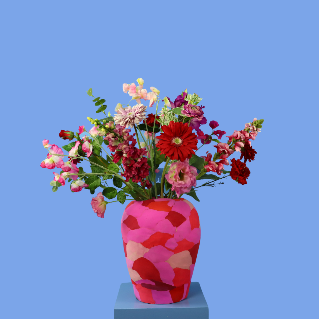 Dit is een Ocean Sole vaas. Door gebruik te maken van gerecyclede flip-flops die zijn verzameld in ontwikkelingslanden, draagt deze Ocean Sole vaas bij aan het creëren van werkgelegenheid in Kenia. Deze speciale vaas komt met een bos blijvende roze, paarse en rode bloemen.