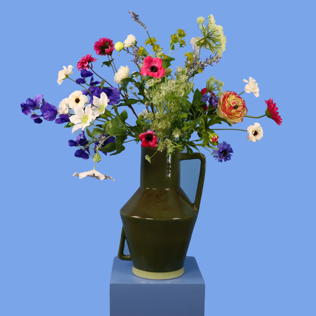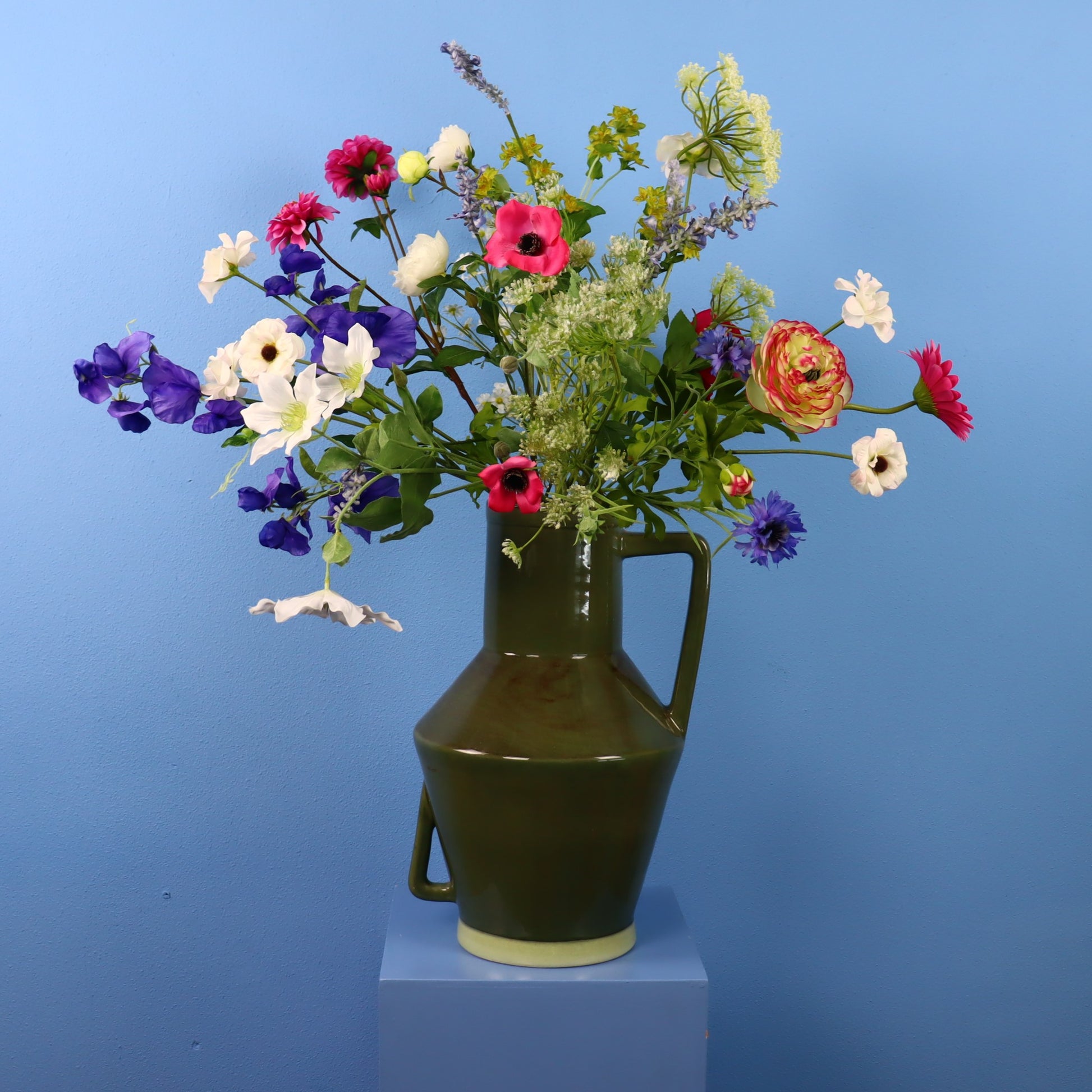 Deze donkergroene Return to Sender vaas is gevuld met een vrolijk veldboeket. Haal de lente in huis met deze prachtige blijvende bloemen!