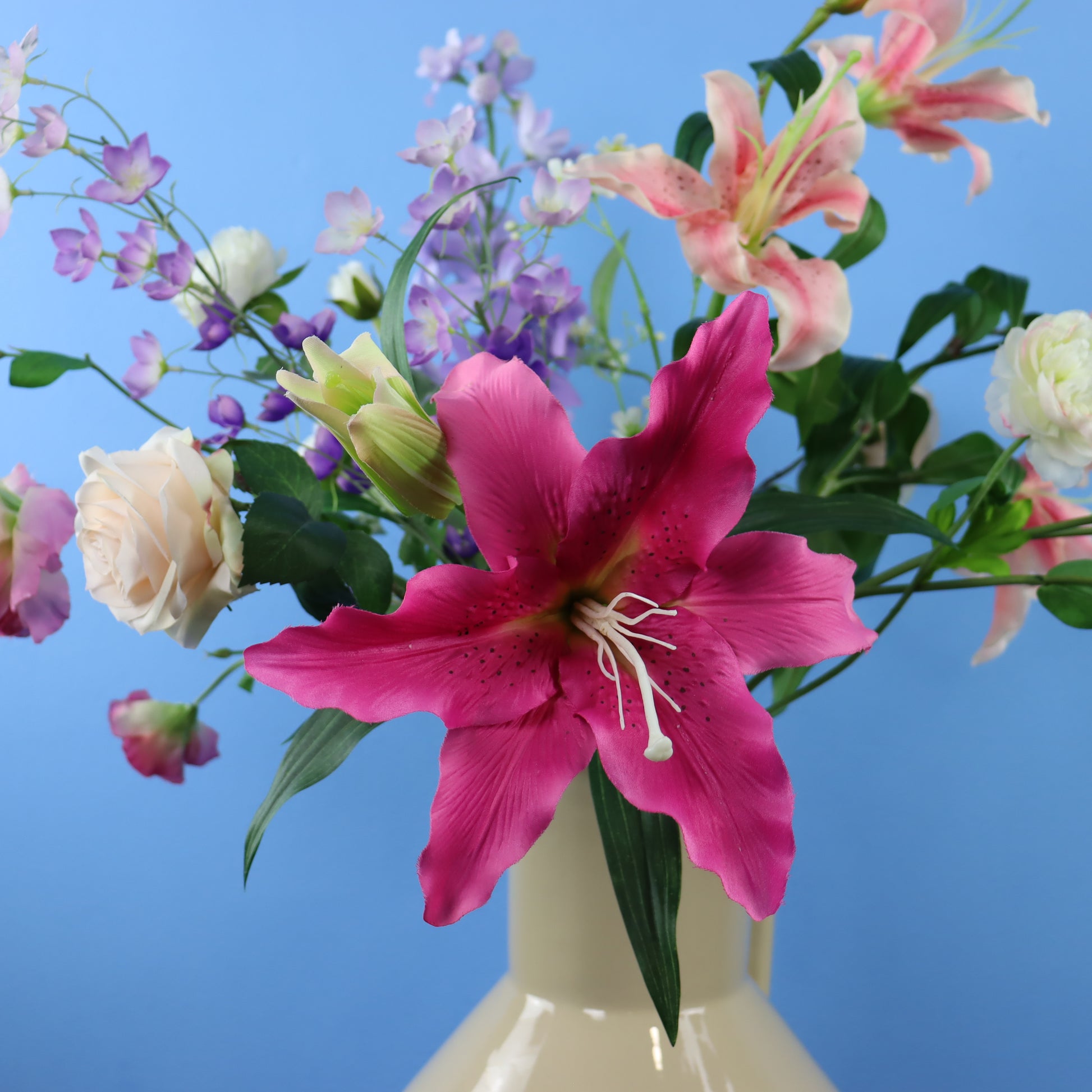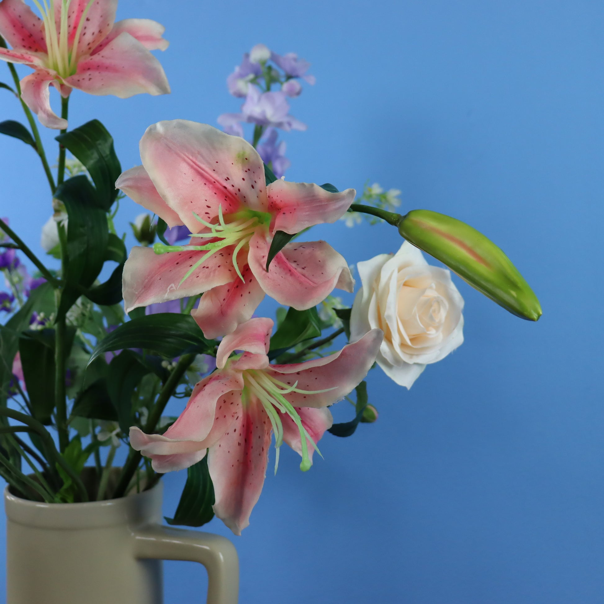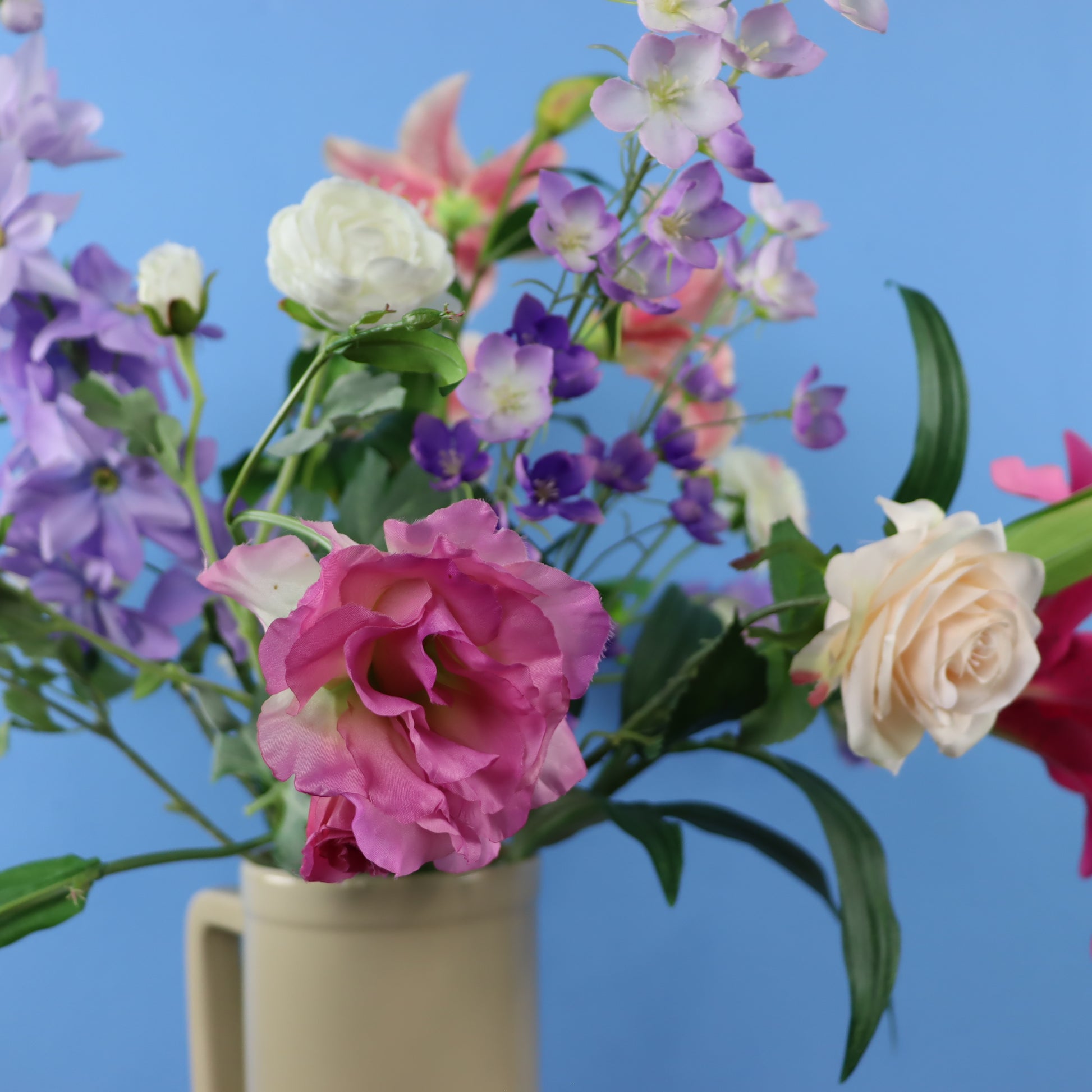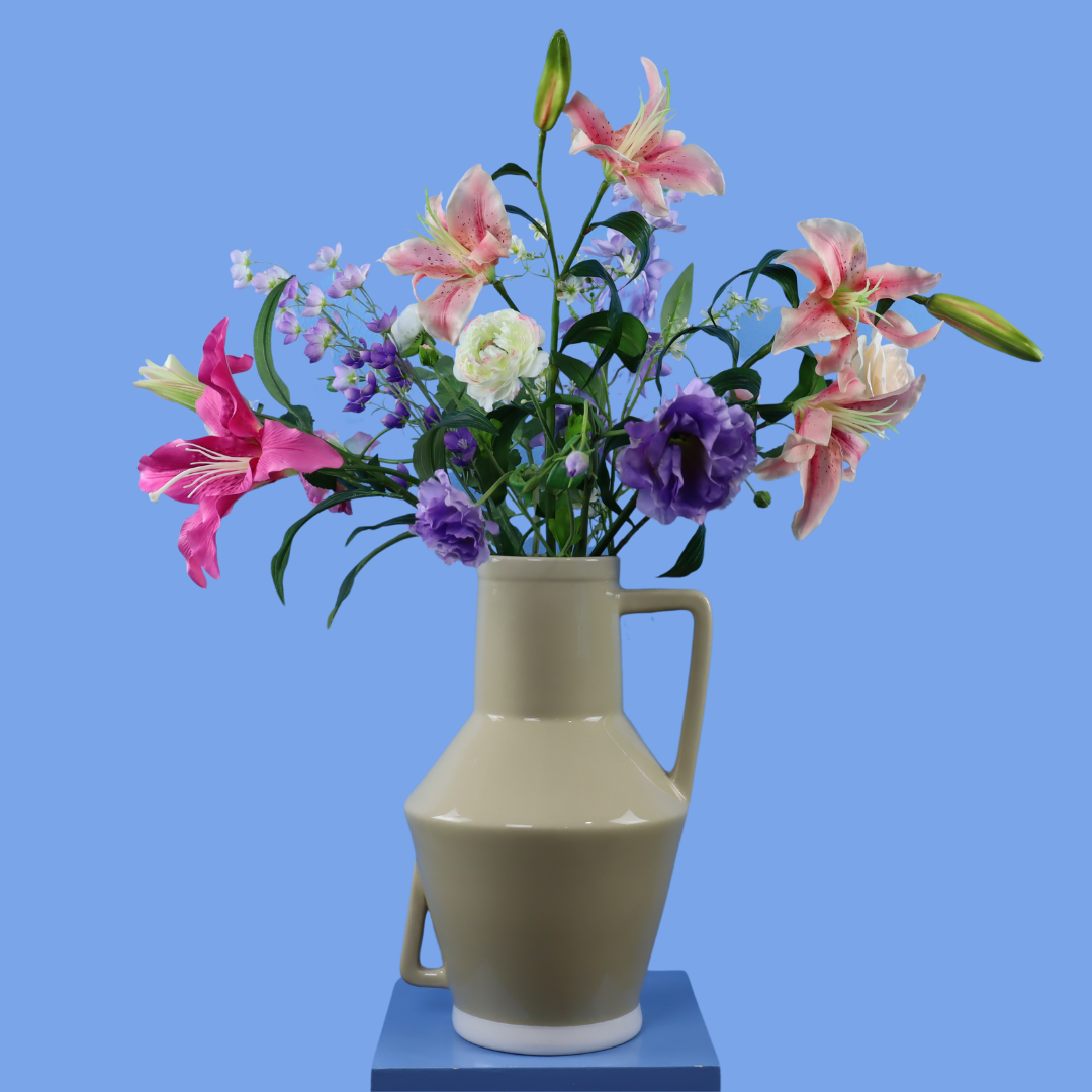 Prachtige beige Return to Sender vaas met blijvende bloemen.