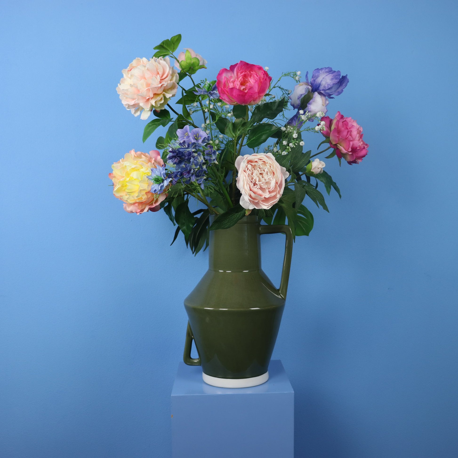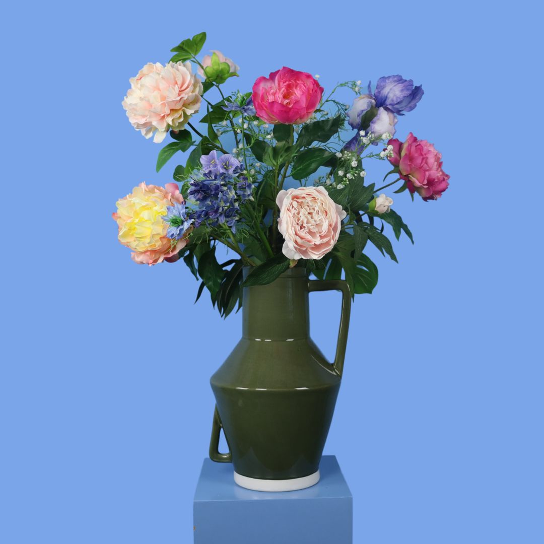 Deze donkergroene Return to Sender vaas is gevuld met een kleurrijk boeket van blijvende bloemen.
