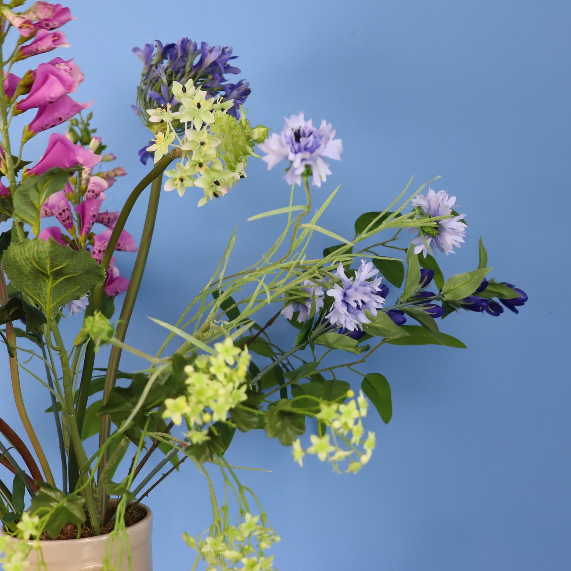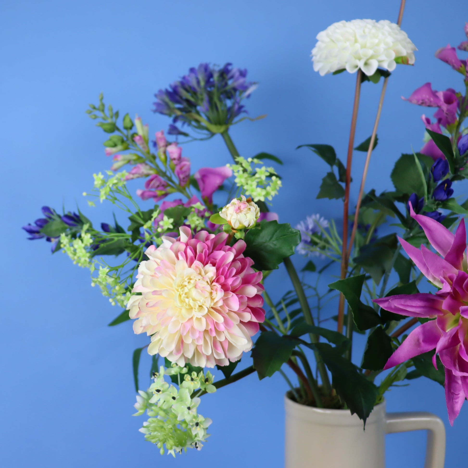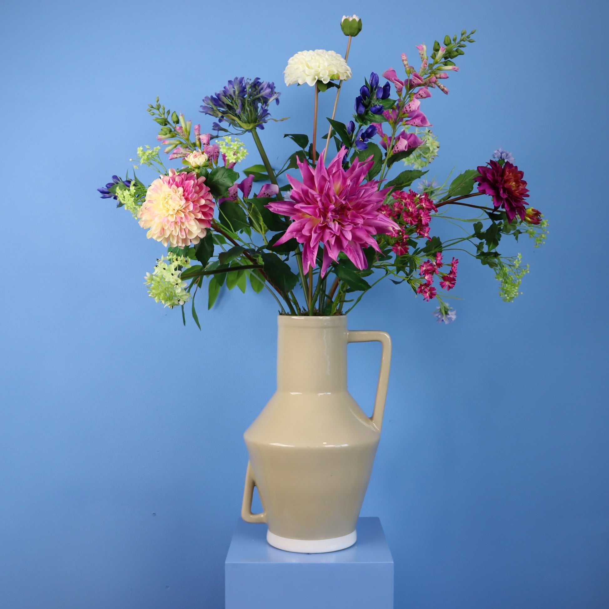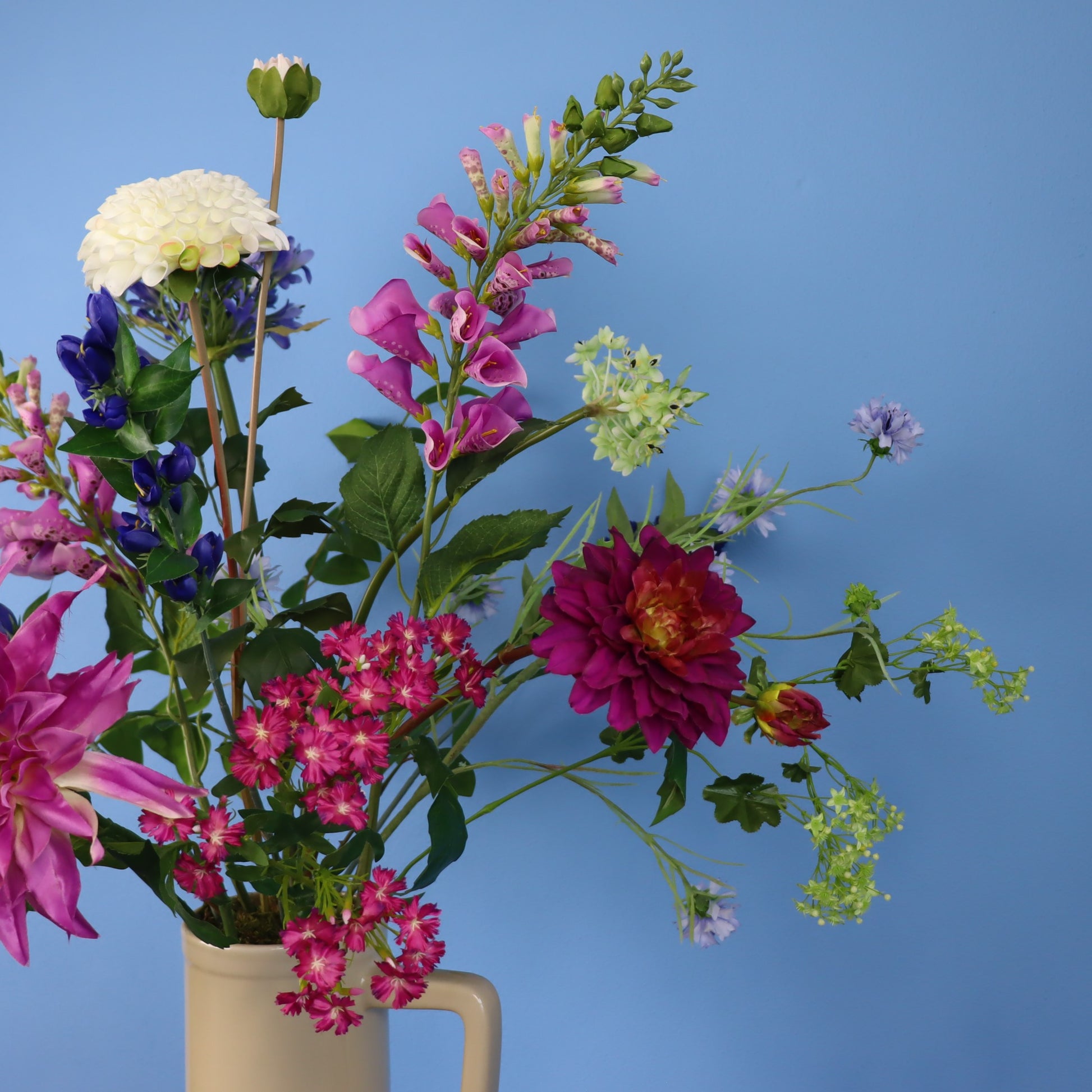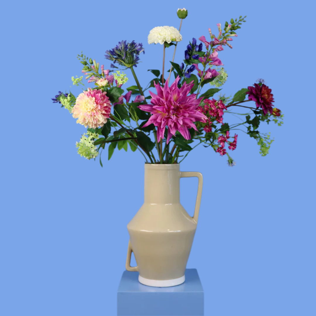 Return to Sender vaas met een klassieke bos bloemen in roze, paars en blauw.