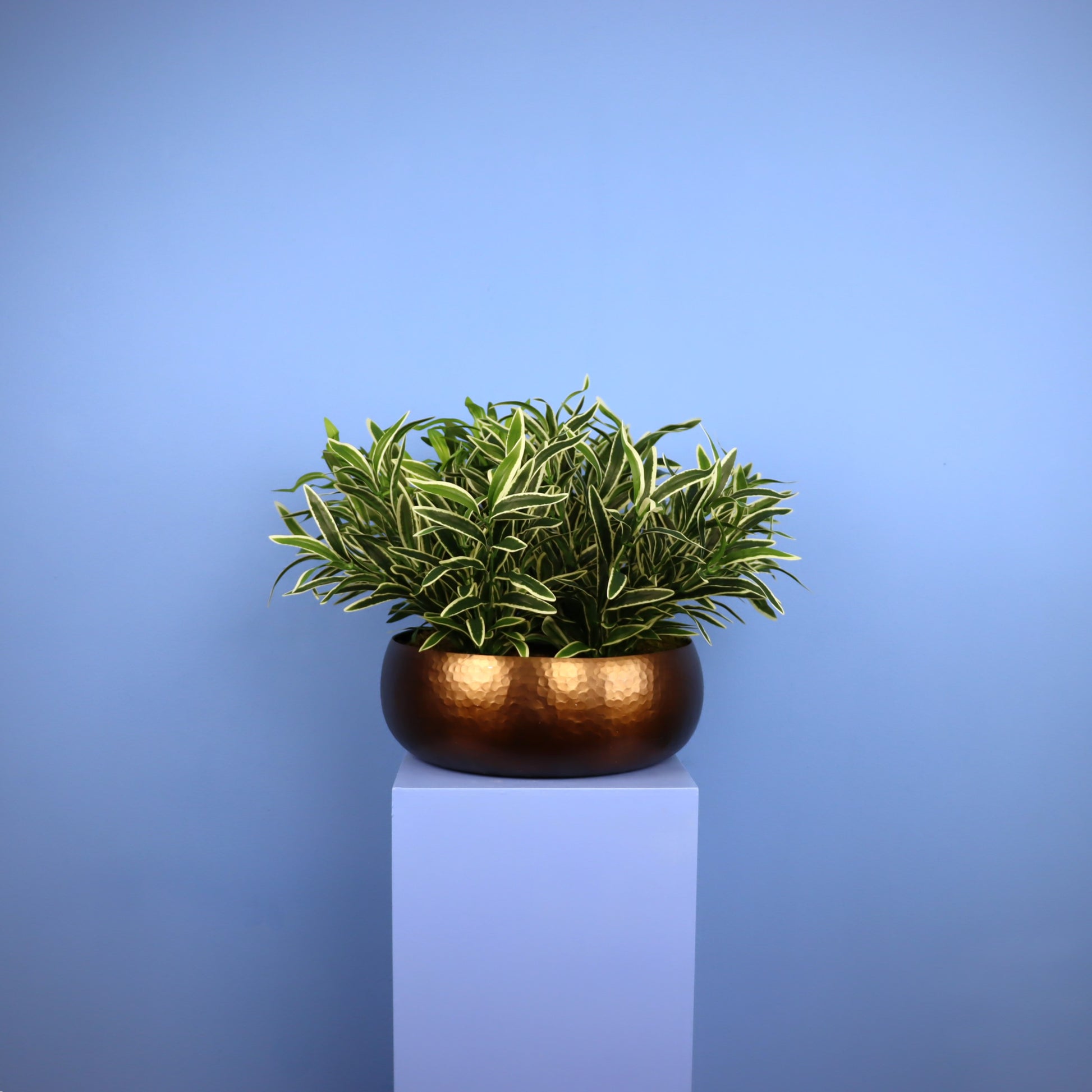 Koperen bloembak met plant.